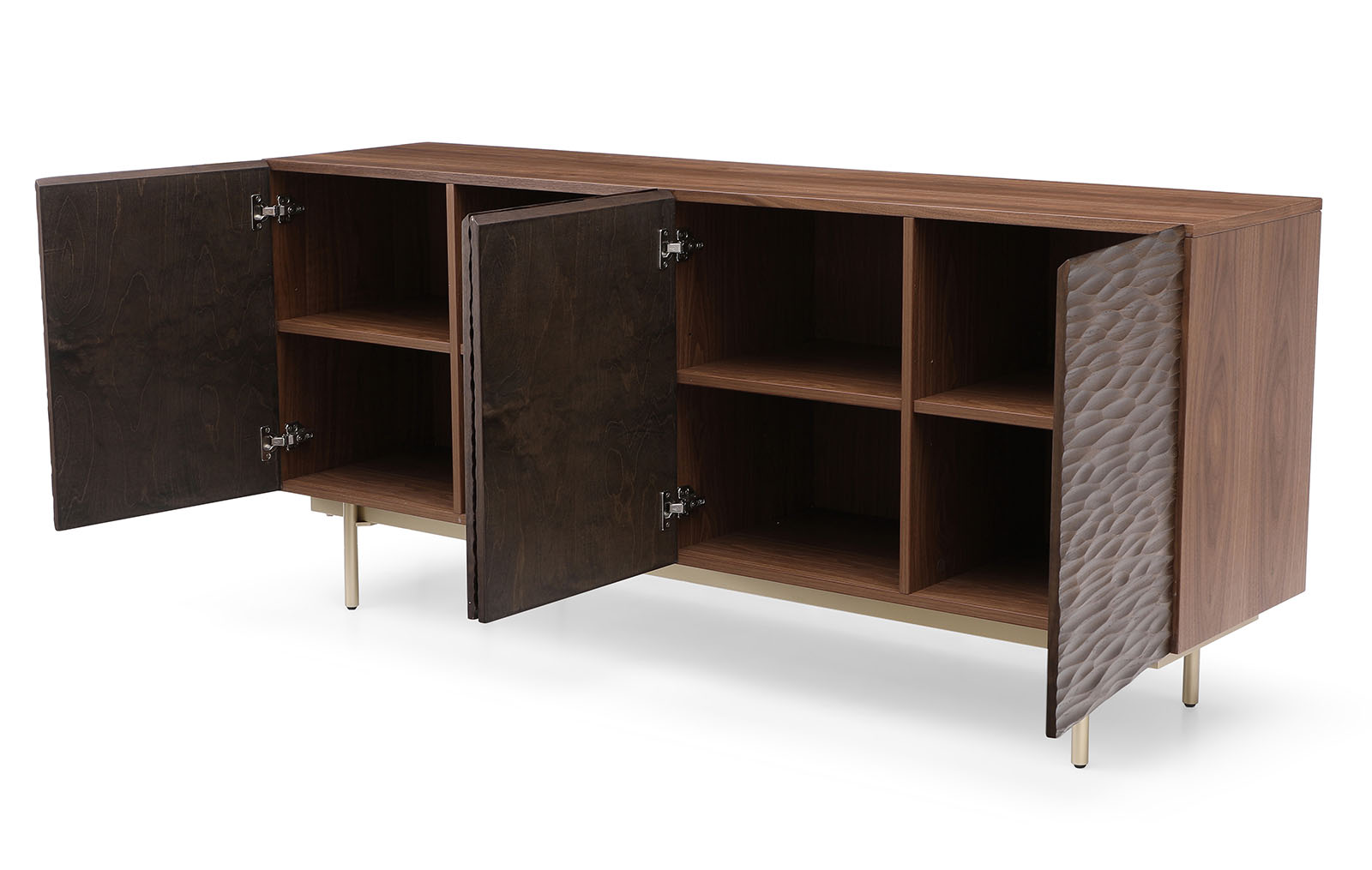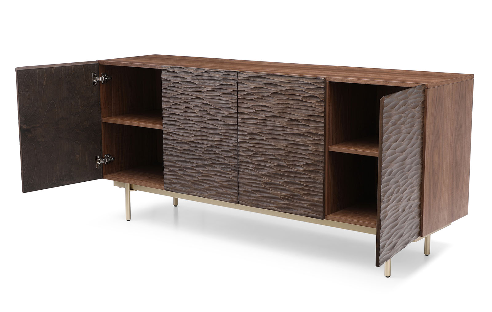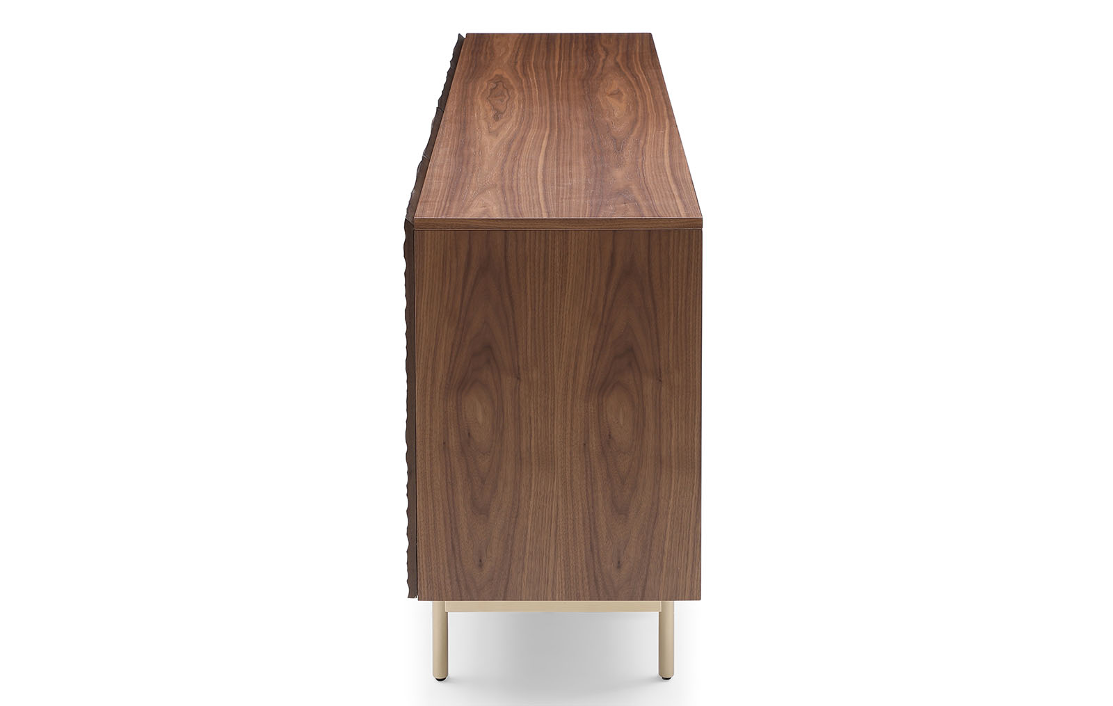 Корпус буфета выполнен из MDF в натуральном шпоне ореха и декорирован фактурными фасадами с покрытием из резного дерева (массив дуба, тонированный в оттенок ореха).