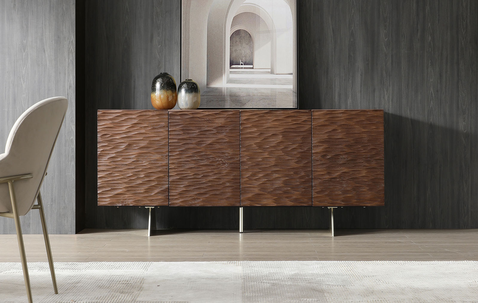 Буфет имеет четыре дверцы, за которыми скрываются вместительные отделения с полочками, обеспечивая удобное хранение вещей и позволяя поддерживать порядок в пространстве.