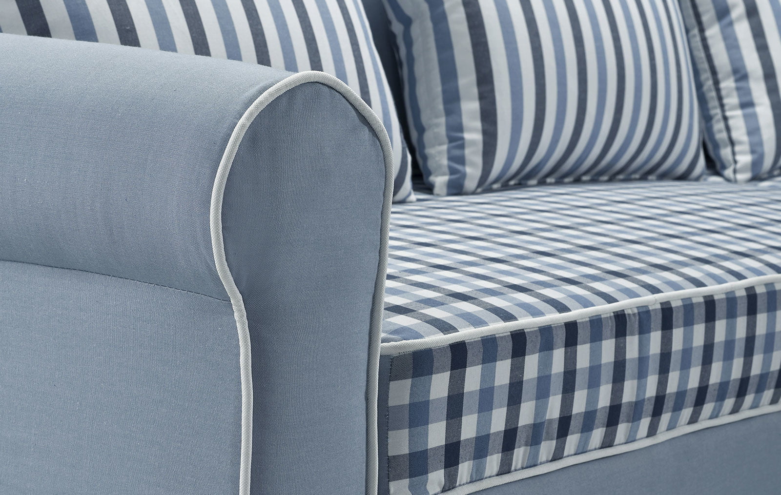 Диван привлекает внимание необычным, но стильным сочетанием цветов и фактур ткани: нежная голубовато-серая основа, серая окантовка, клетчатое сидение и полосатые подушки.