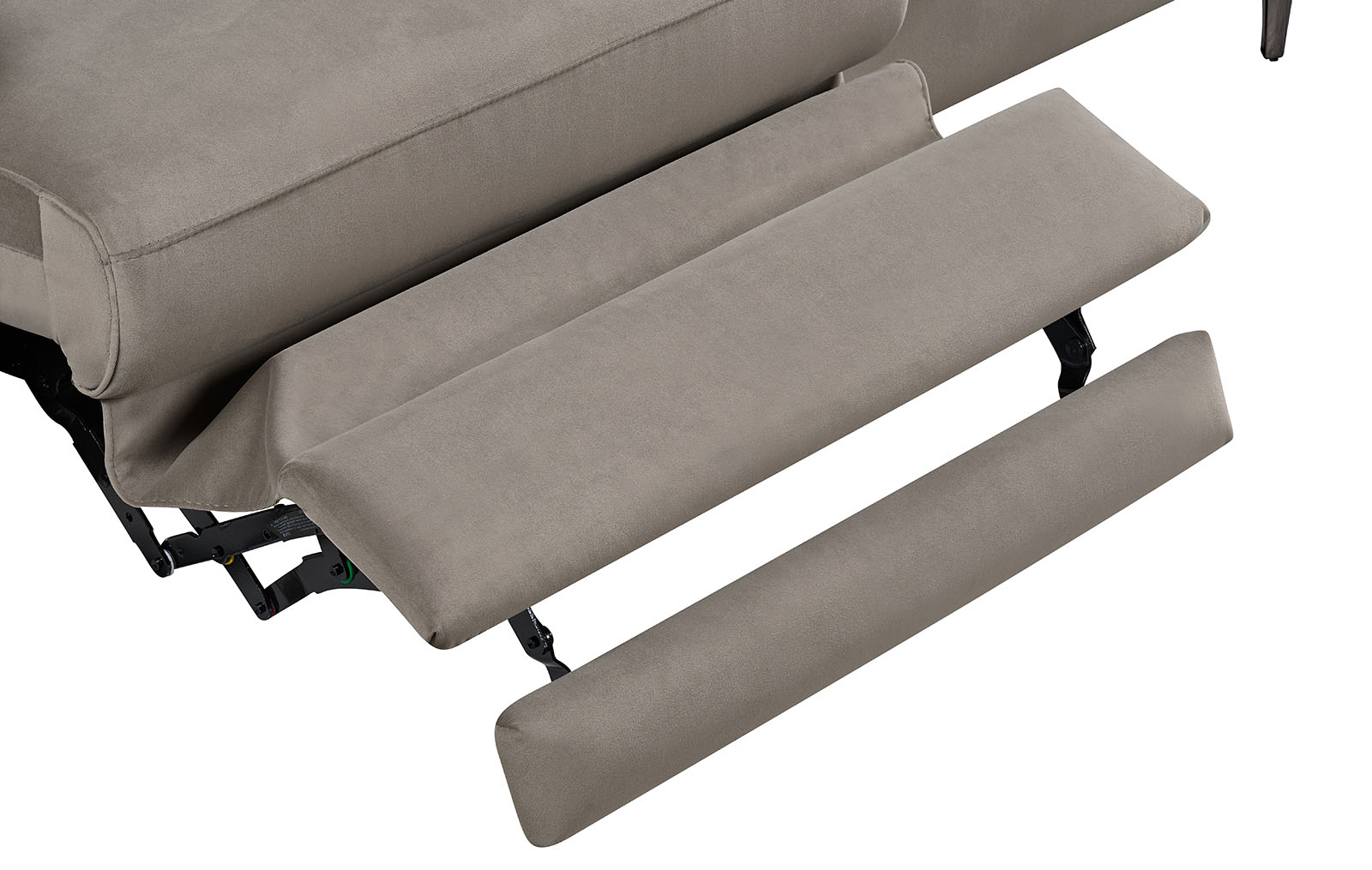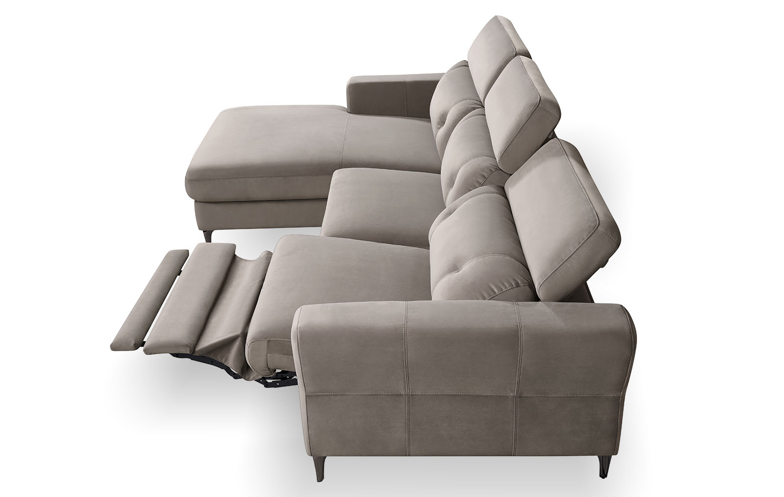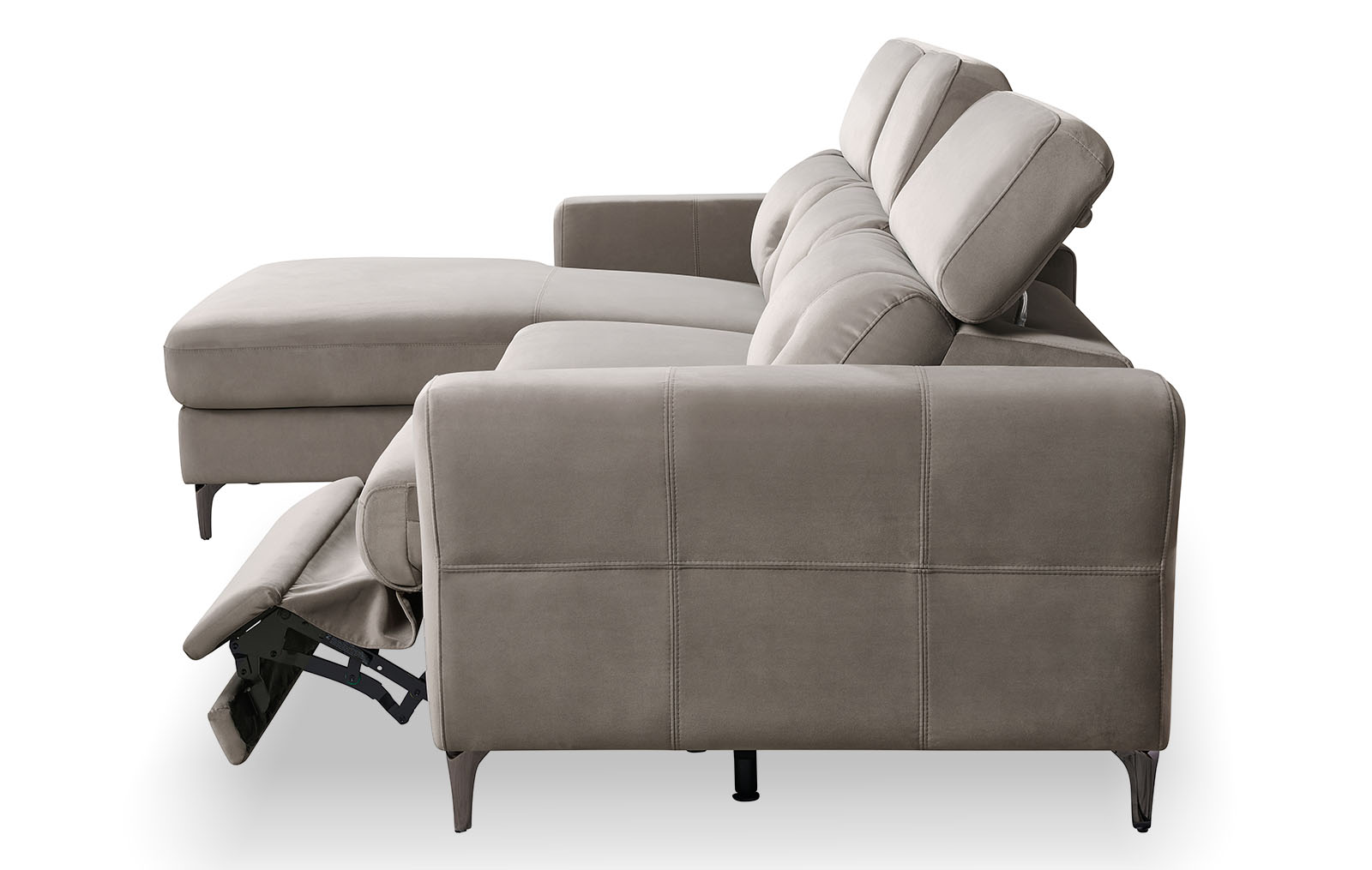 Модуль-реклайнер позволяет опустить спинку и приподнять нижнюю часть дивана в качестве подставки для ног для большего комфорта. Диван оснащен электроприводом. Управление с помощью кнопок на подлокотнике.