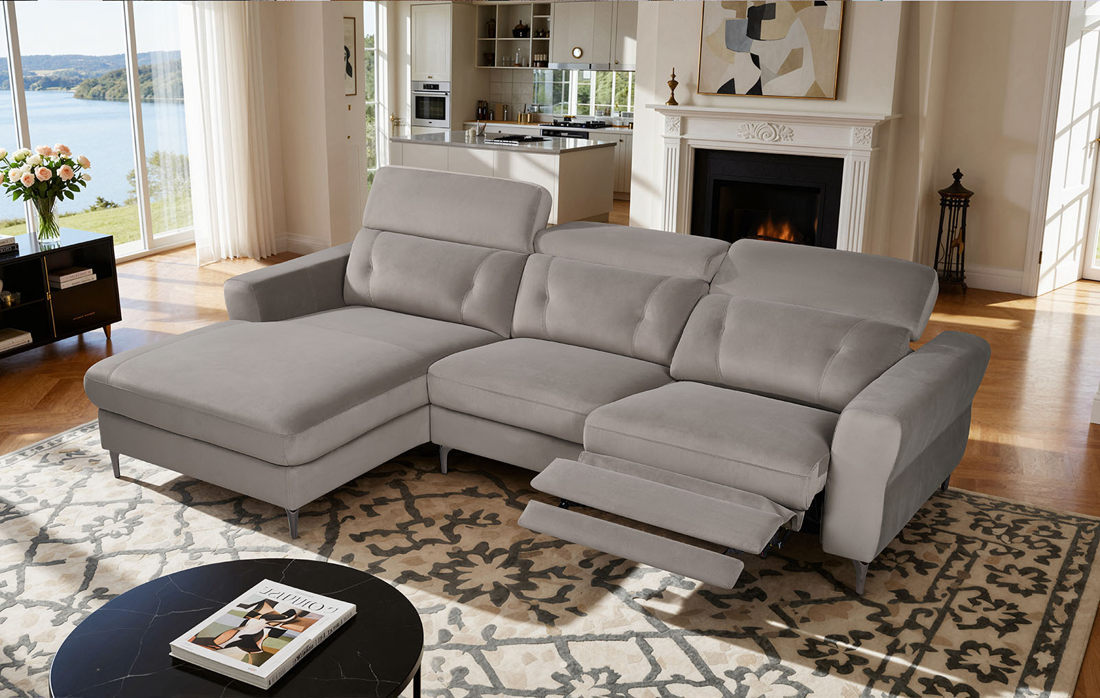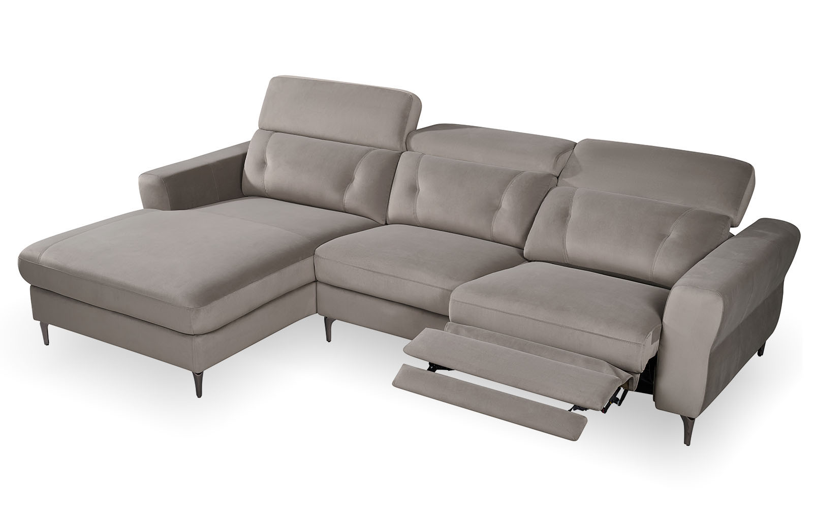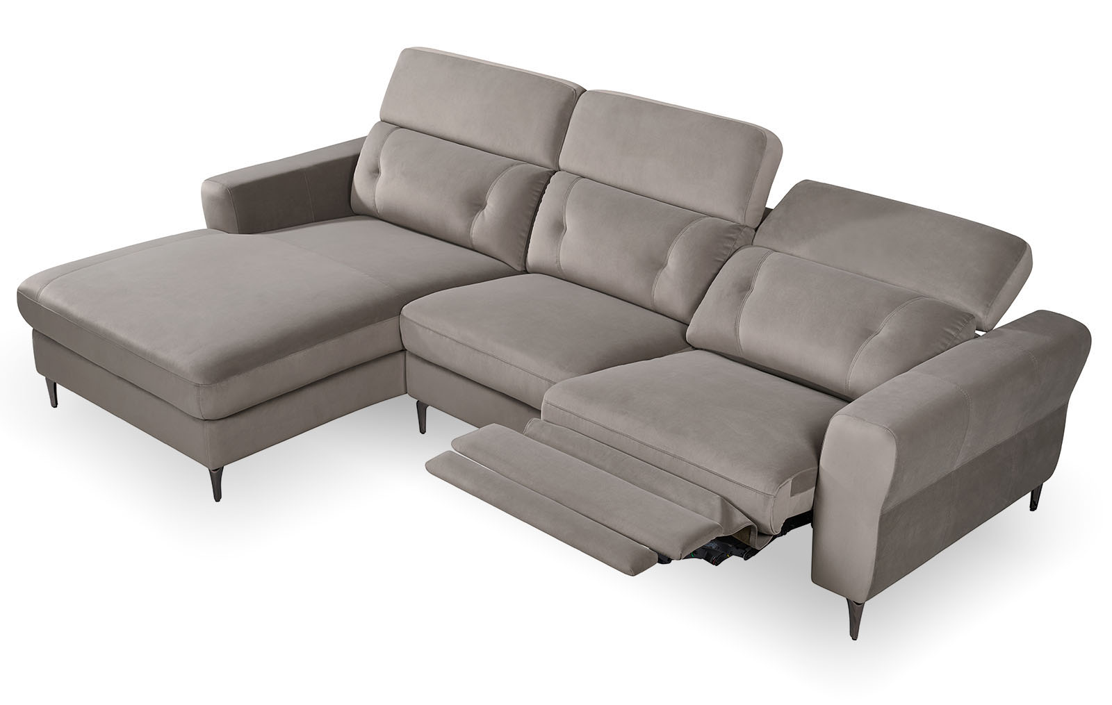 Модуль-реклайнер позволяет опустить спинку и приподнять нижнюю часть дивана в качестве подставки для ног для большего комфорта. Диван оснащен электроприводом. Управление с помощью кнопок на подлокотнике.