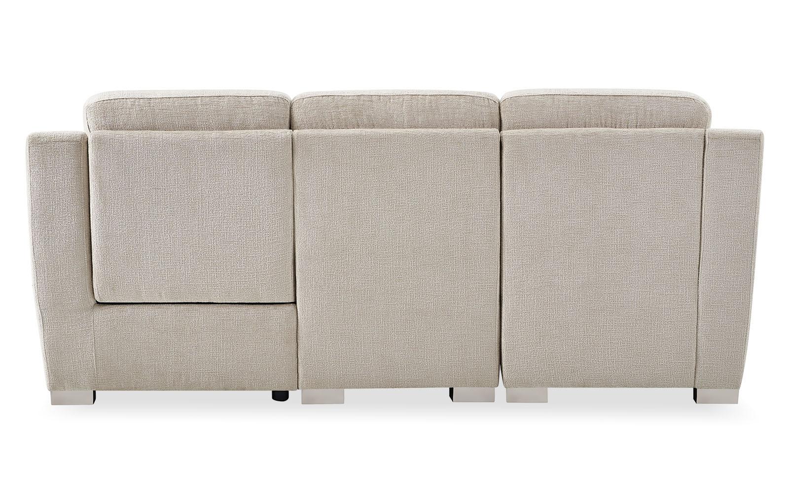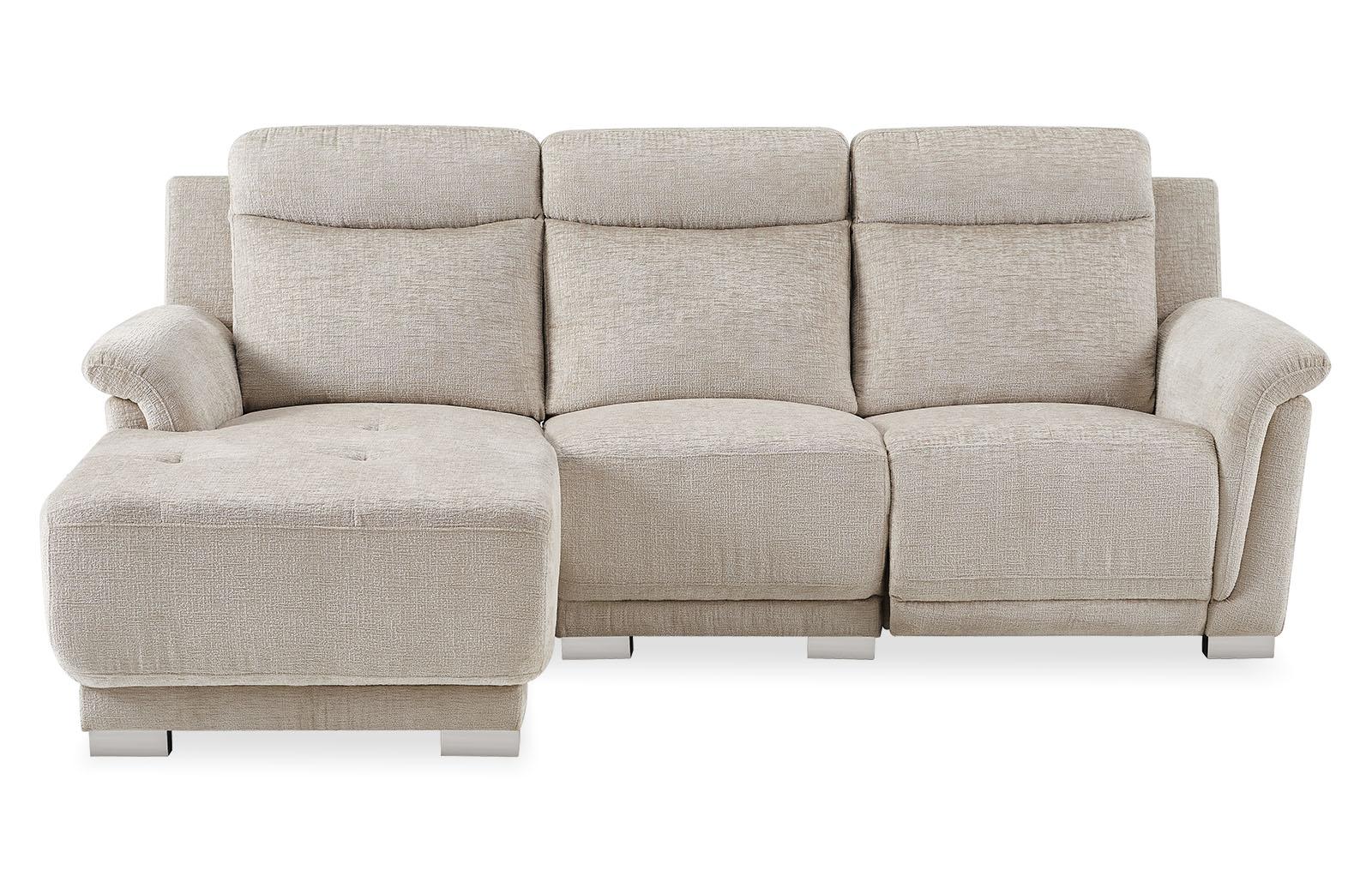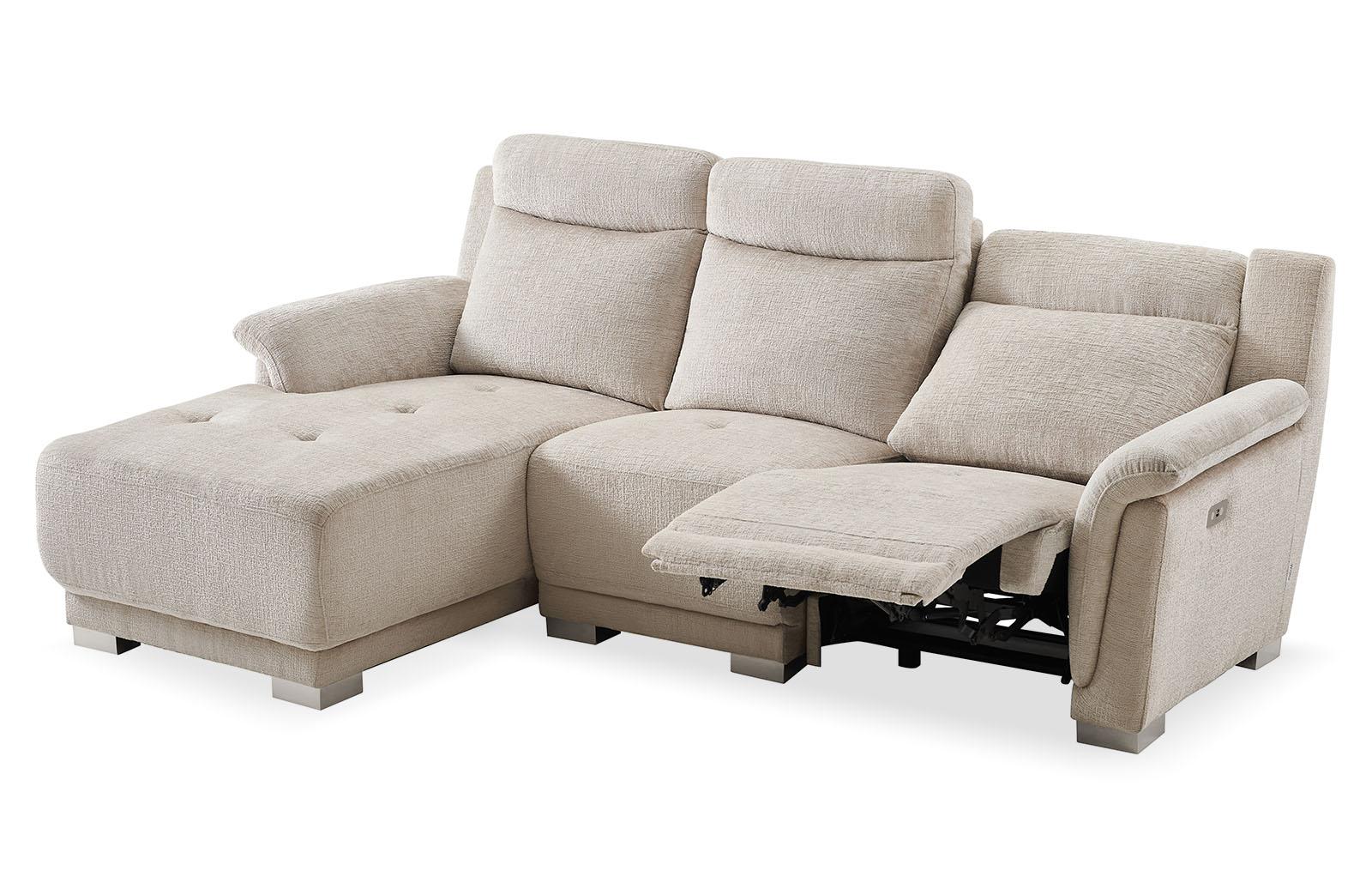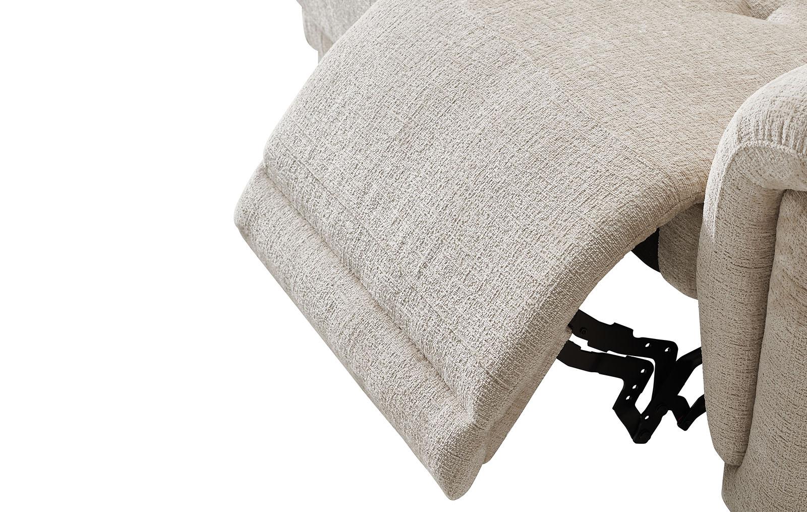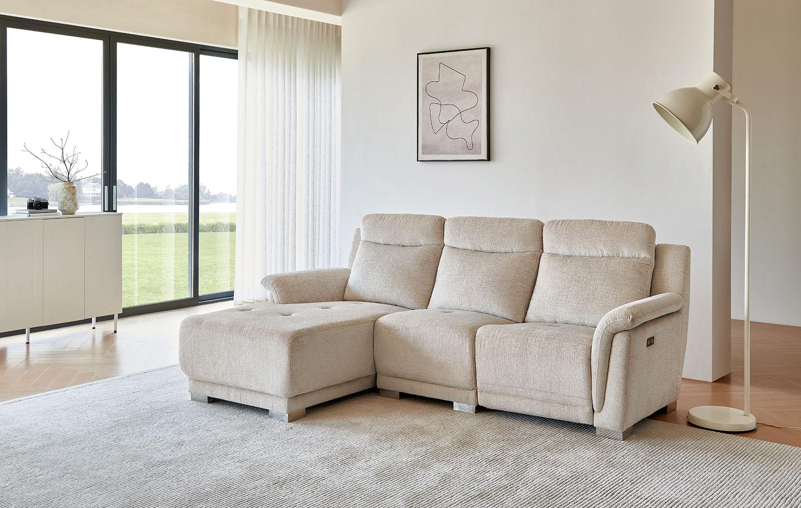 Модуль-реклайнер позволяет опустить спинку и приподнять нижнюю часть дивана в качестве подставки для ног для большего комфорта. Диван оснащен электроприводом. Управление с помощью кнопок на подлокотнике.