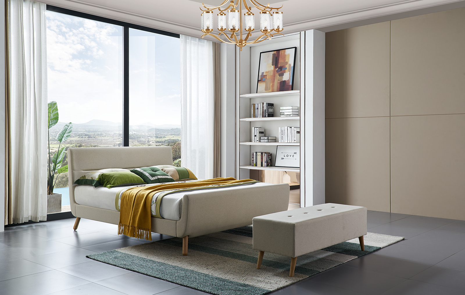 Комплект спальной мебели в стиле Mid Century Modern. Комплект Borneo состоит из кровати, банкетки, двух прикроватных тумб и комода. Вы можете регулировать количество предметов для Вашего комплекта в поле заказа справа.