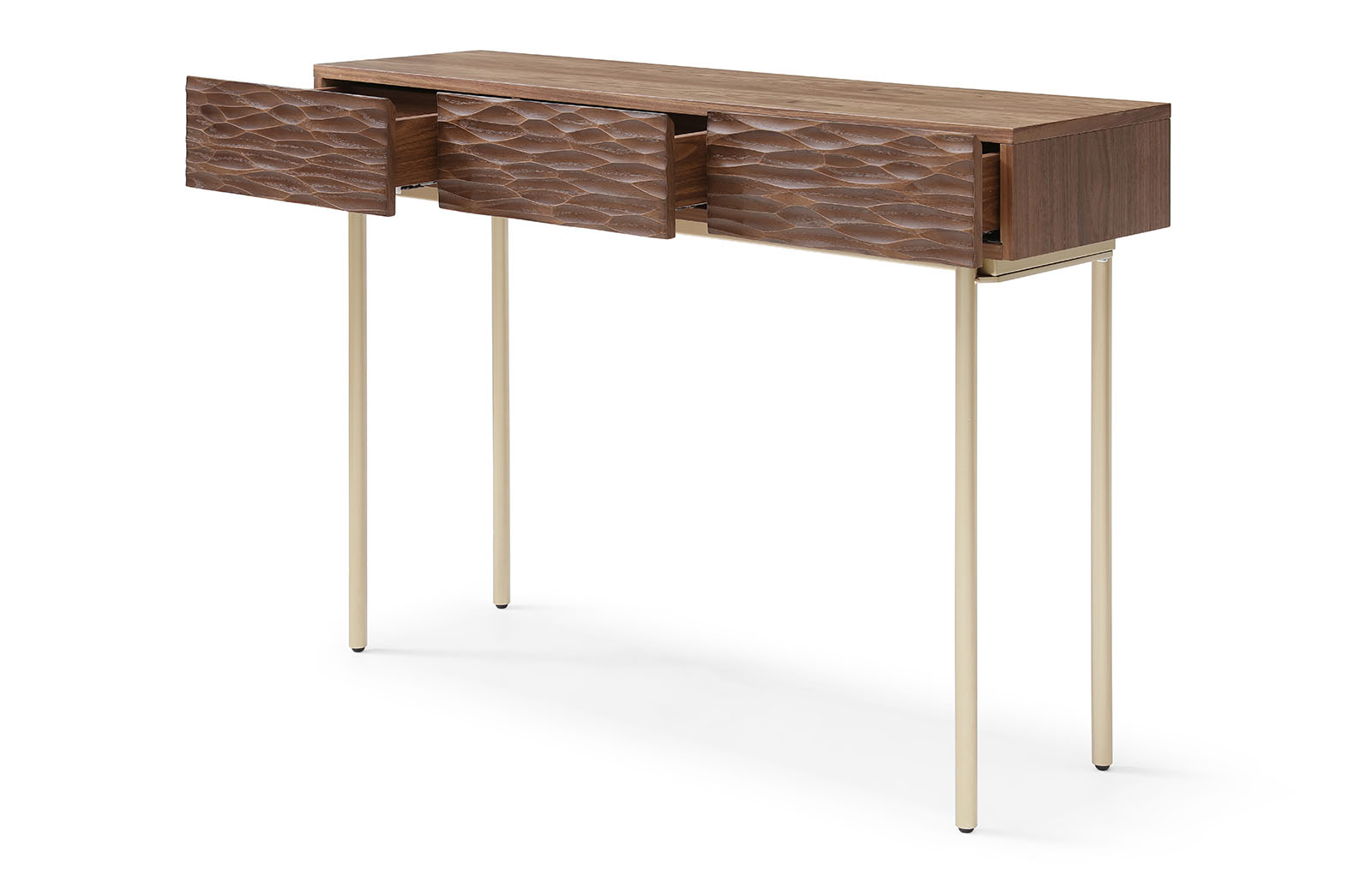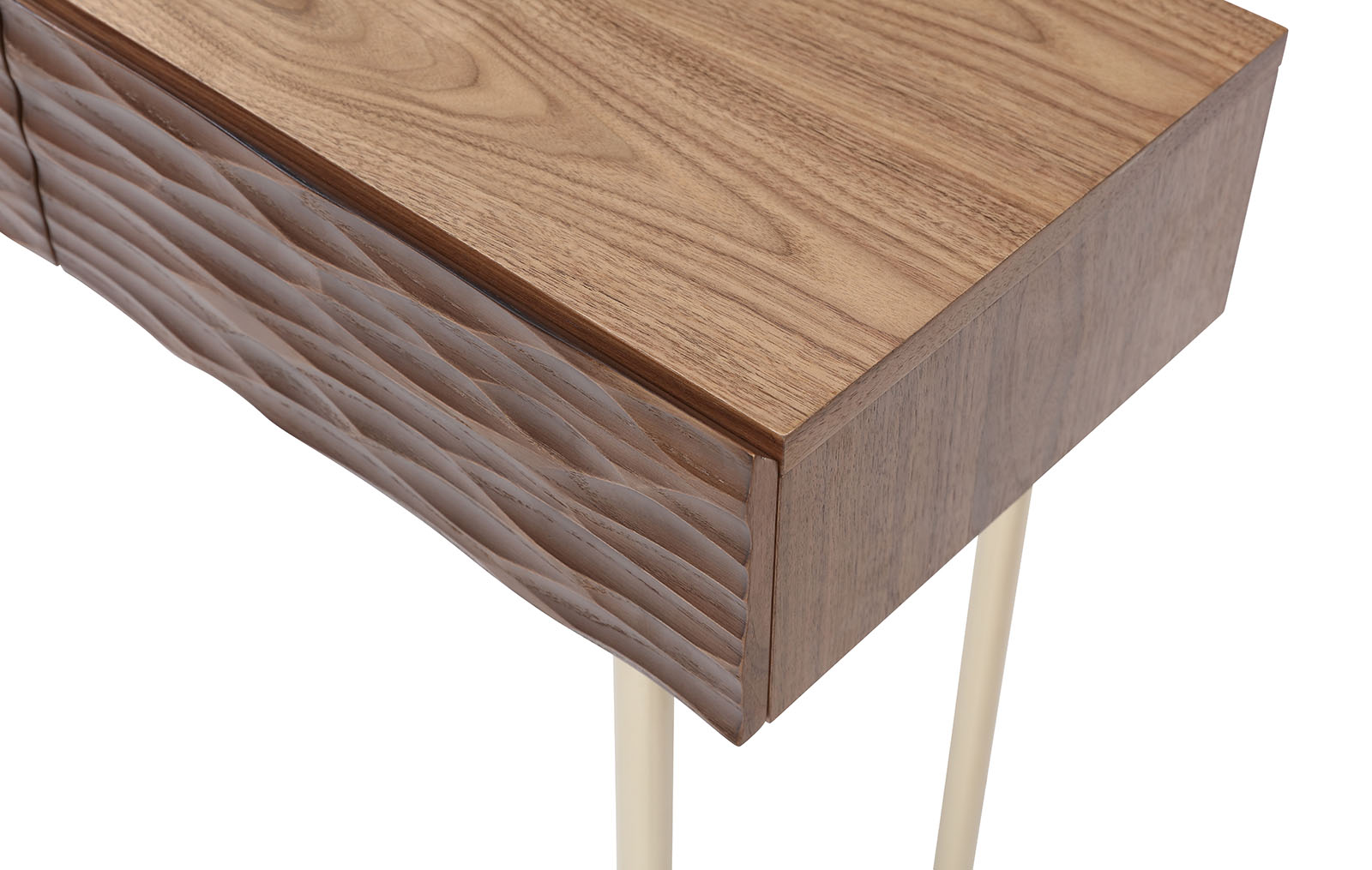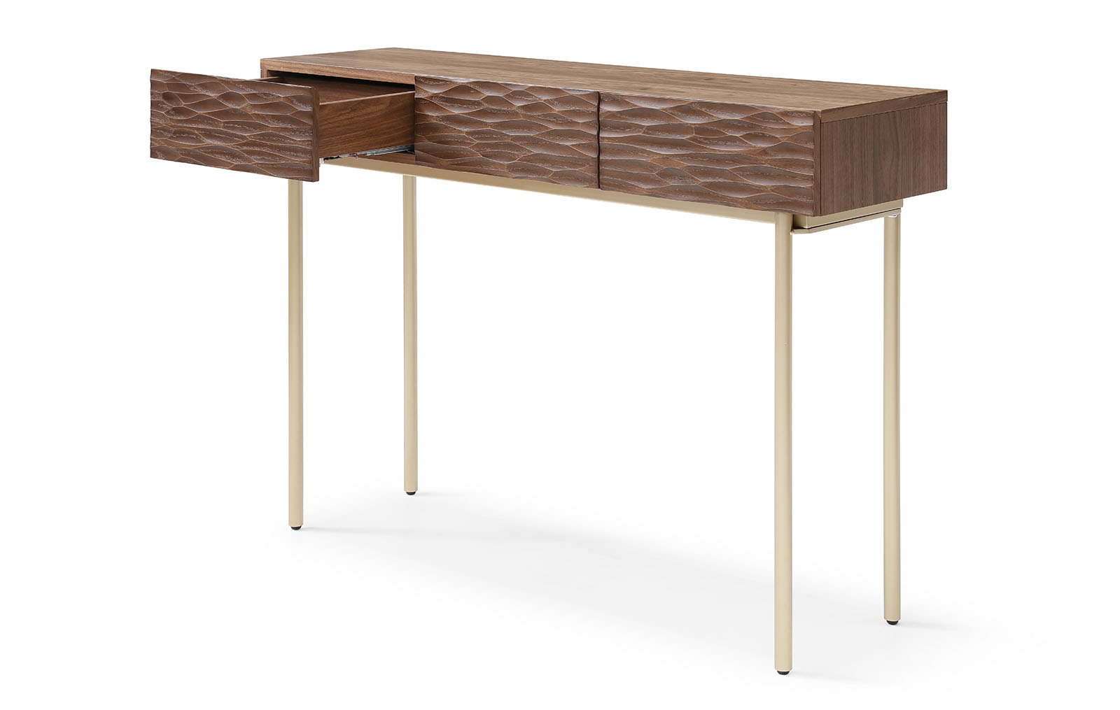 Столешница консоли выполнена из MDF в натуральном шпоне ореха и декорирована фактурными фасадами.