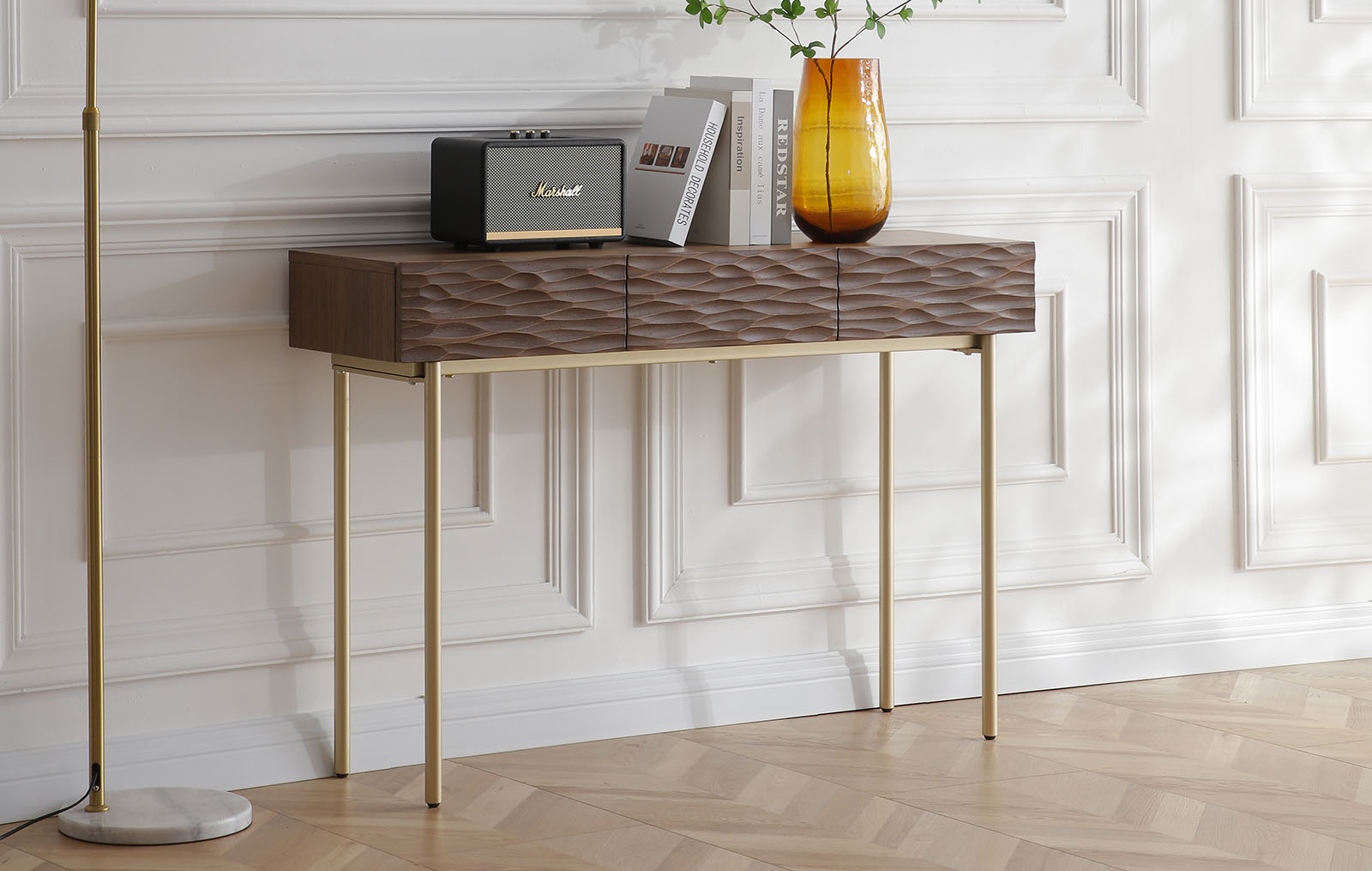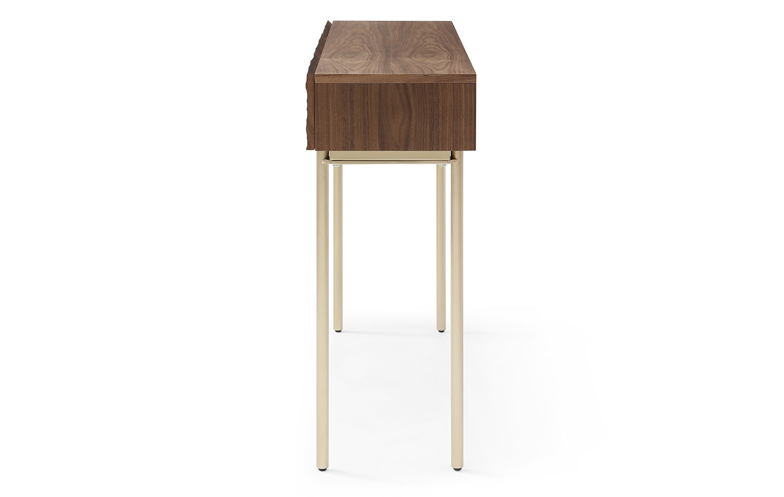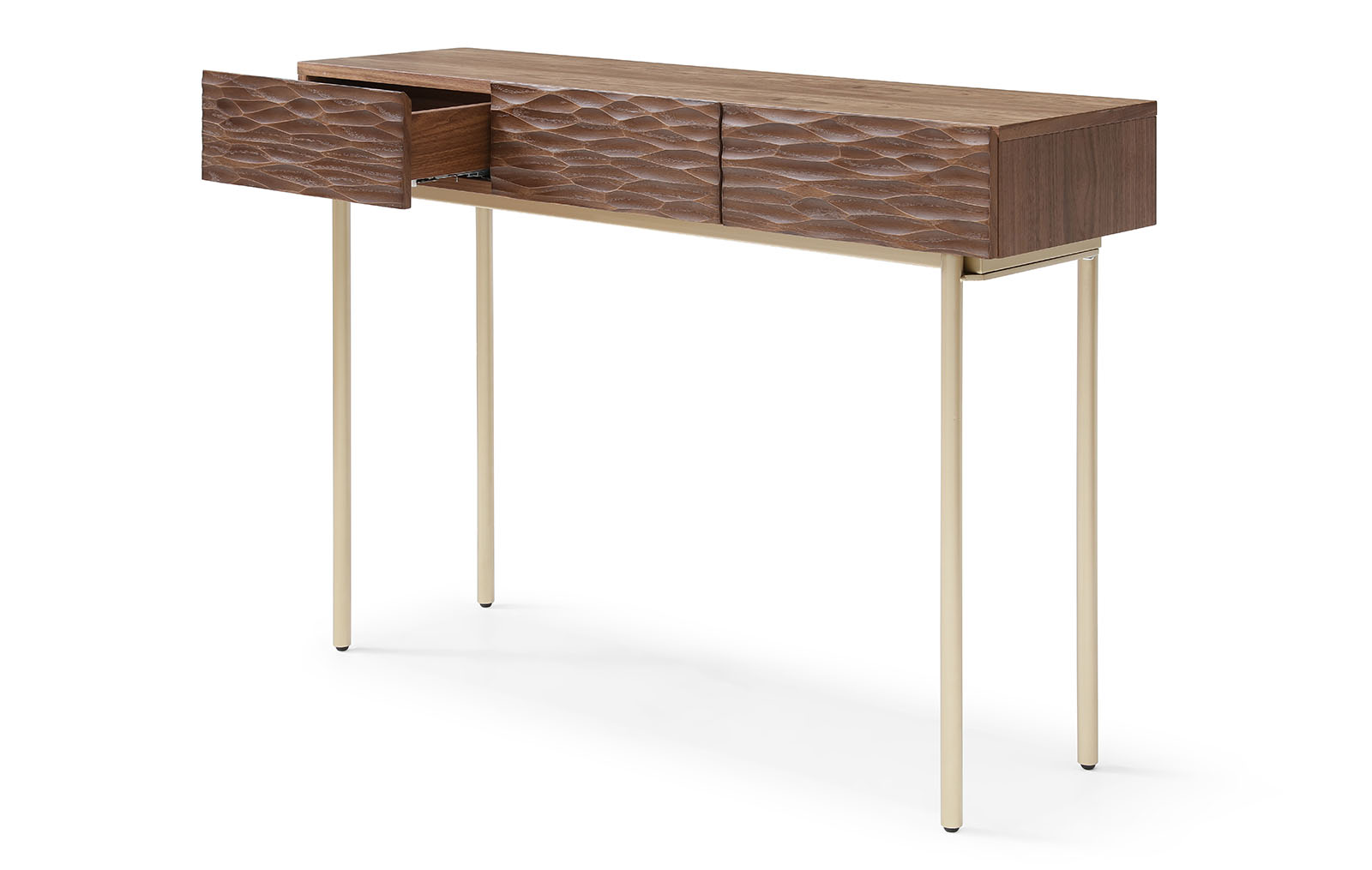 Столешница консоли выполнена из MDF в натуральном шпоне ореха и декорирована фактурными фасадами.