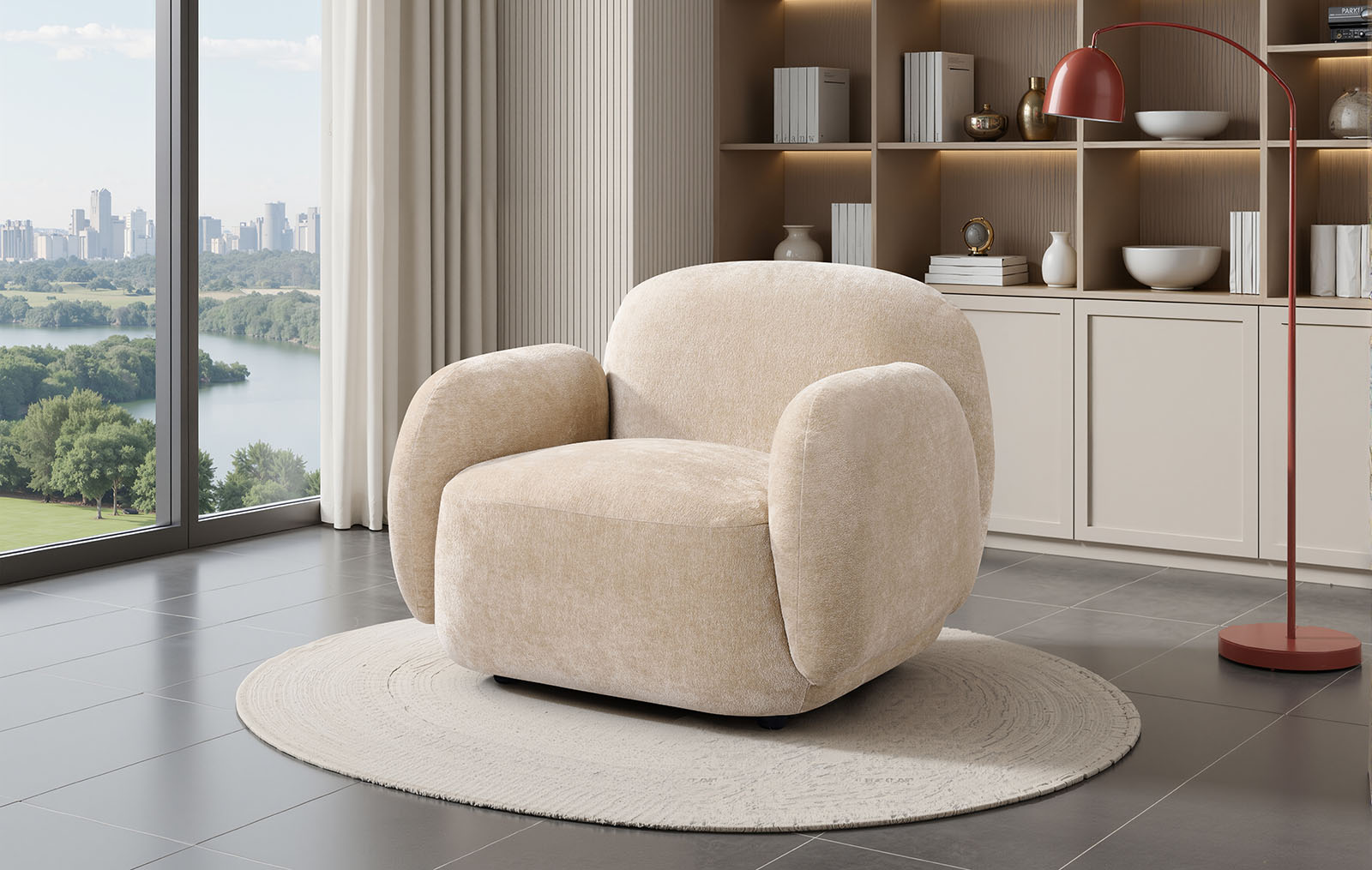Дизайн кресла сочетает в себе уютный облик и лаконичность. Его мягкие линии добавляют пространству расслабленности и гармонии.