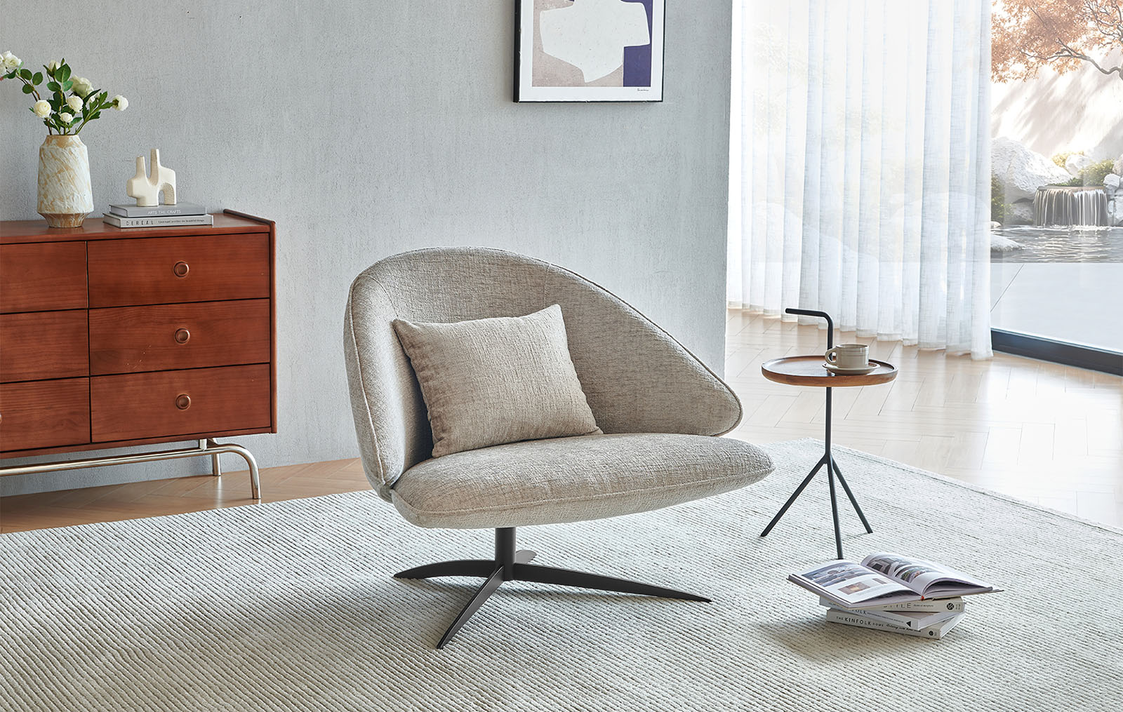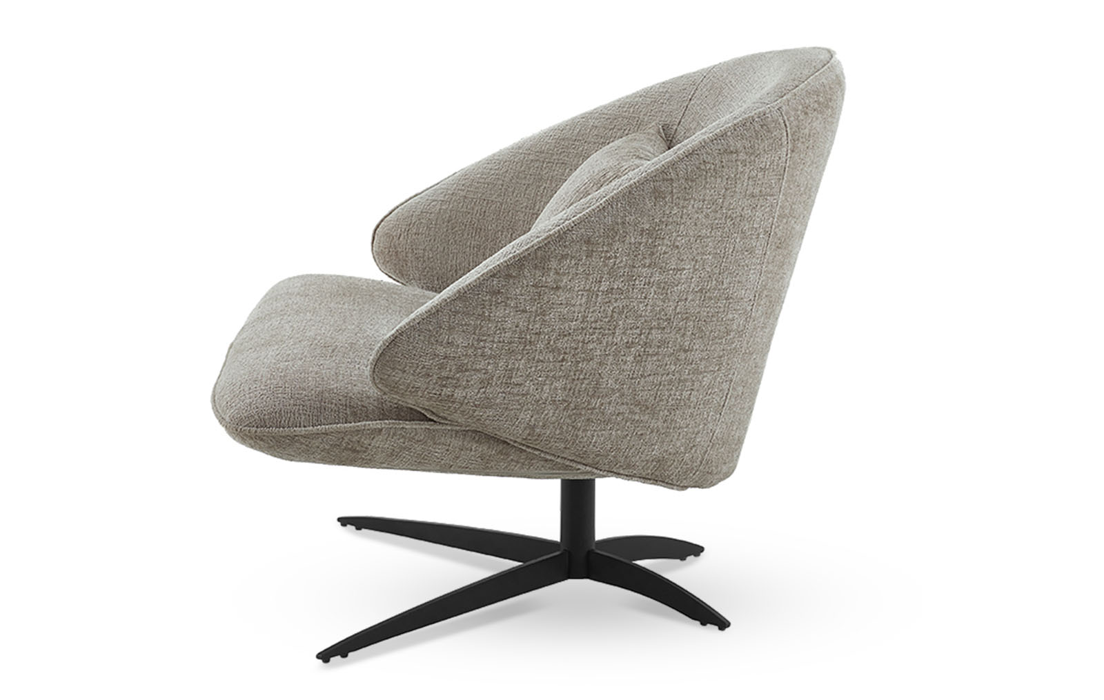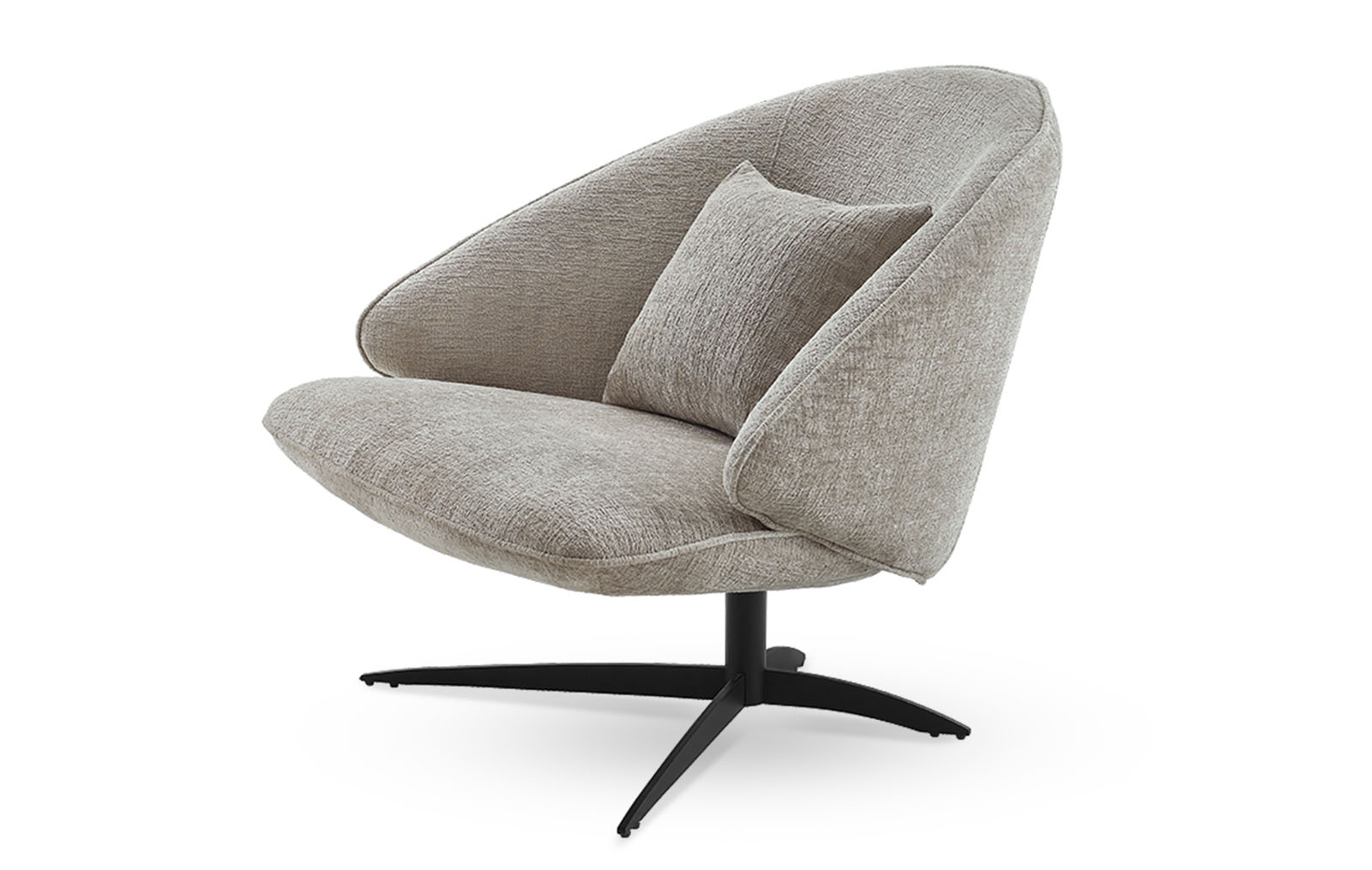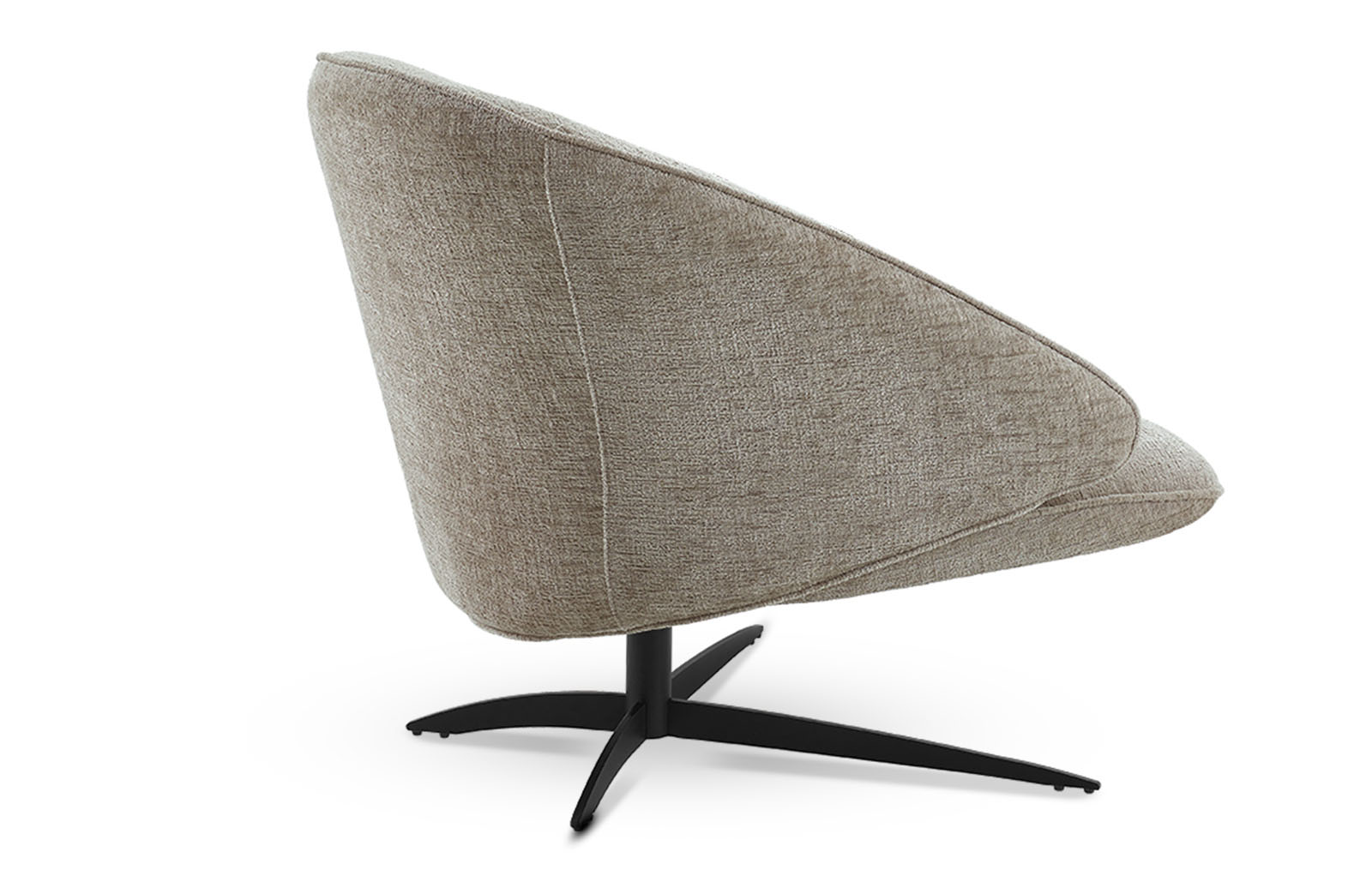 Универсальный серо-бежевый оттенок обивки впишется в различные цветовые схемы гостиных и лаунж зон. Ножка на крестообразном основании - из черного металла.