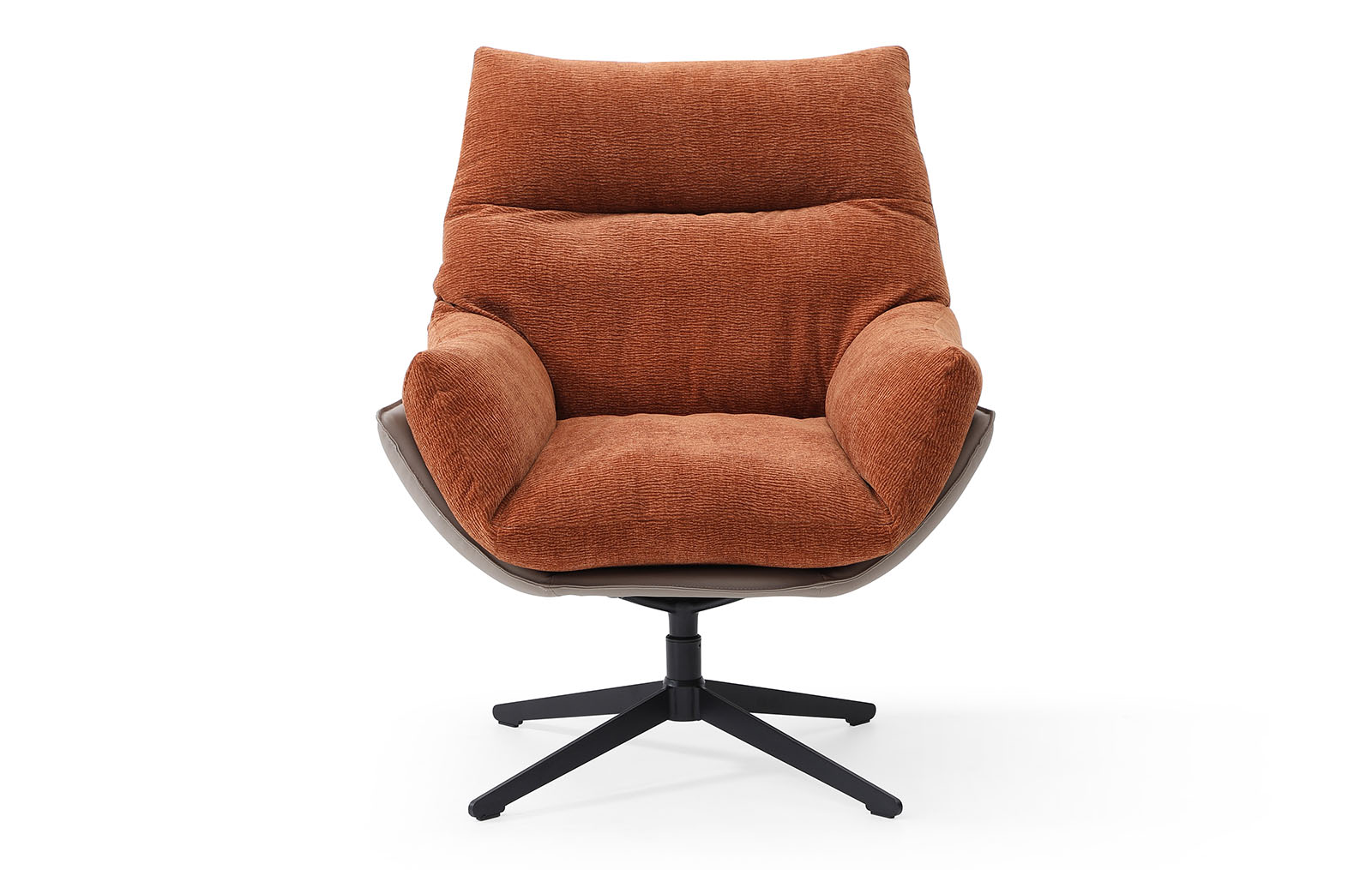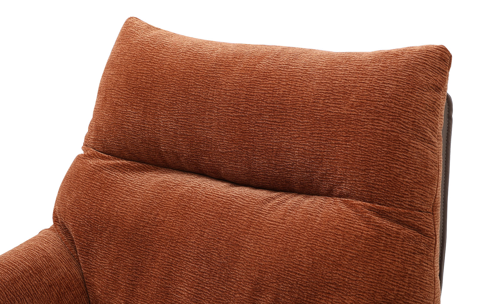 Его мягкое сиденье с подлокотниками обито фактурной тканью насыщенного терракотового оттенка. Внешний корпус обит коричневой экокожей.