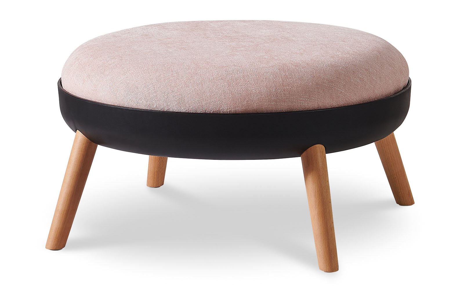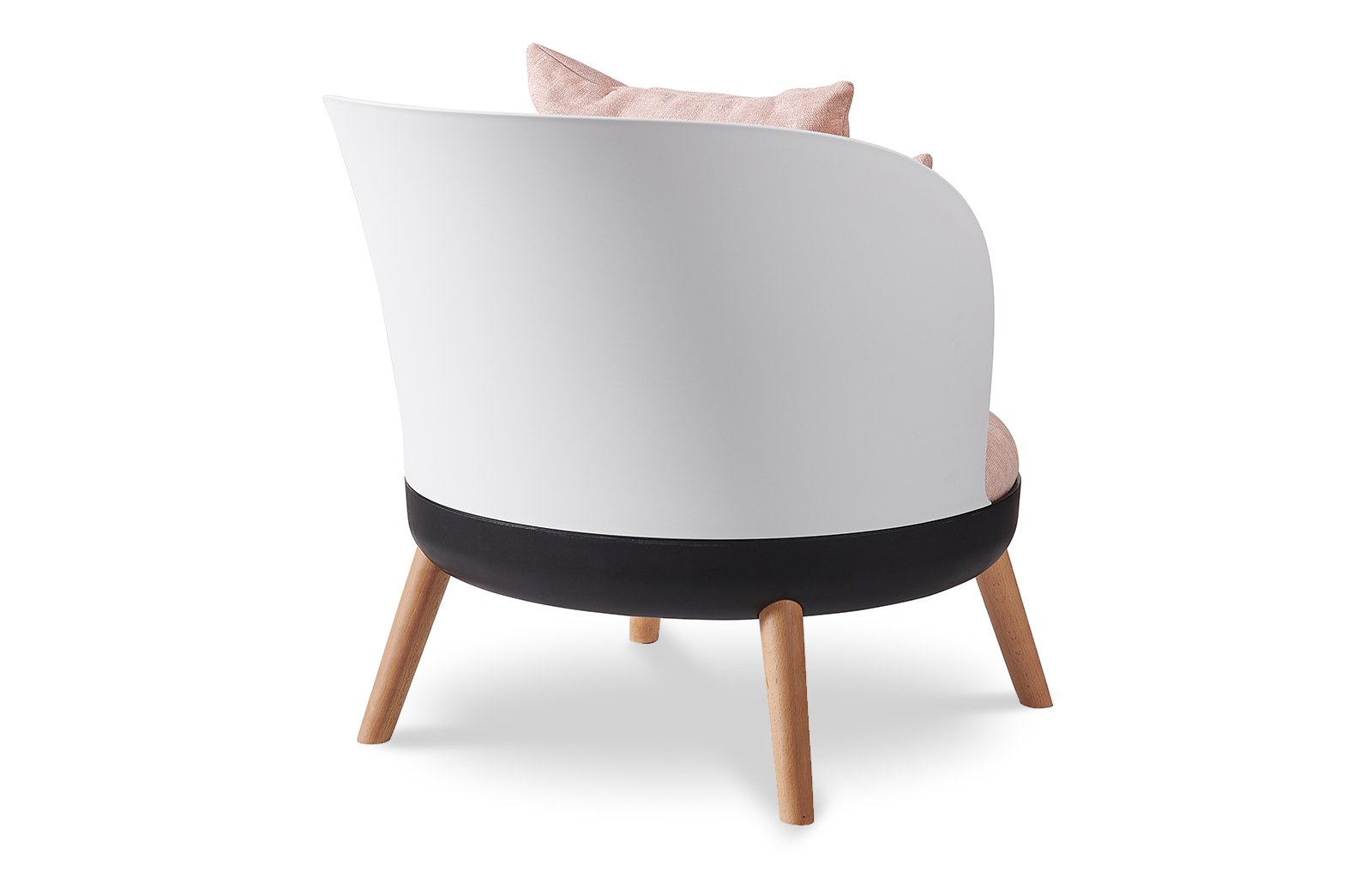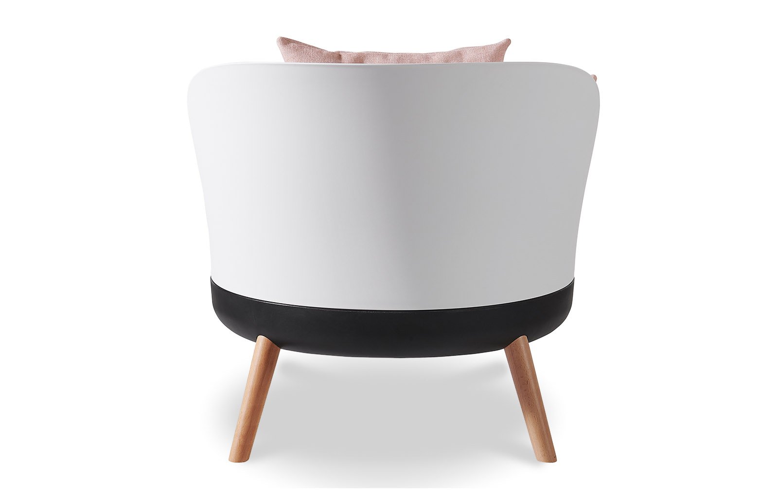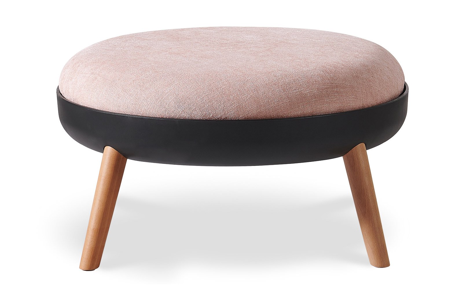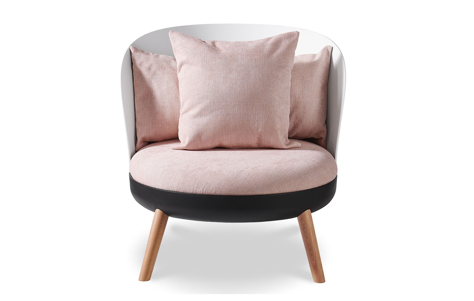 Кресло на четырех деревянных ножках отличается интересной формой: оно круглое, с твердой спинкой из прочного пластика и подушками, которые каждый сможет расположить так, как ему удобно. Пуф имеет такой же дизайн, только без спинки, поэтому его можно использовать и как отдельное посадочное место. Комплект доступен также в другом цвете.