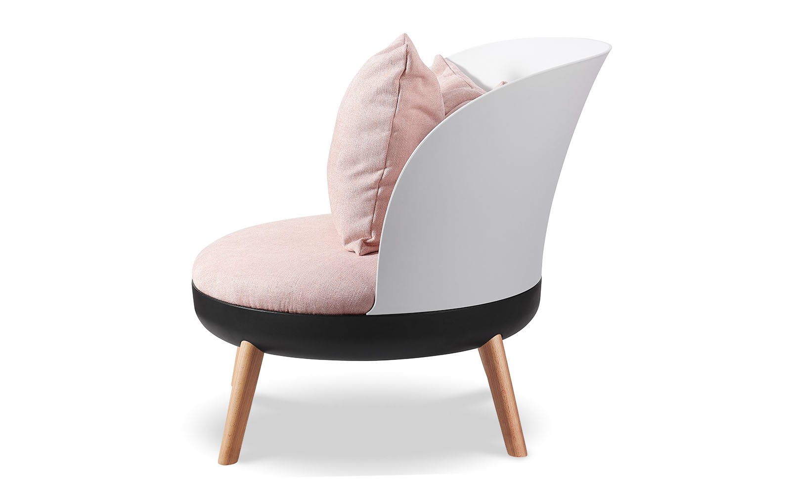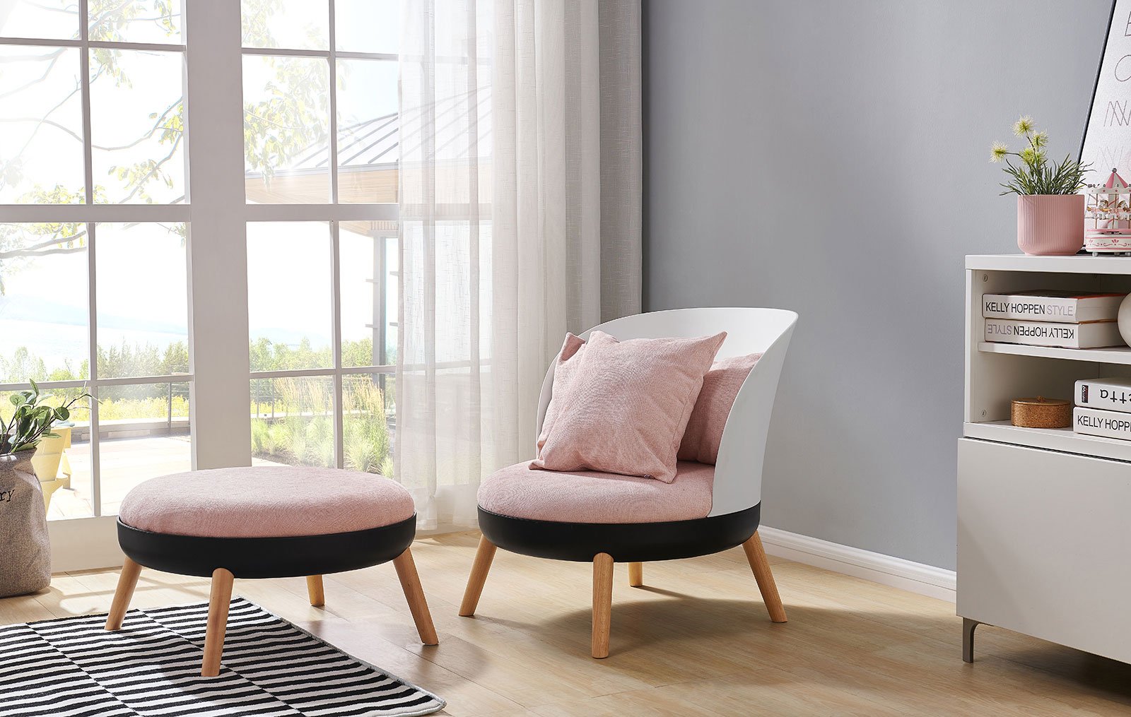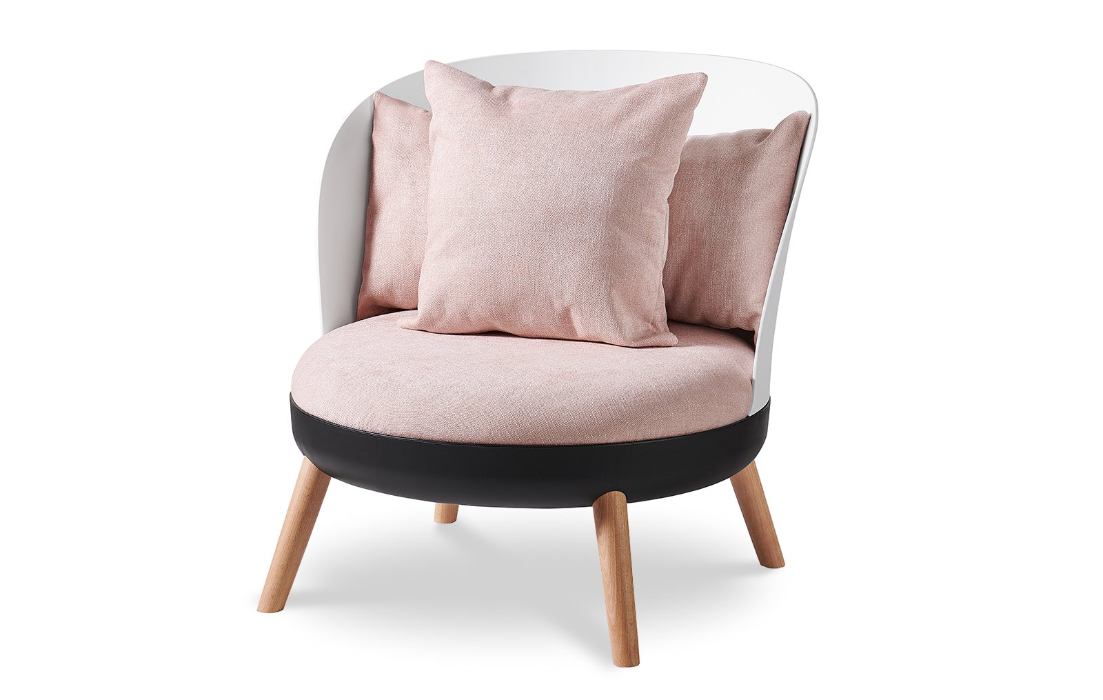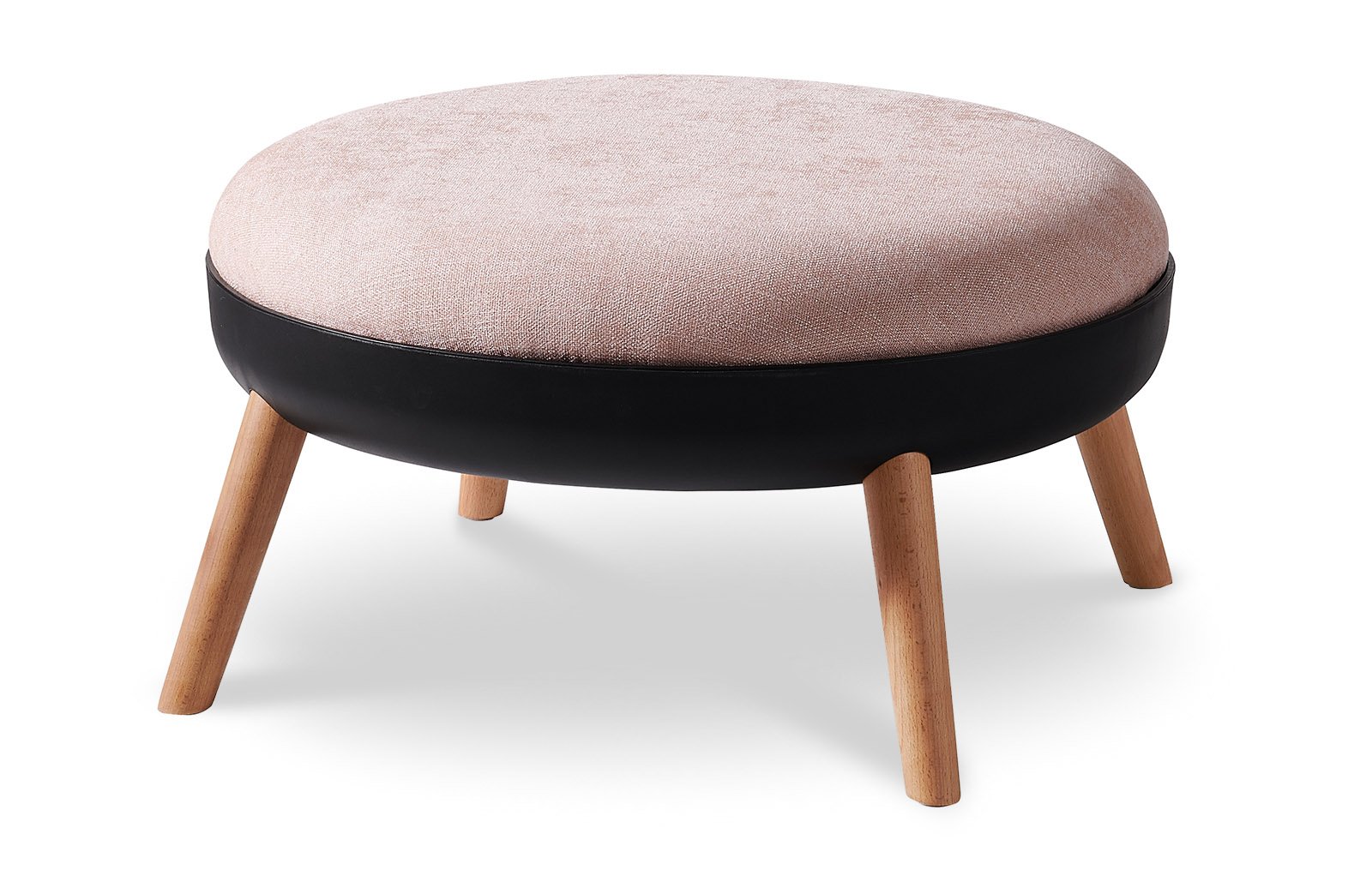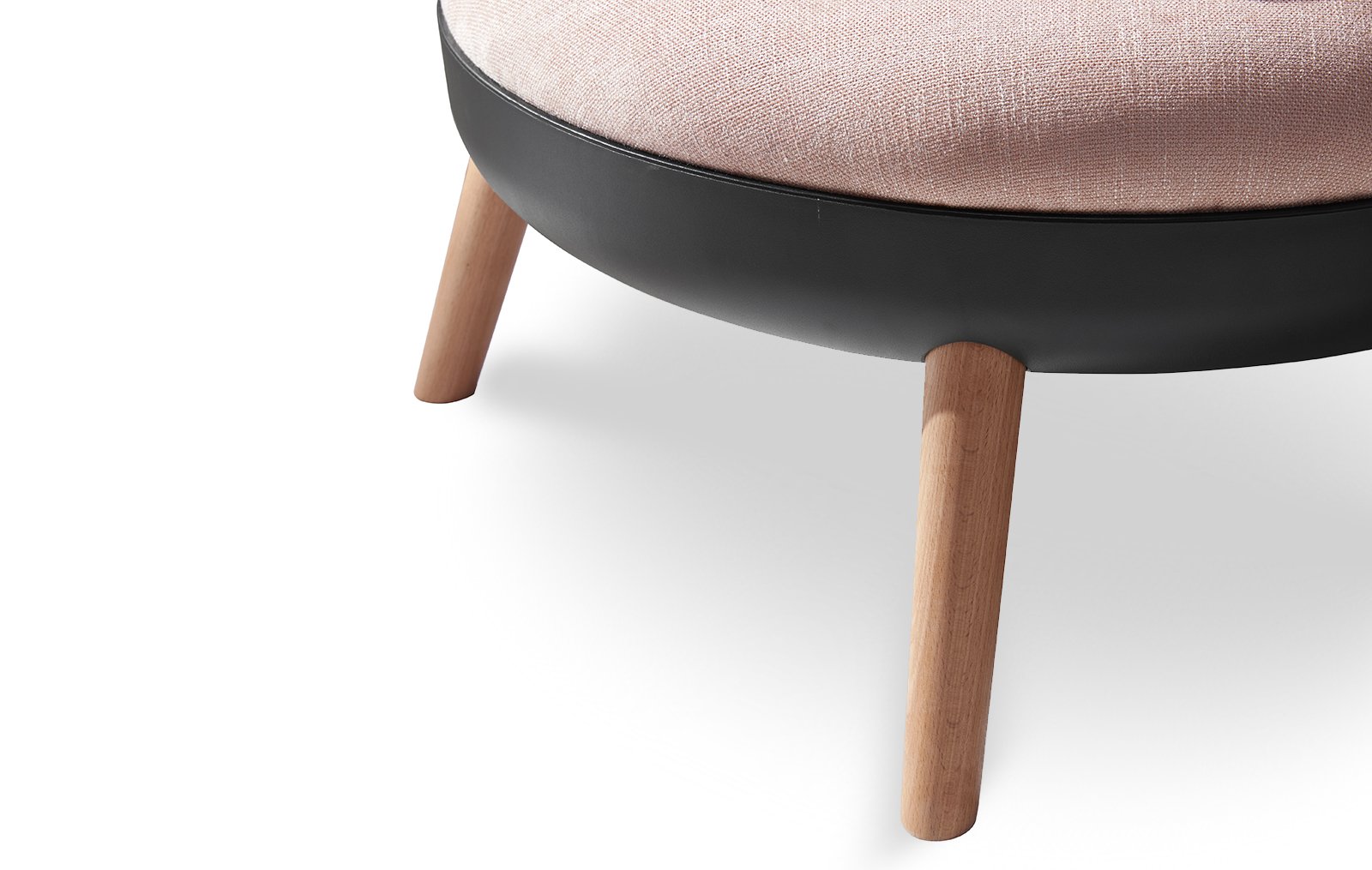Кресло на четырех деревянных ножках отличается интересной формой: оно круглое, с твердой спинкой из прочного пластика и подушками, которые каждый сможет расположить так, как ему удобно. Пуф имеет такой же дизайн, только без спинки, поэтому его можно использовать и как отдельное посадочное место. Комплект доступен также в другом цвете.