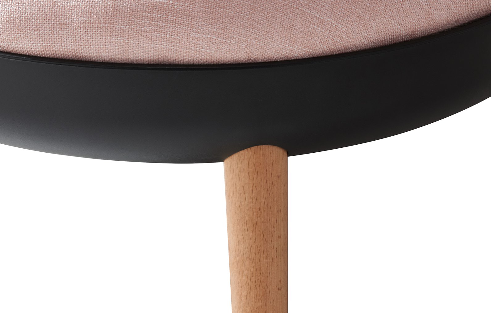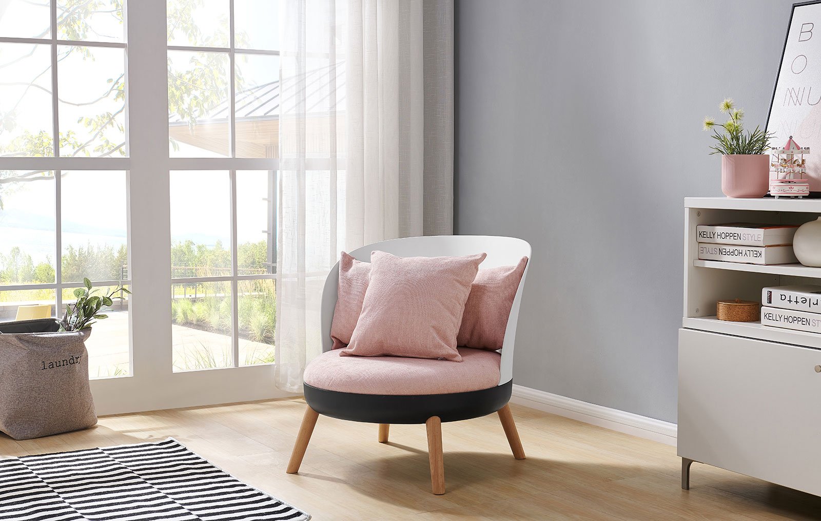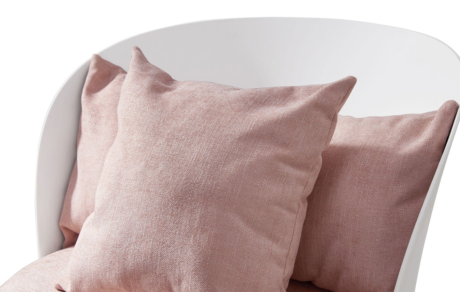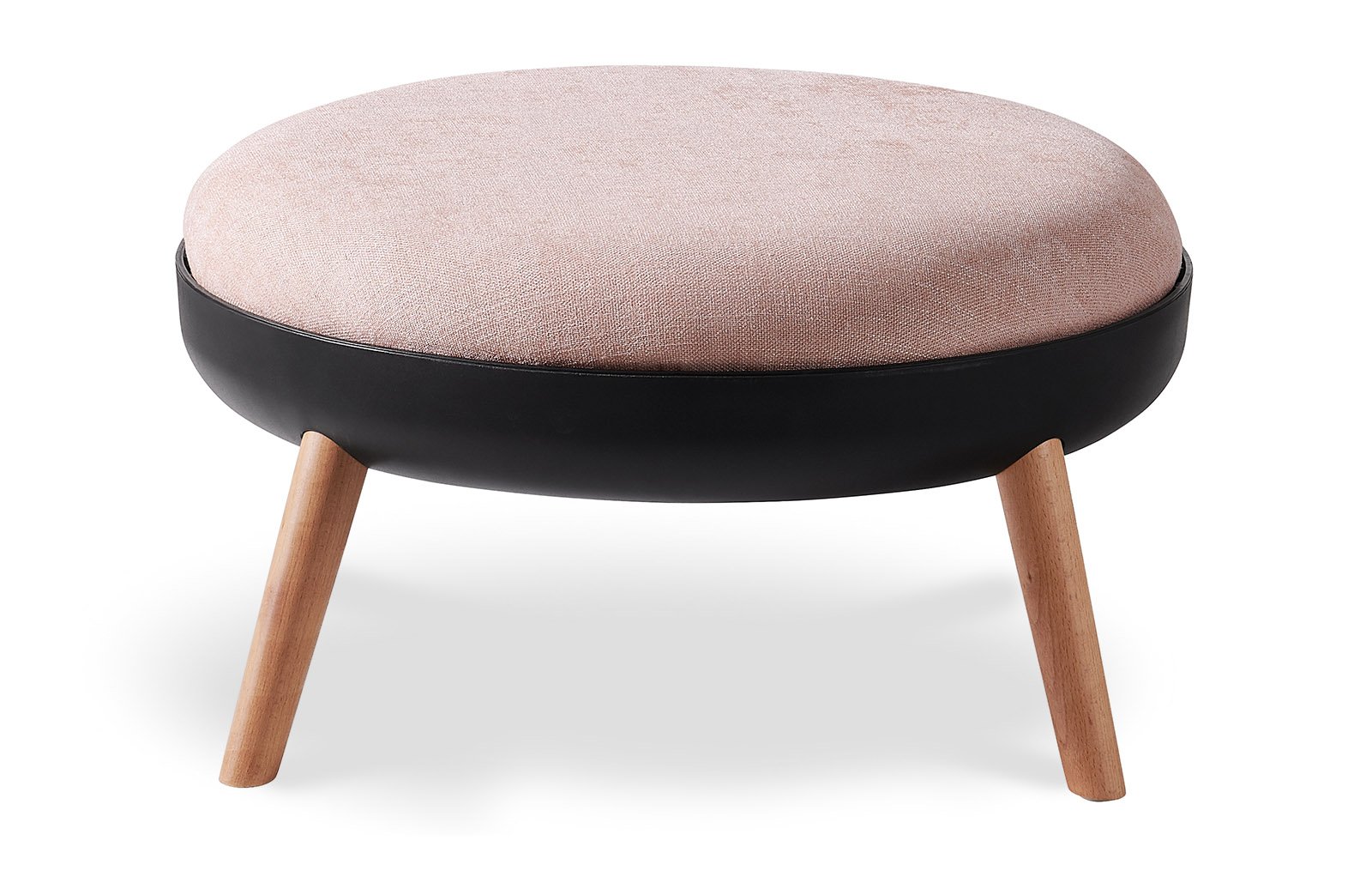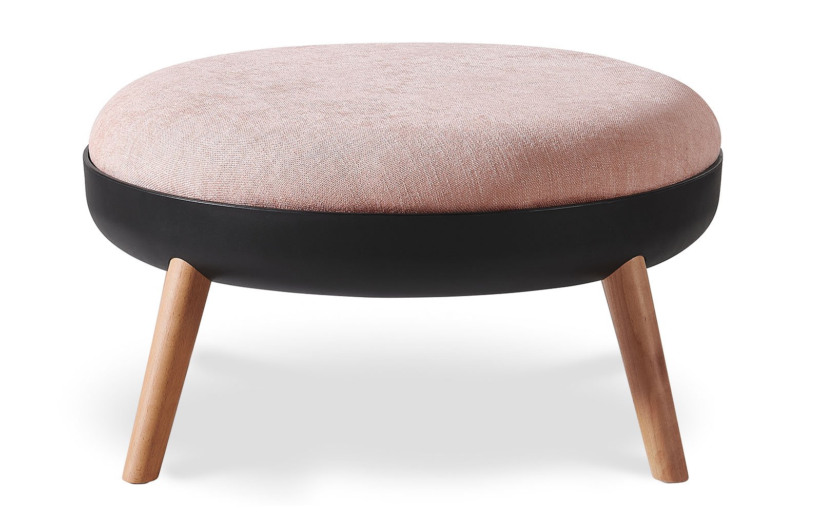 Кресло на четырех деревянных ножках отличается интересной формой: оно круглое, с твердой спинкой из прочного пластика и подушками, которые каждый сможет расположить так, как ему удобно. Пуф имеет такой же дизайн, только без спинки, поэтому его можно использовать и как отдельное посадочное место. Комплект доступен также в другом цвете.