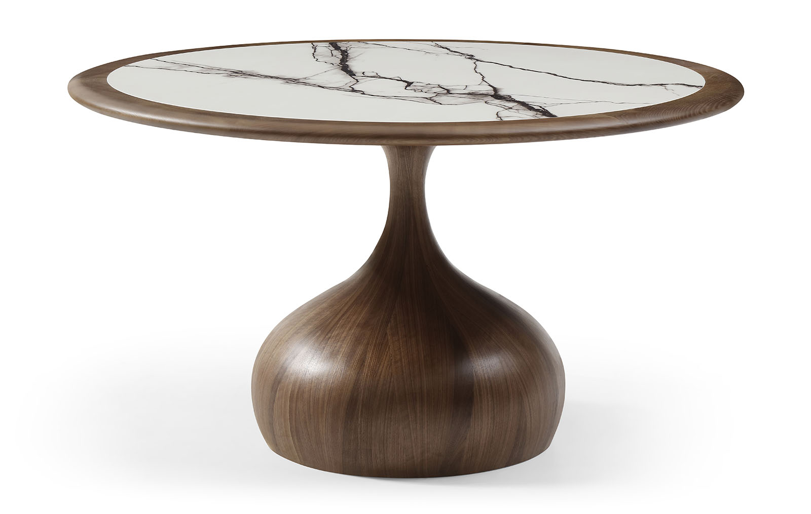 Столешница диаметром 135 см изготовлена из глянцевой керамики толщиной 6 мм и массива ясеня 35 мм. Ножка сделана из стекловолокна в шпоне ореха.