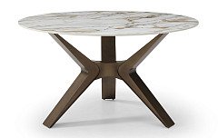 Столешница диаметром 140 см изготовлена из глянцевой керамики толщиной 12 мм. Ножка сделана из металла в бронзовом оттенке.