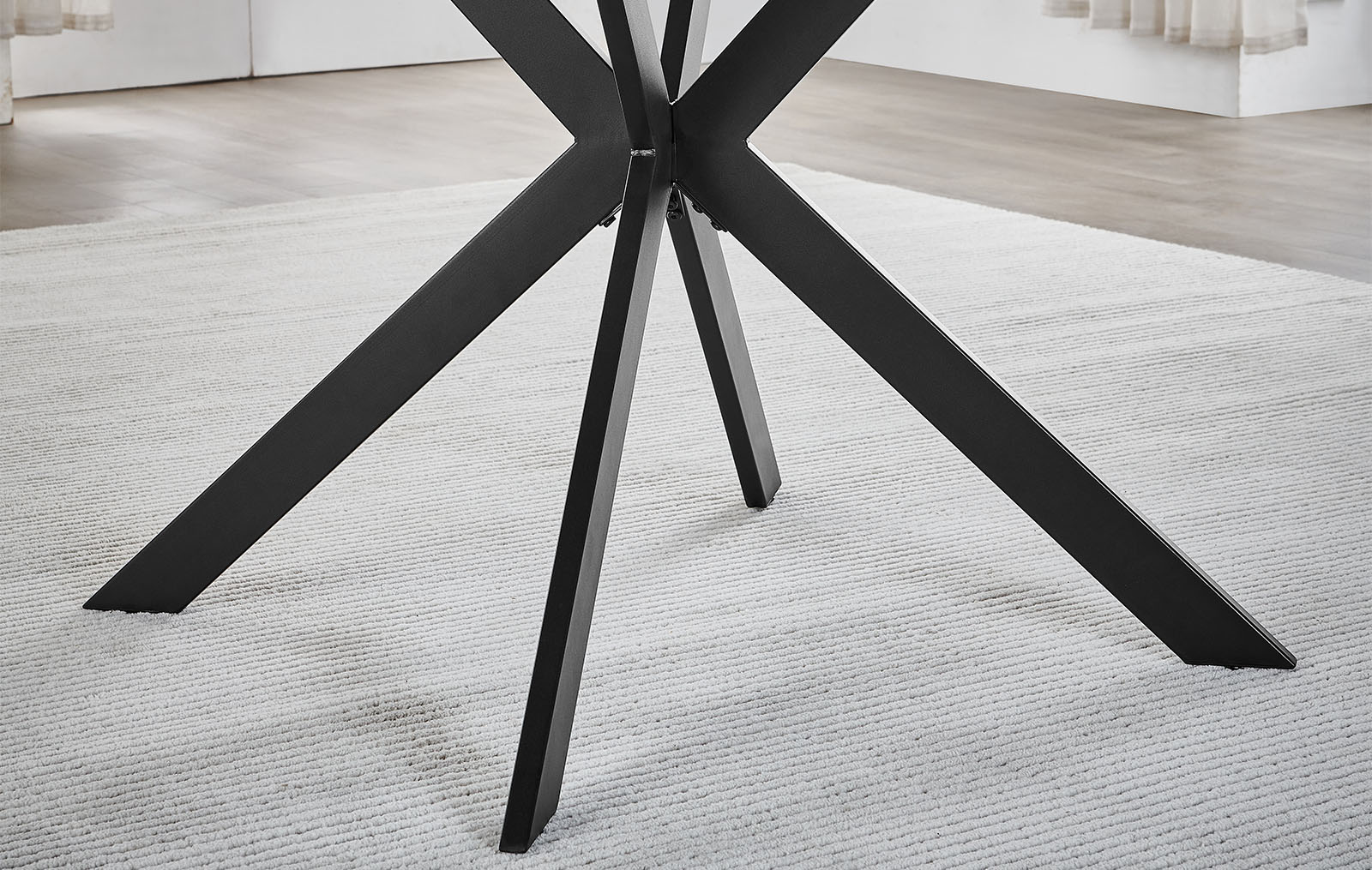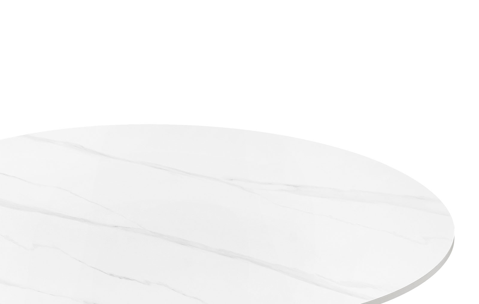 Круглая столешница изготовлена из глянцевой белой керамики с серыми узорами под мрамор толщиной 11 мм, диаметр 120 см. Под столешницей находится соединительная часть из MDF толщиной 18 мм. Подстолье сделано из металла.