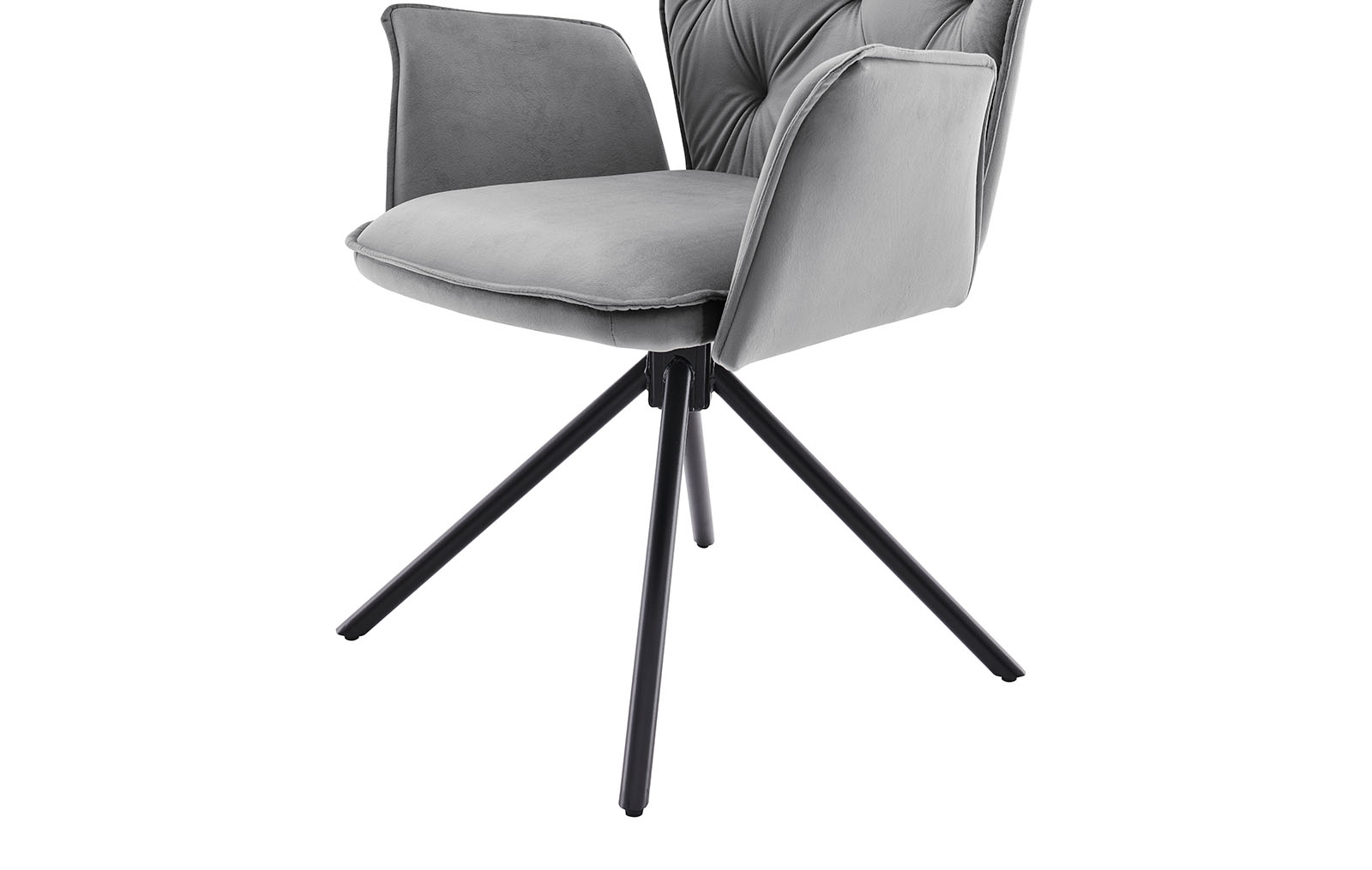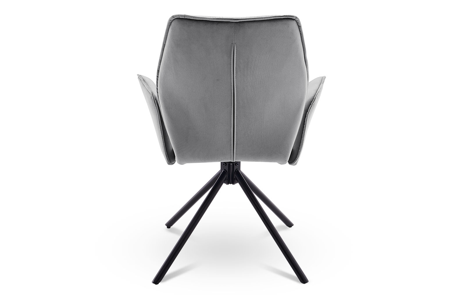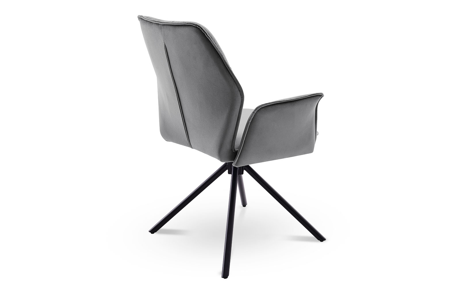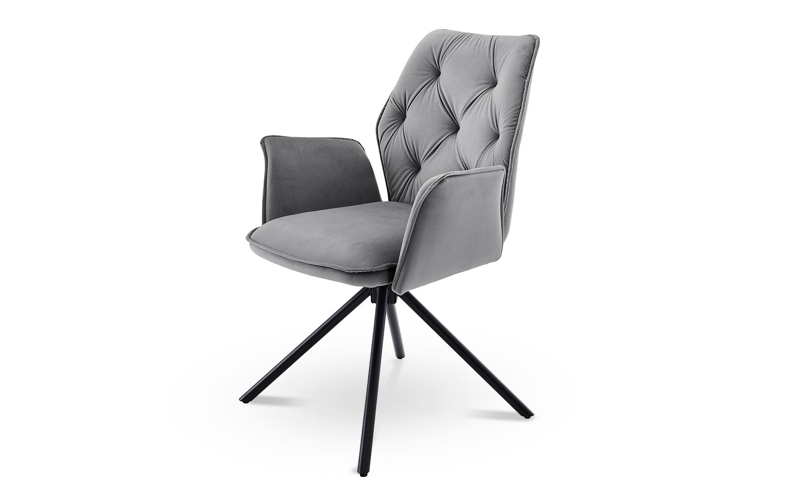 Стул Estella имеет поворотный механизм, может вращаться на 180°. Его обивка из приятного на ощупь велюра универсального серого цвета. Ножки из металла с защитным напылением. Данная модель имеет спинку, на которую можно с комфортом облокотиться, и удобные подлокотники.