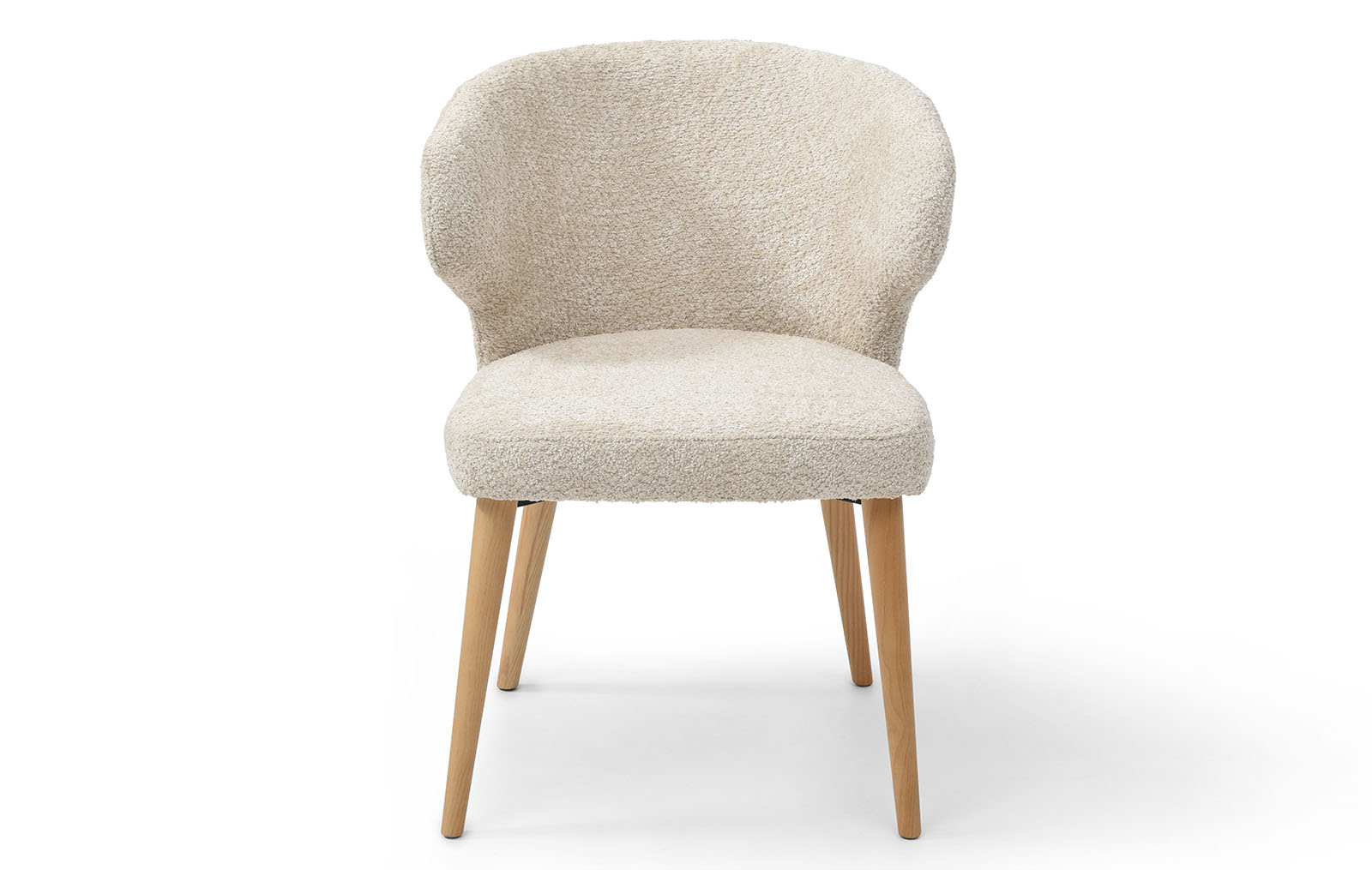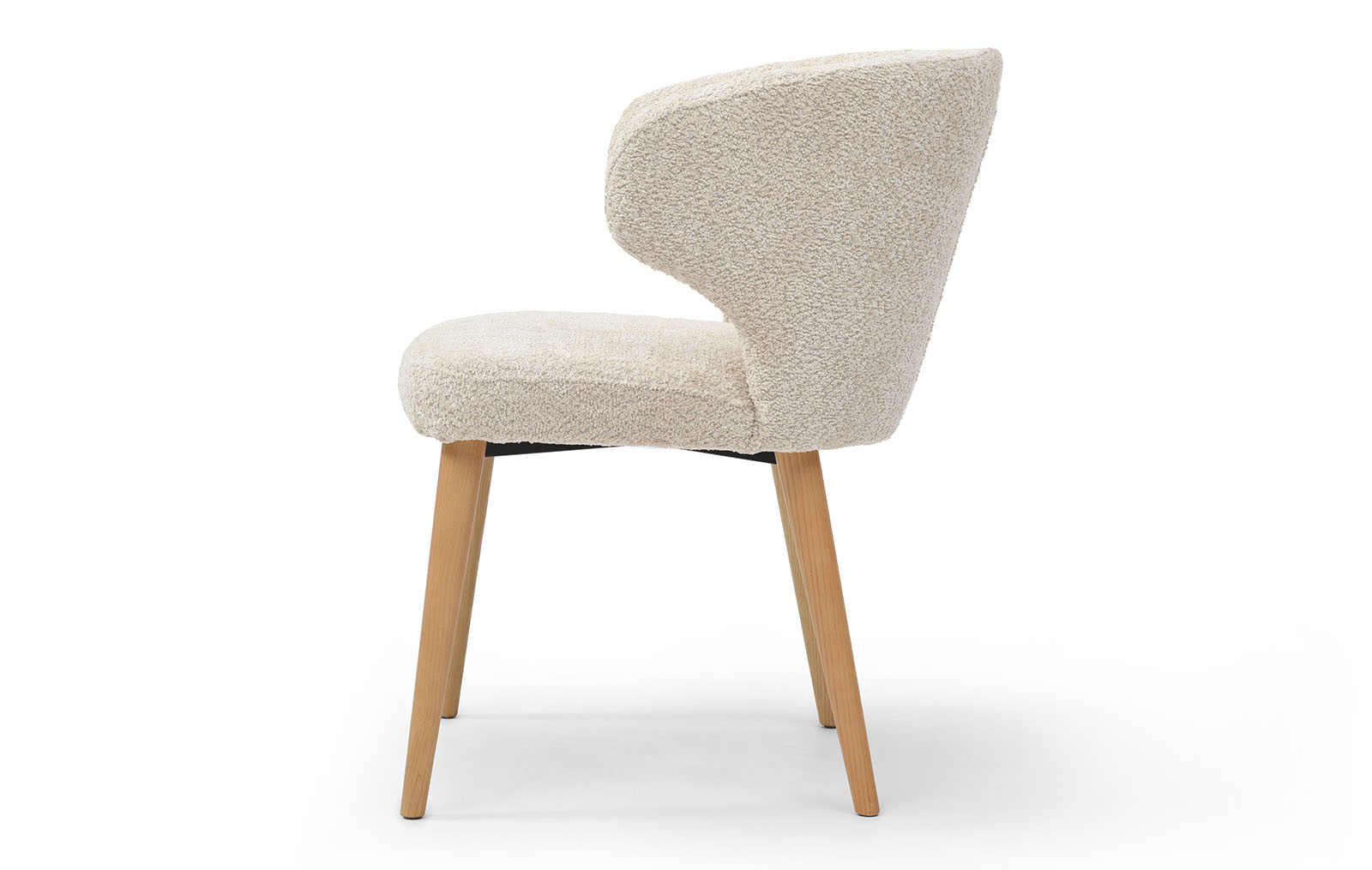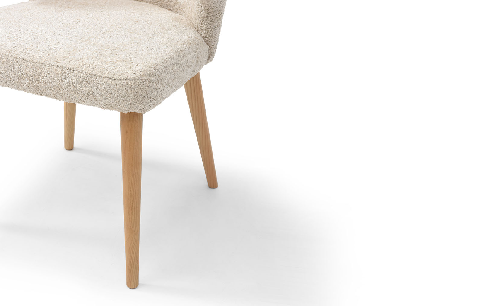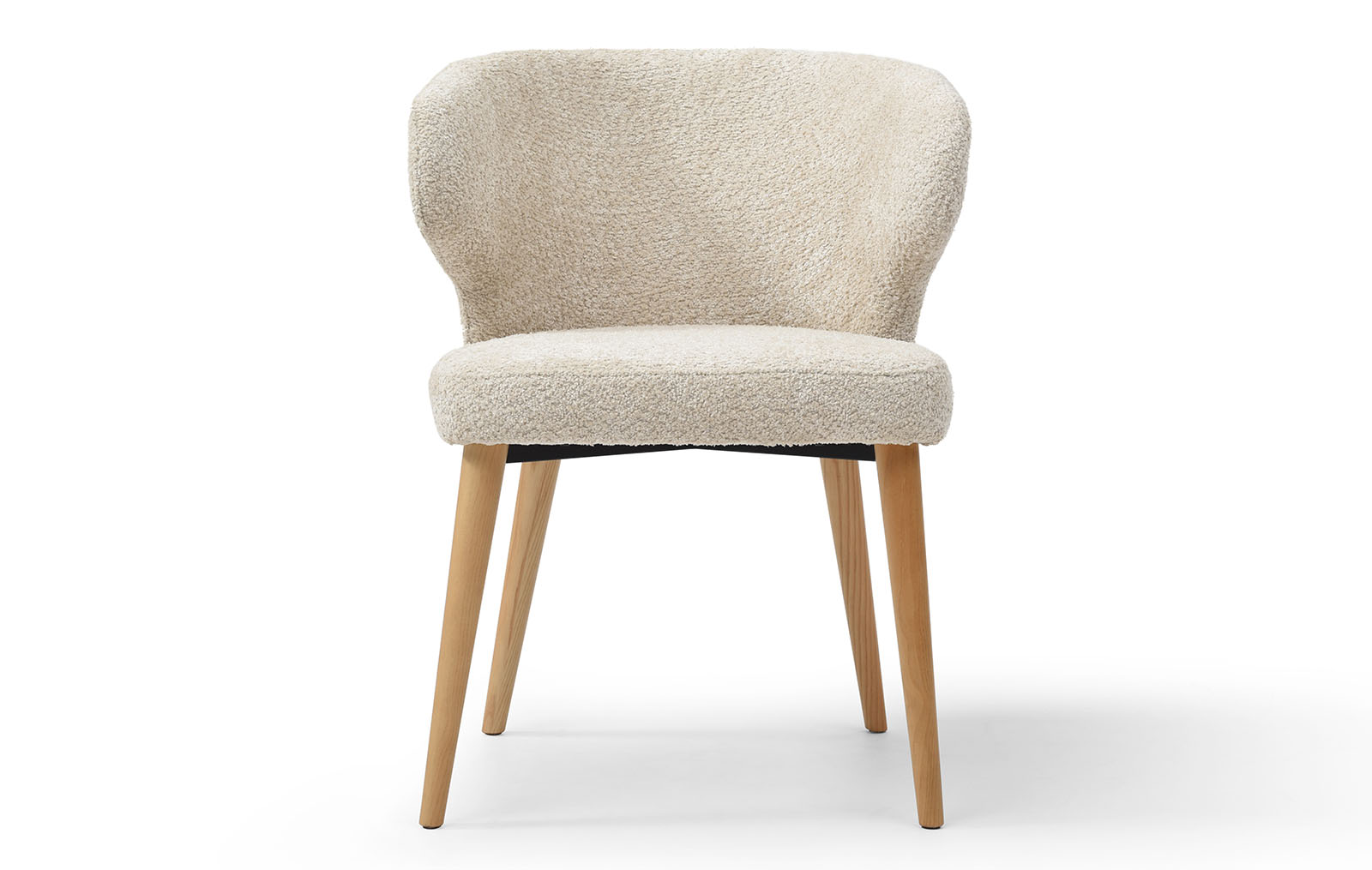 Обеденный стул Simona имеет обивку из ткани тедди и ножки из дерева в оттенке ясеня.