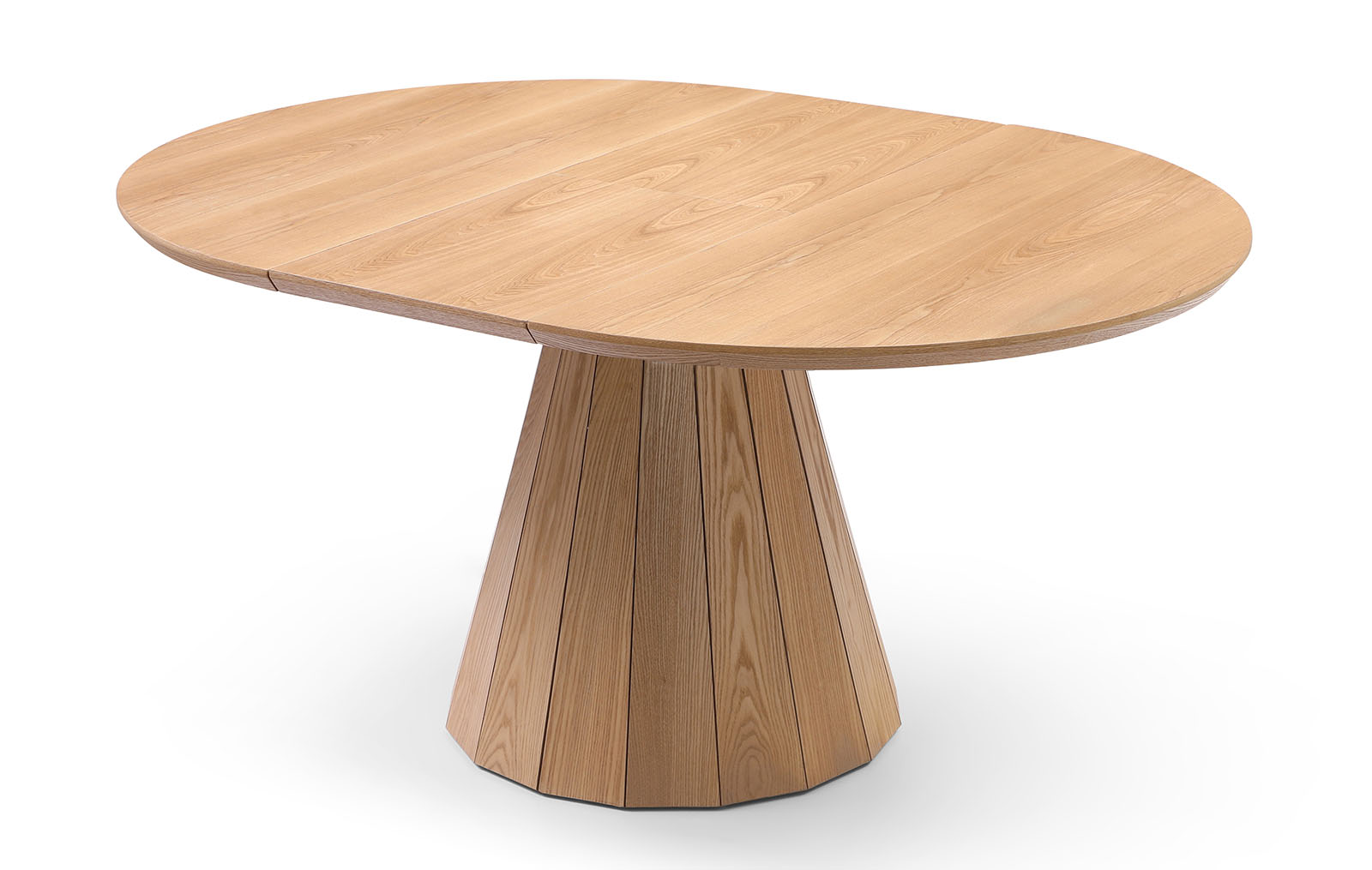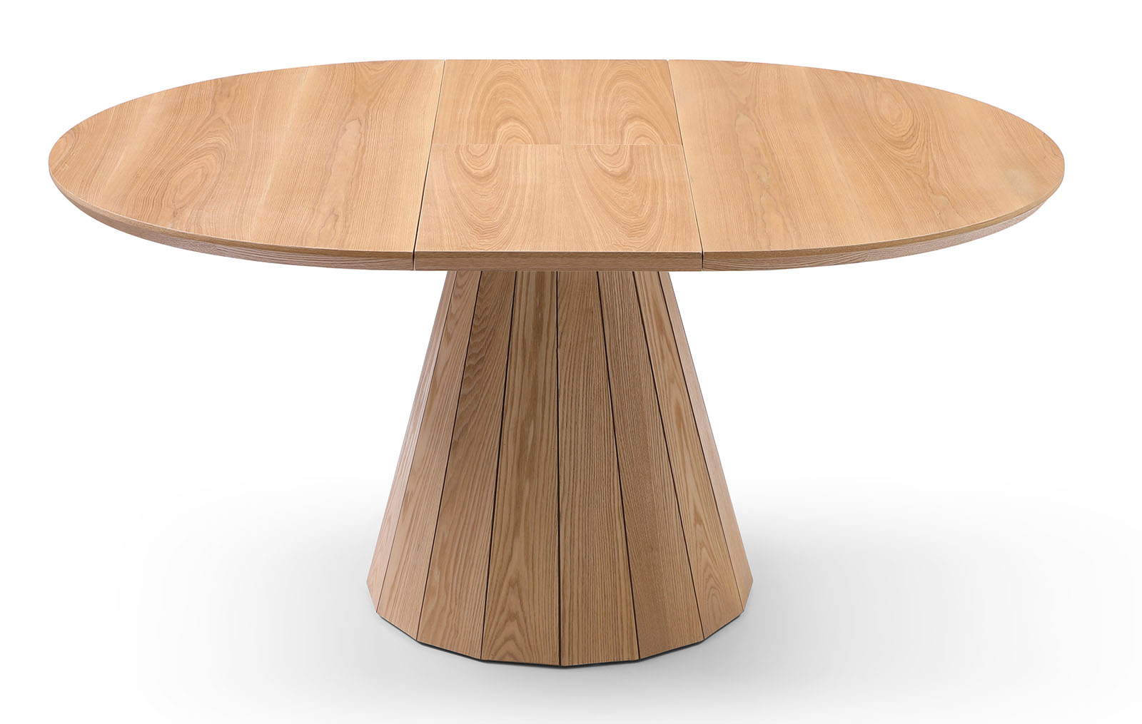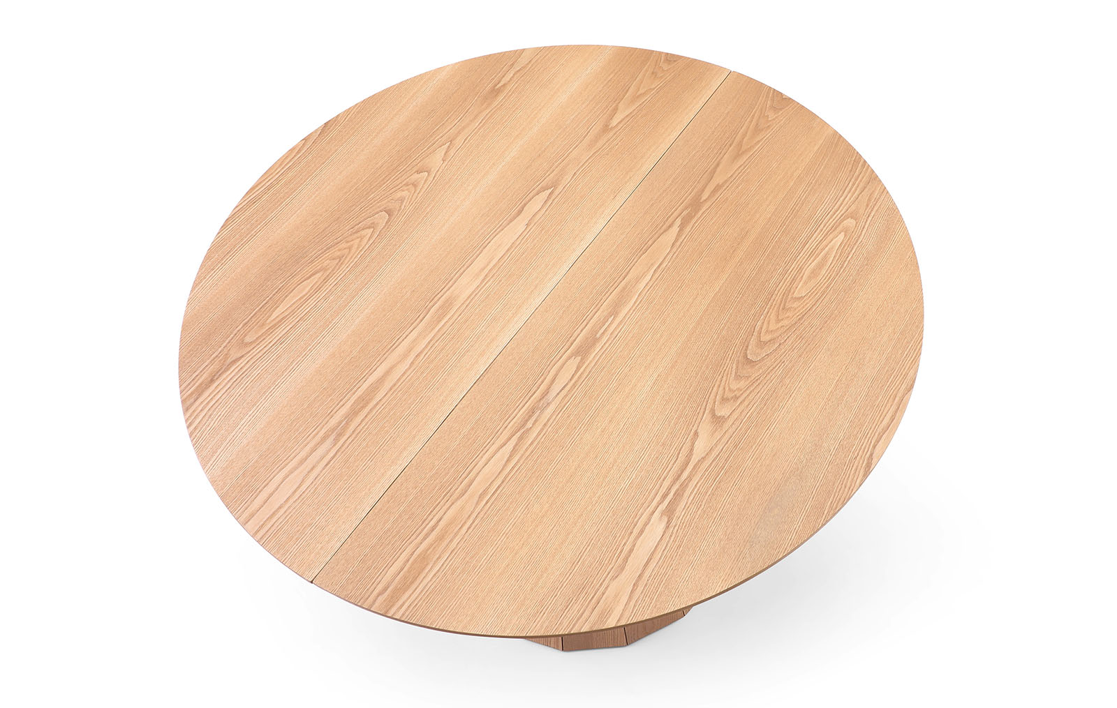 Круглый стол Enjoy в отделке натуральным шпоном ясеня легко раскладывается в овальный при необходимости увеличить длину стола.