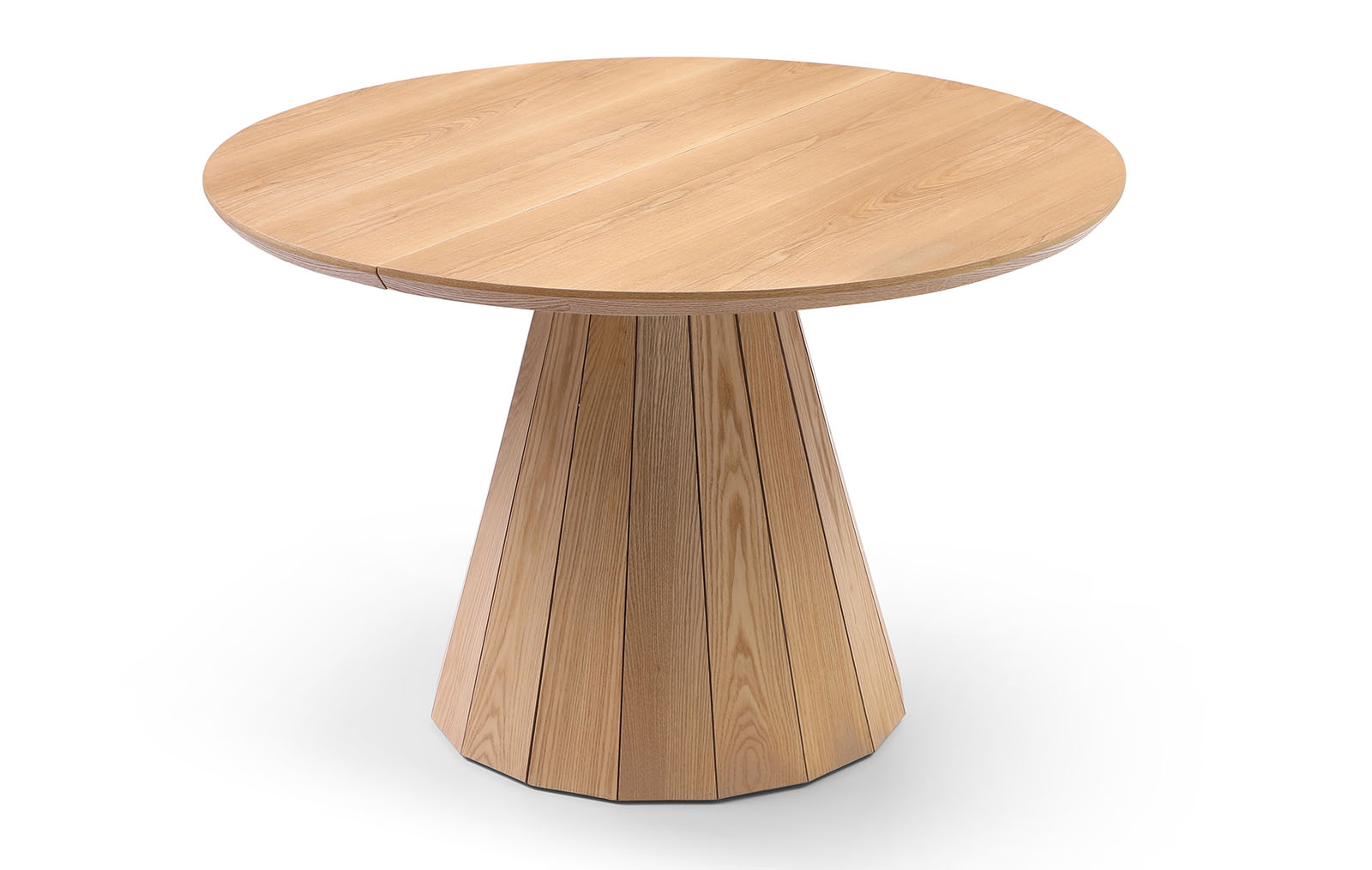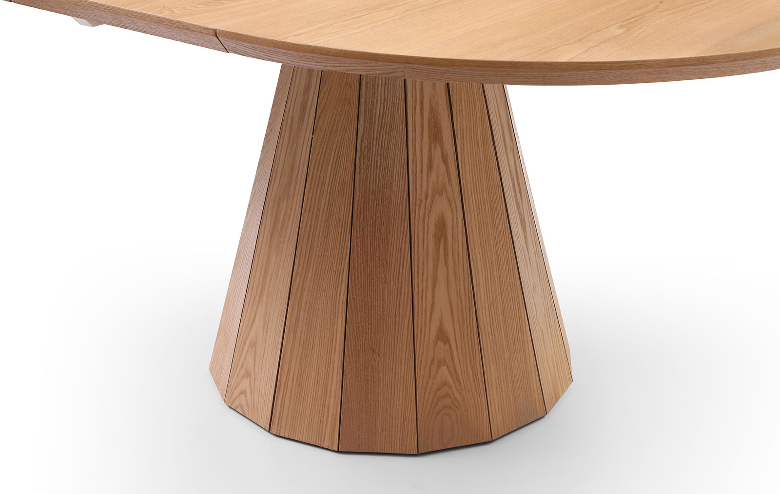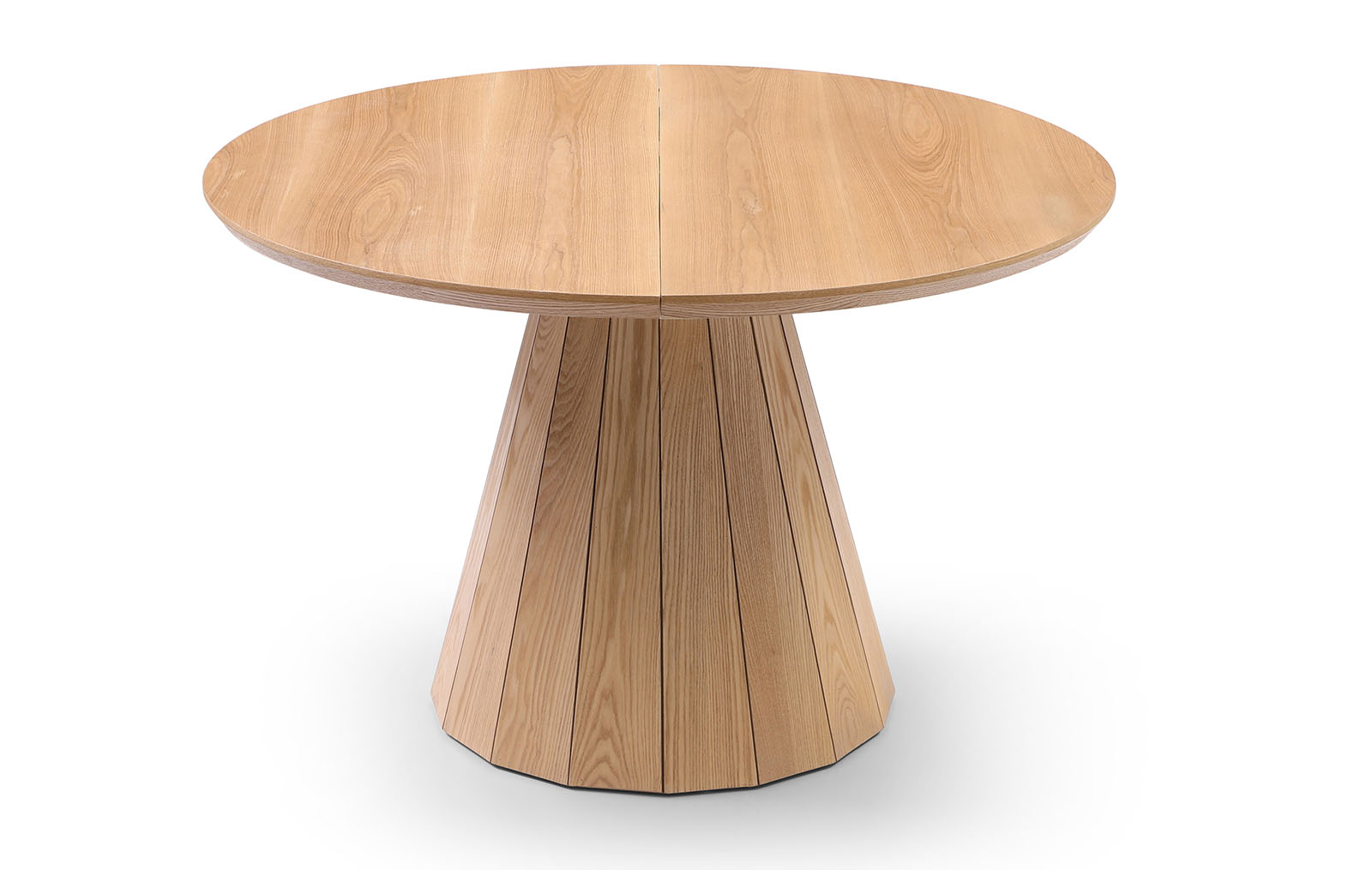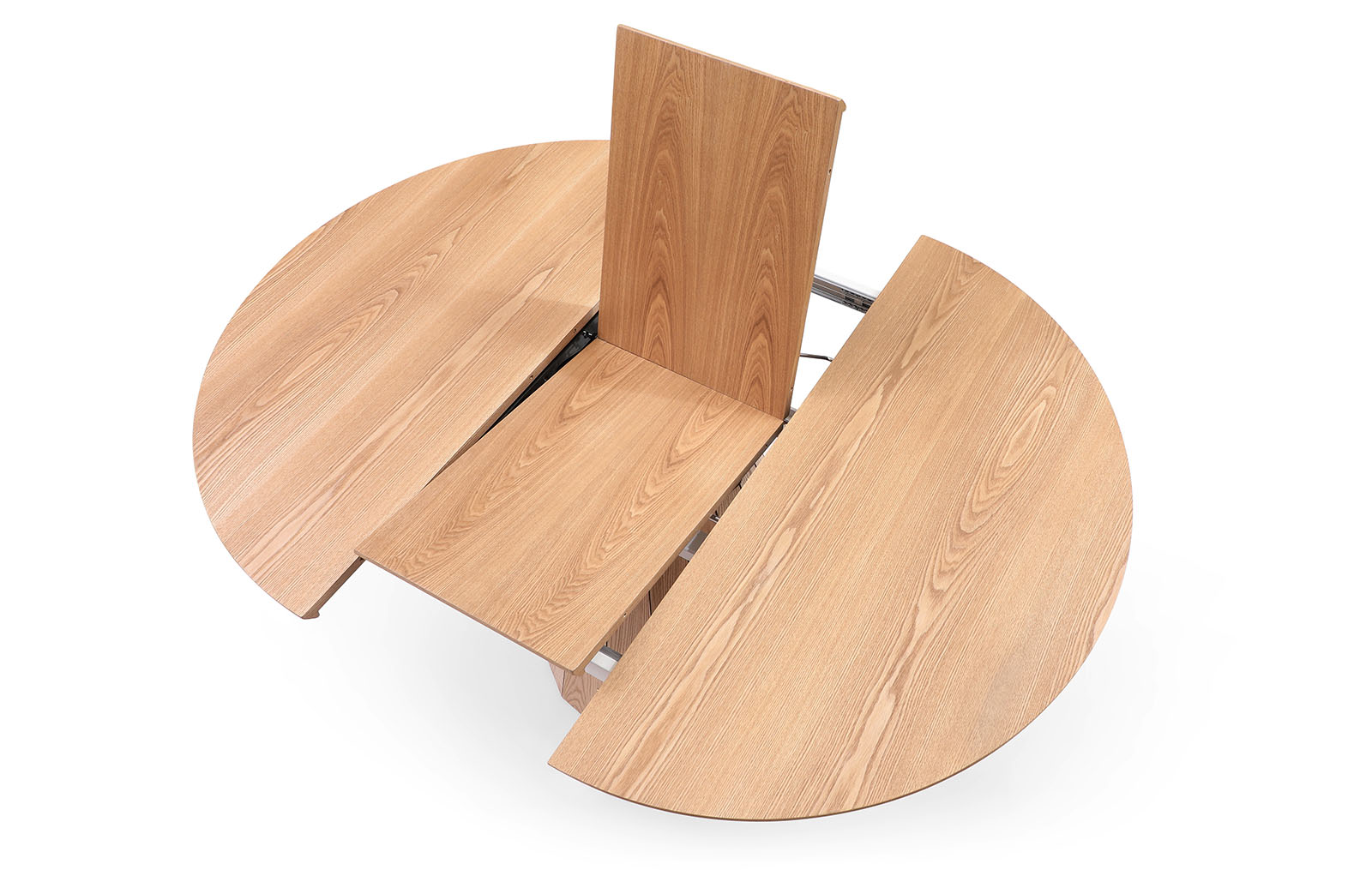 Круглый стол Enjoy в отделке натуральным шпоном ясеня легко раскладывается в овальный при необходимости увеличить длину стола.