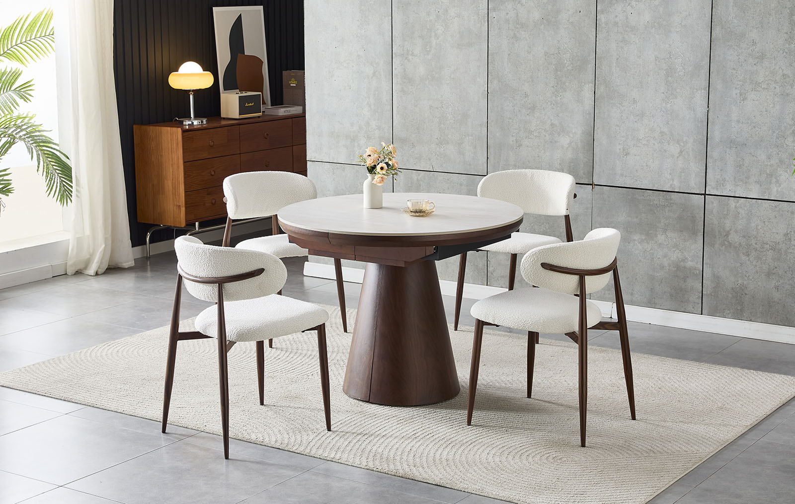 Обеденный комплект из стола Judy с керамической столешницей и 4-х стульев Aaron в ткани тедди объединяет в себе многофункциональность, практичные материалы и актуальный дизайн.