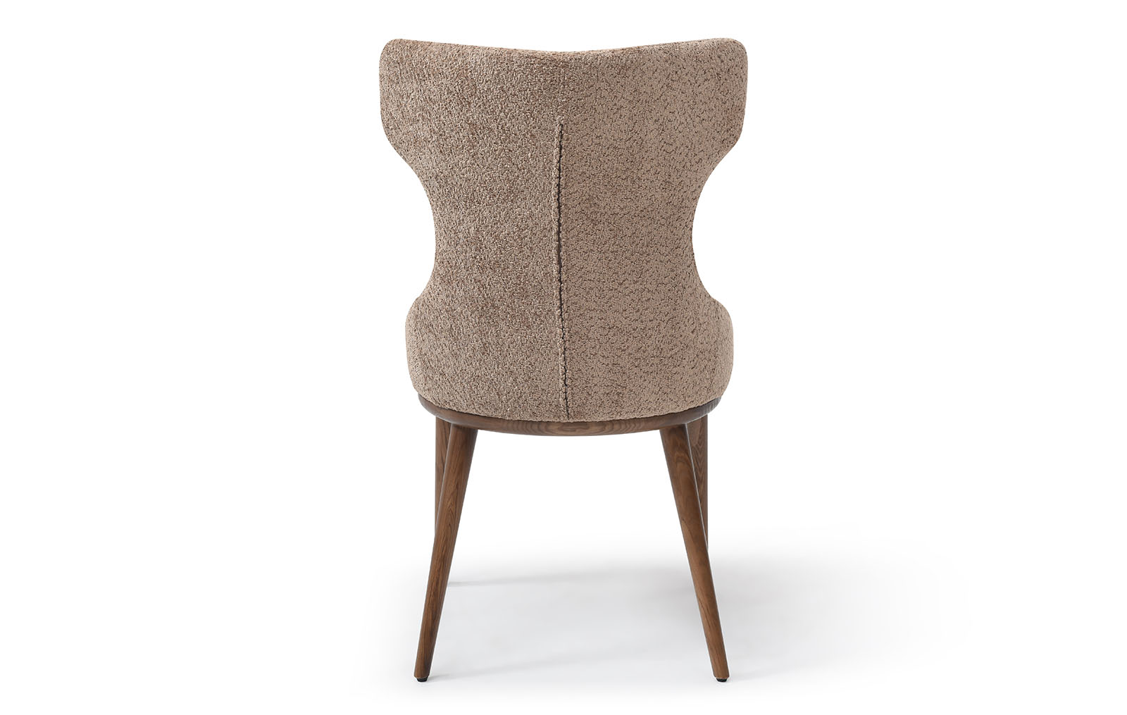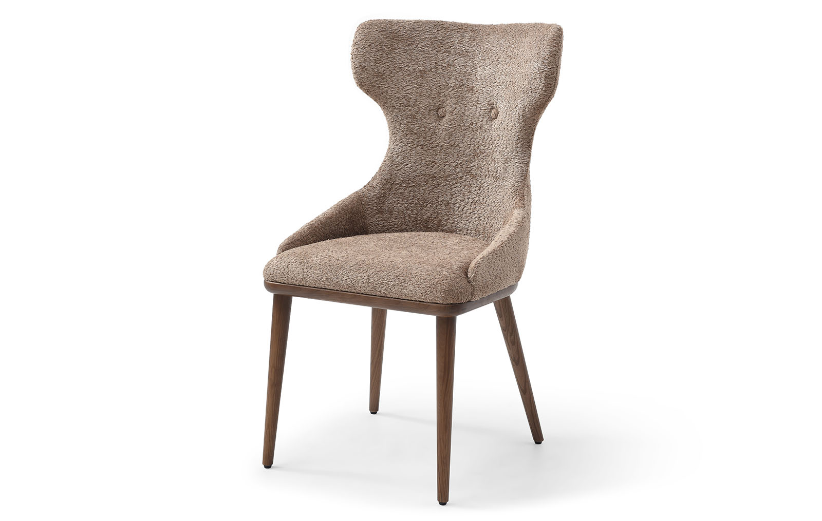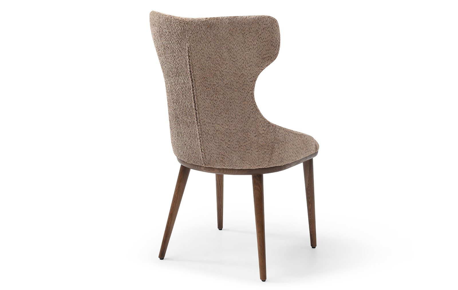Обеденный стул Augusta (Августа) имеет обивку из ткани тедди в оттенке капучино и ножки из дерева в оттенке ореха.