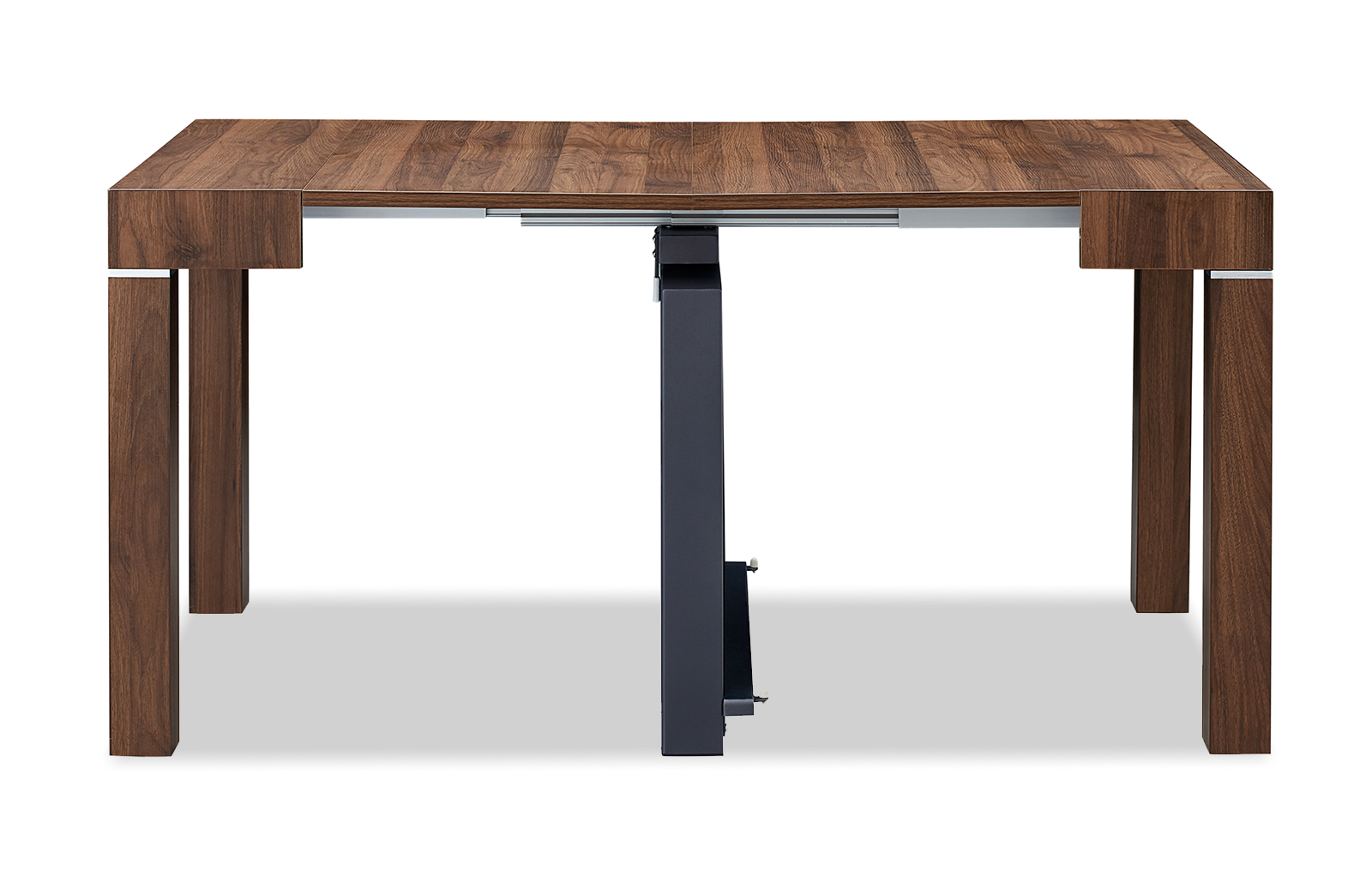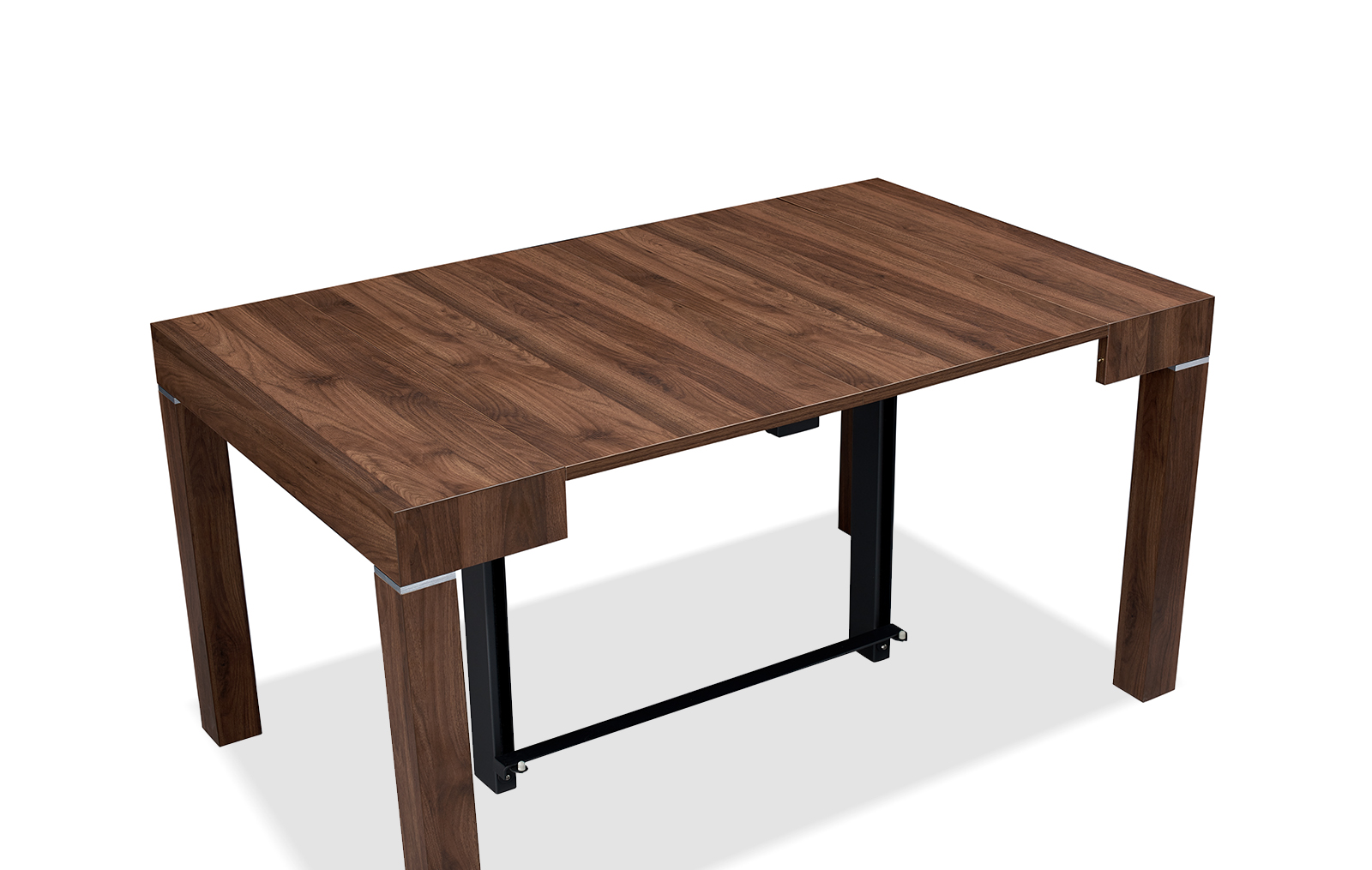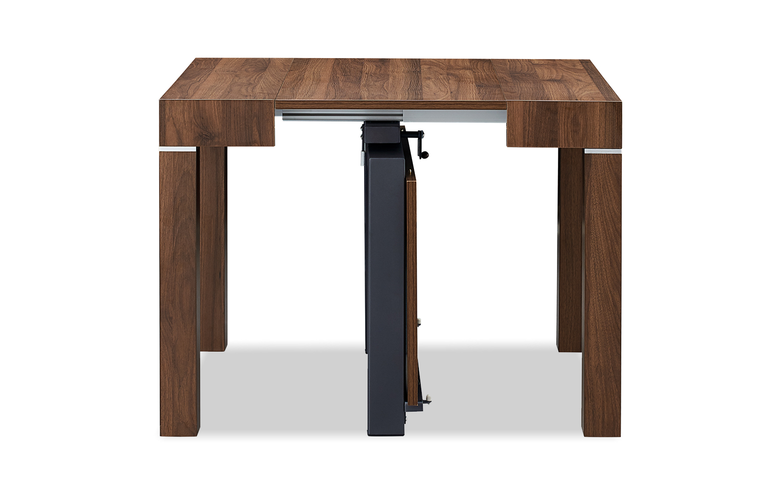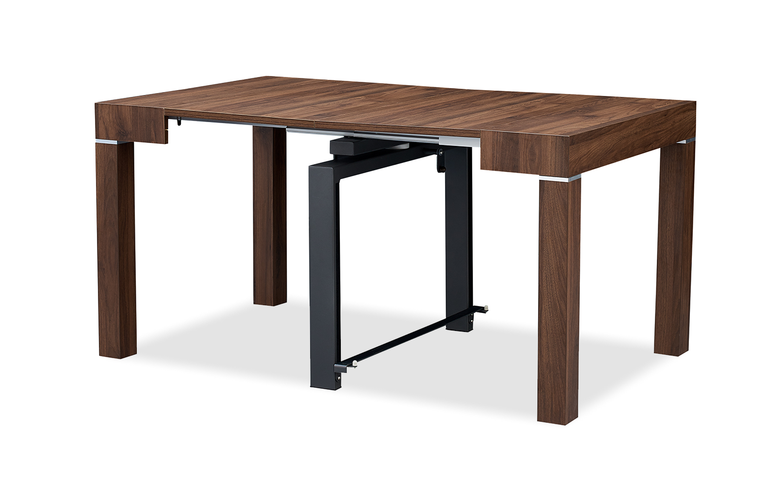 Стол прямоугольной формы в сложенном виде не превосходит по размерам пристенную консоль. В разложенном виде он становится удобным для размещения 6-10 человек. Модель смотрится дорого и солидно за счет текстуры ореха.