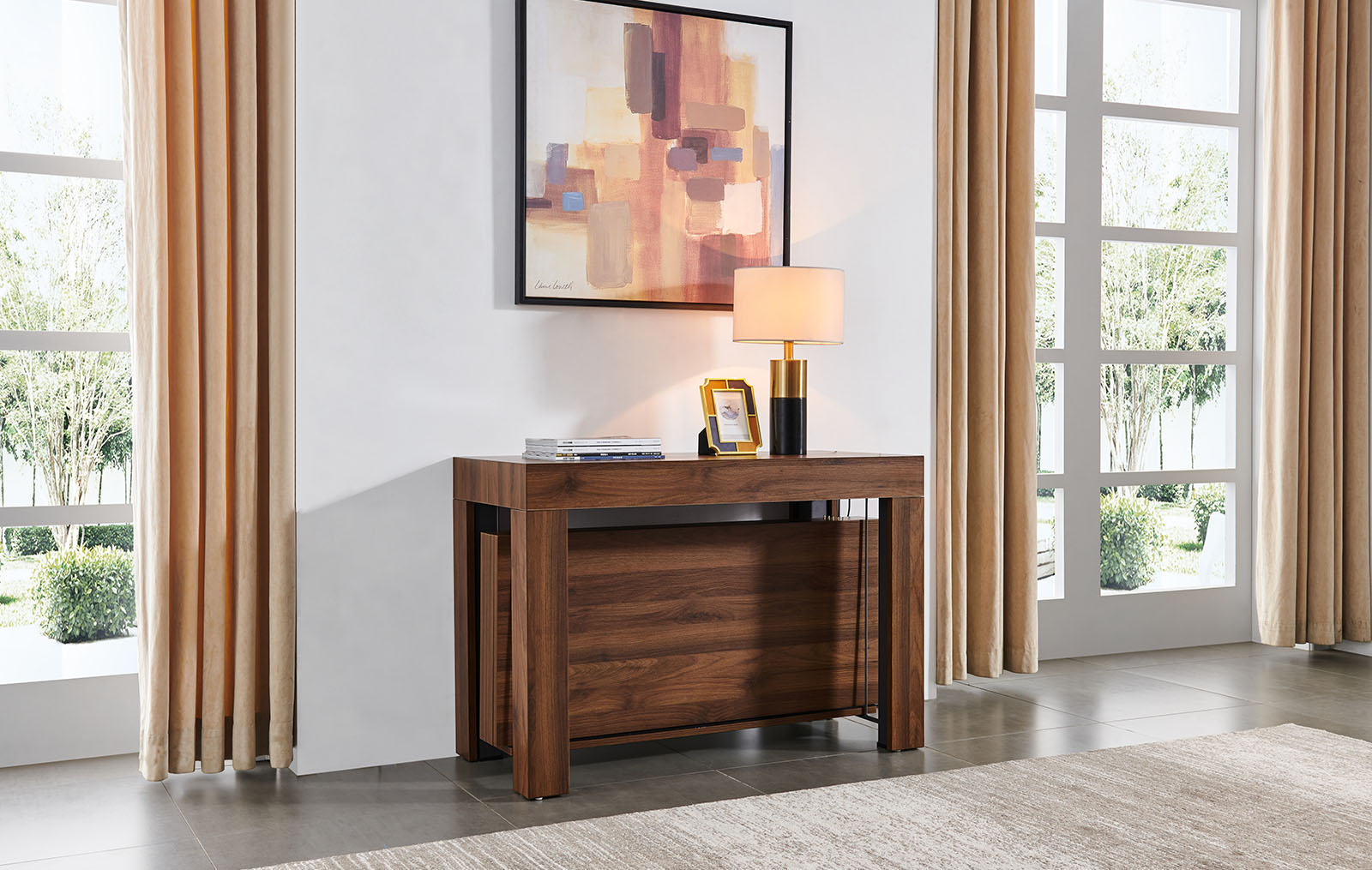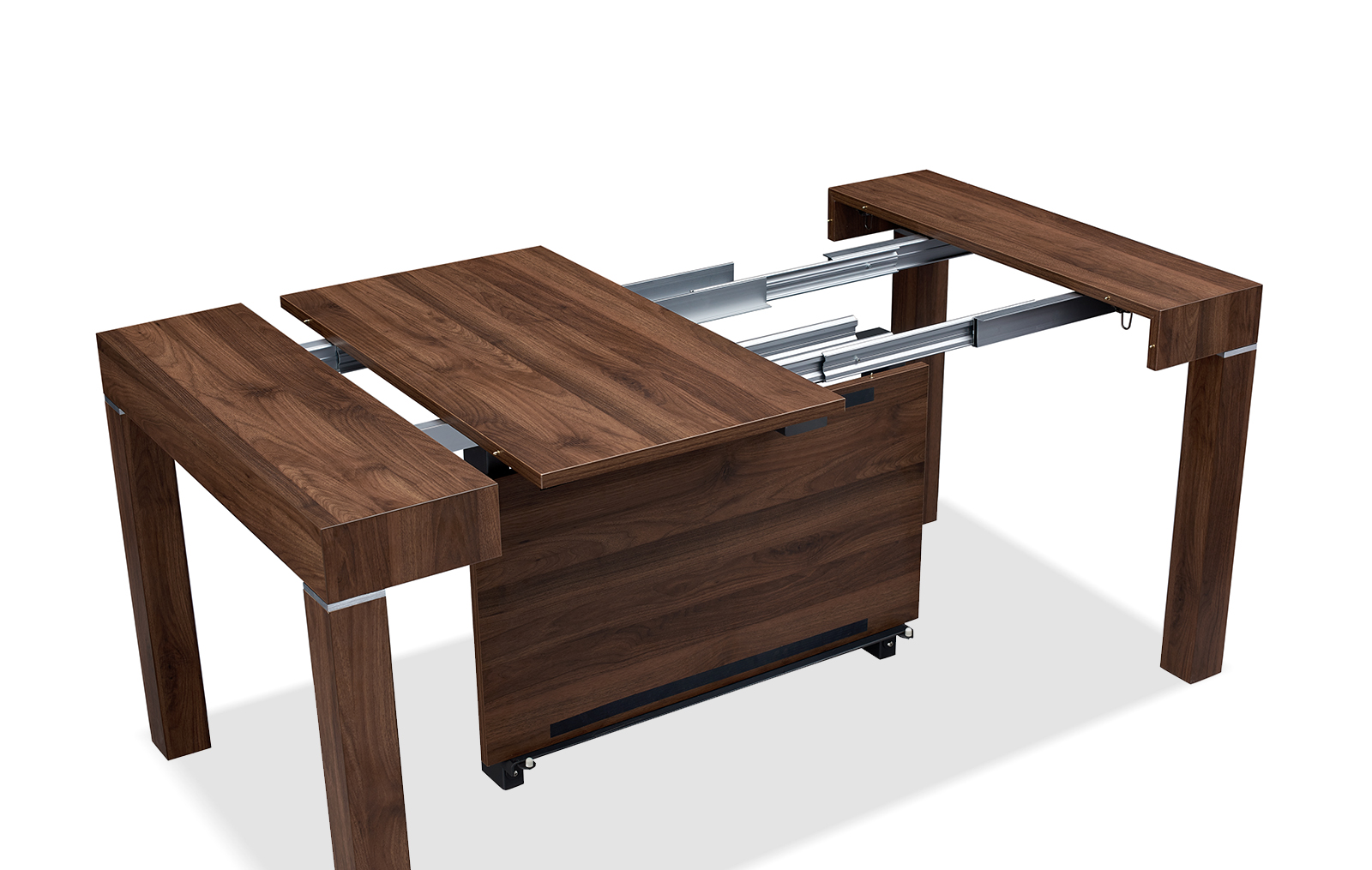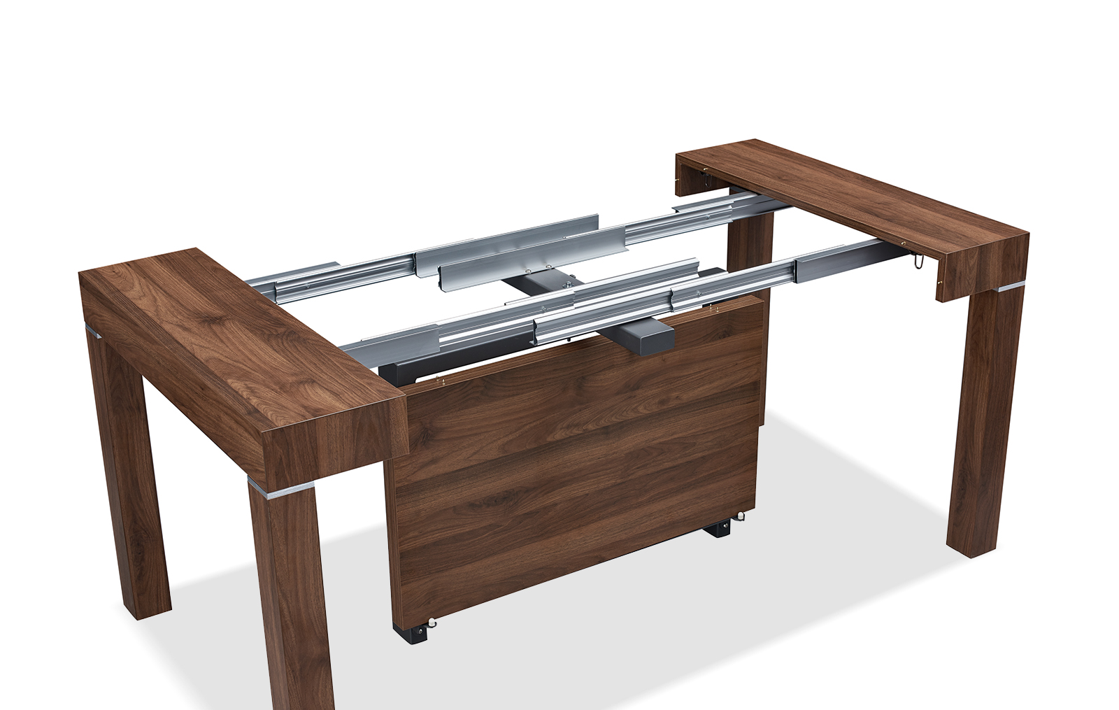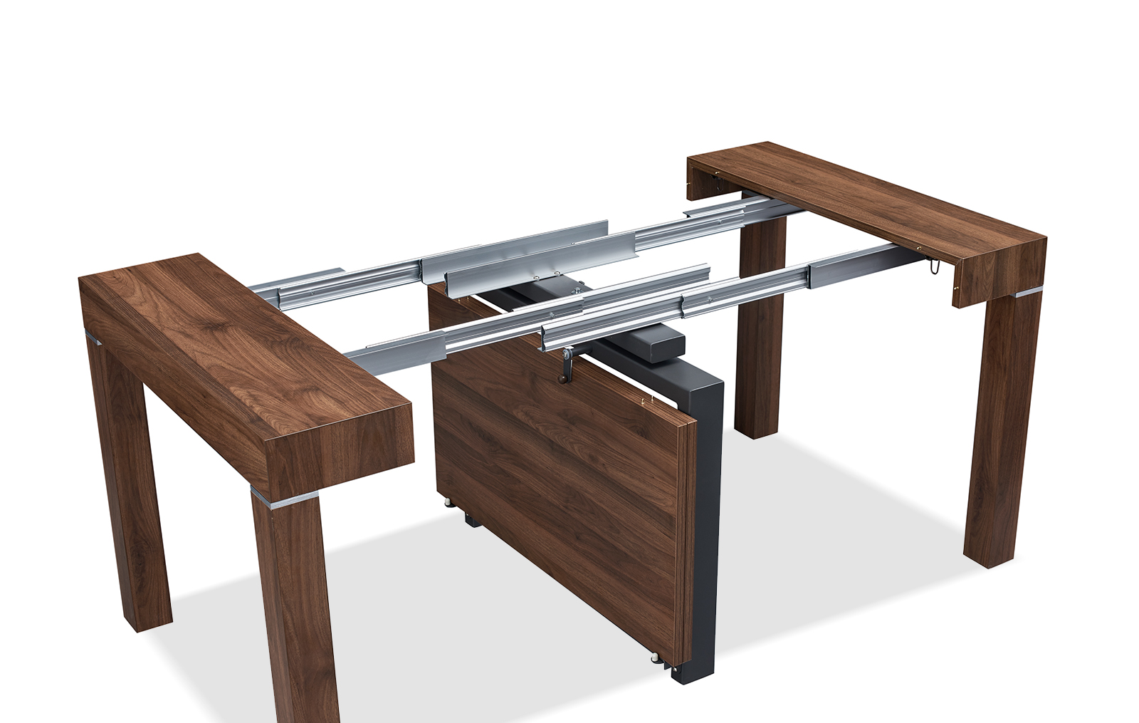 Стол прямоугольной формы в сложенном виде не превосходит по размерам пристенную консоль. В разложенном виде он становится удобным для размещения 6-10 человек. Модель смотрится дорого и солидно за счет текстуры ореха.