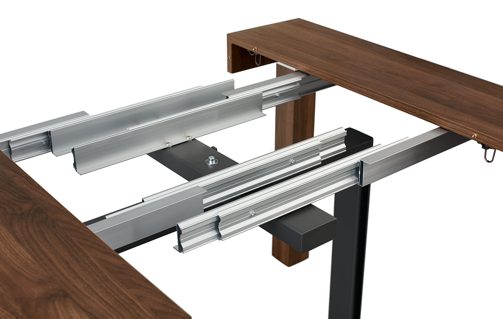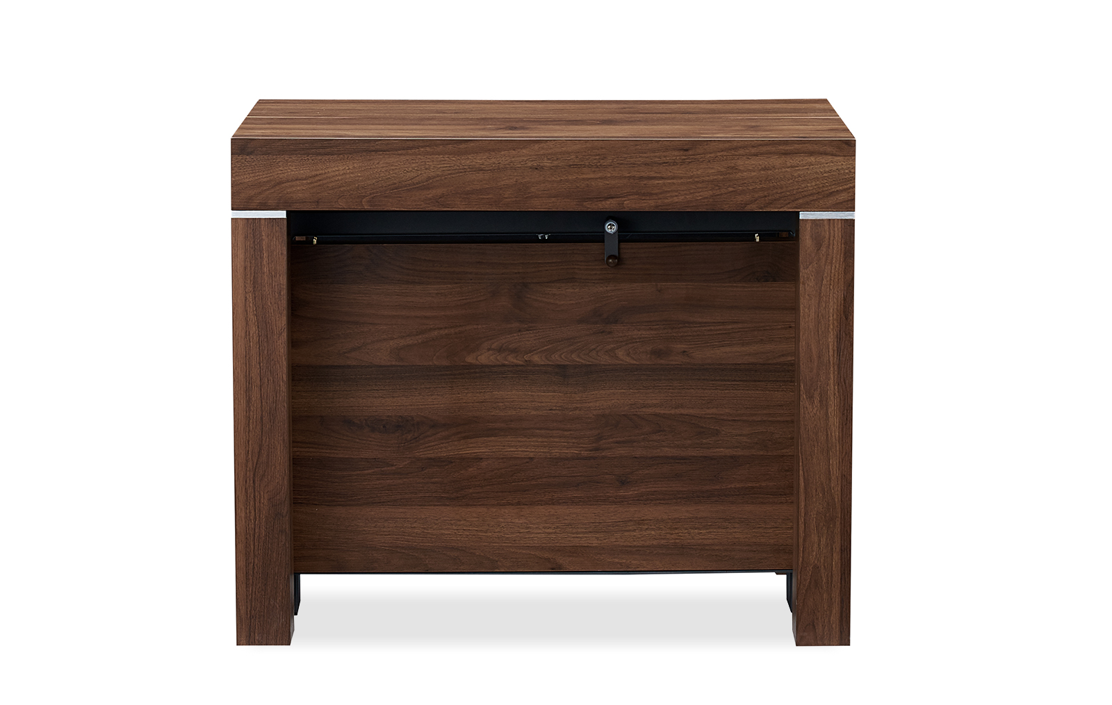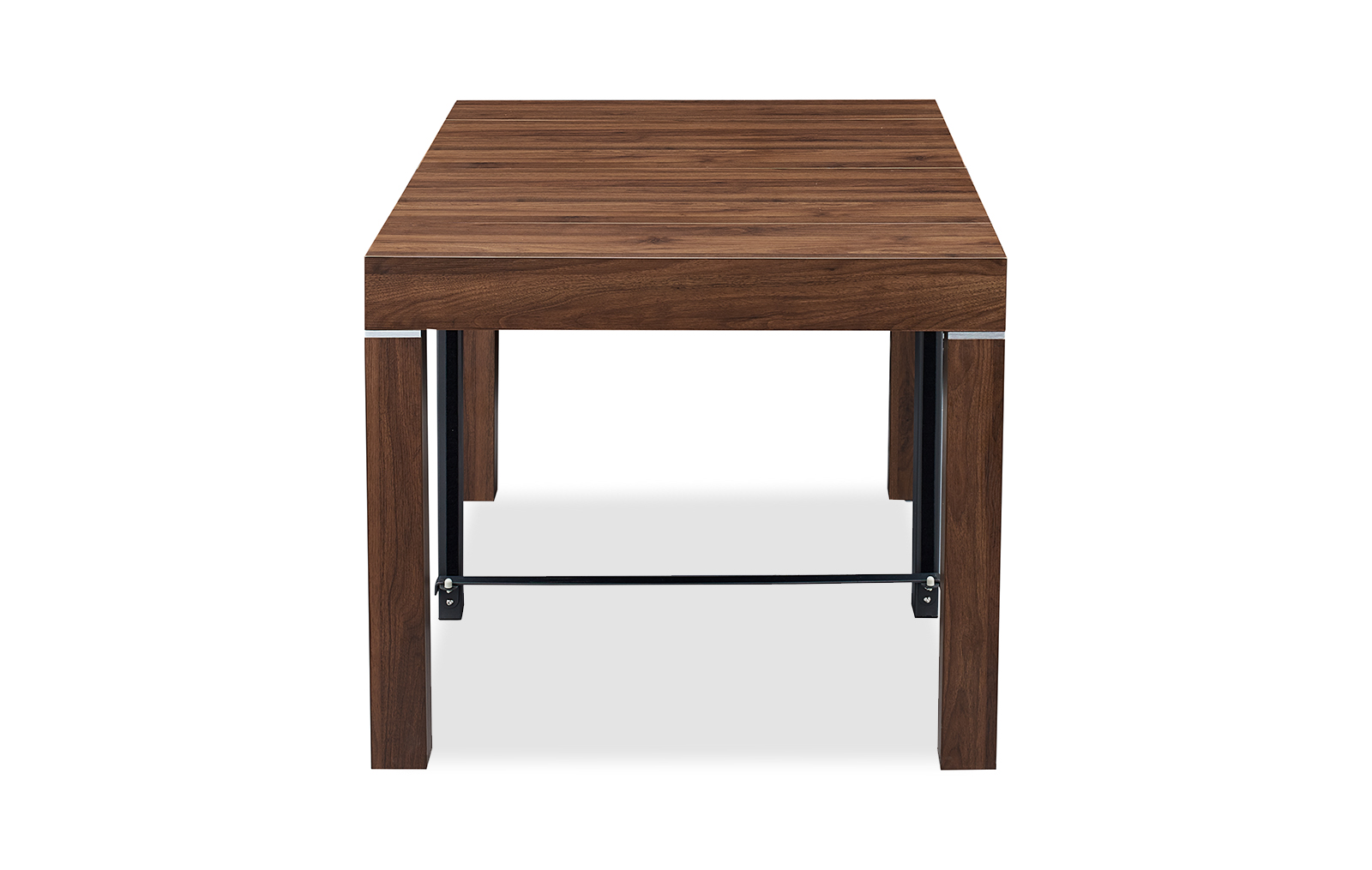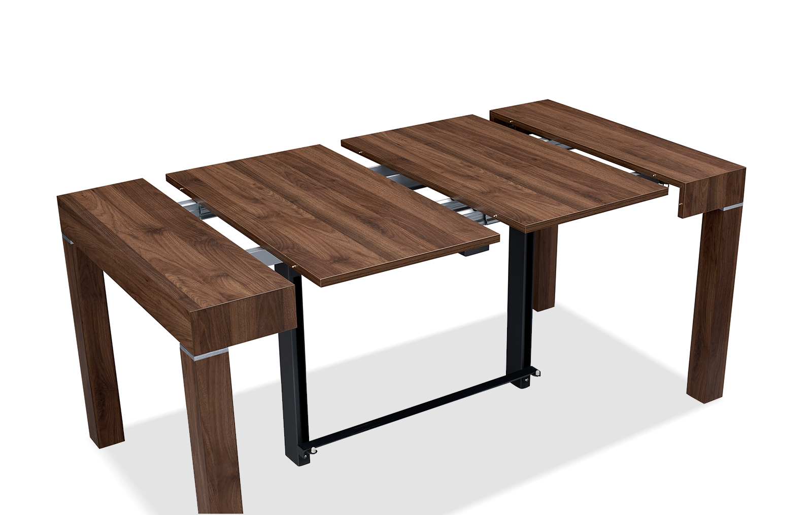 Стол прямоугольной формы в сложенном виде не превосходит по размерам пристенную консоль. В разложенном виде он становится удобным для размещения 6-10 человек. Модель смотрится дорого и солидно за счет текстуры ореха.