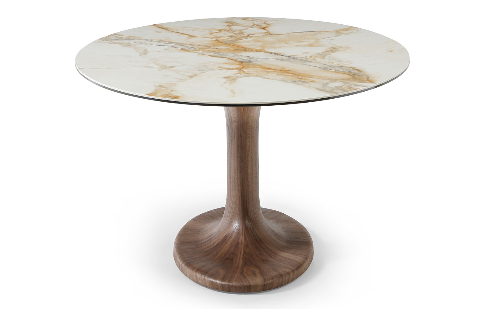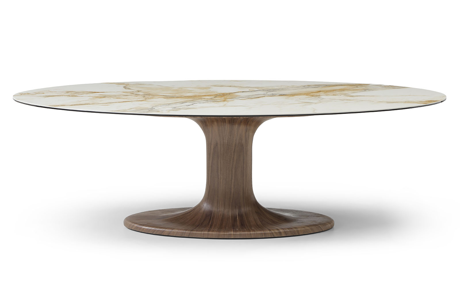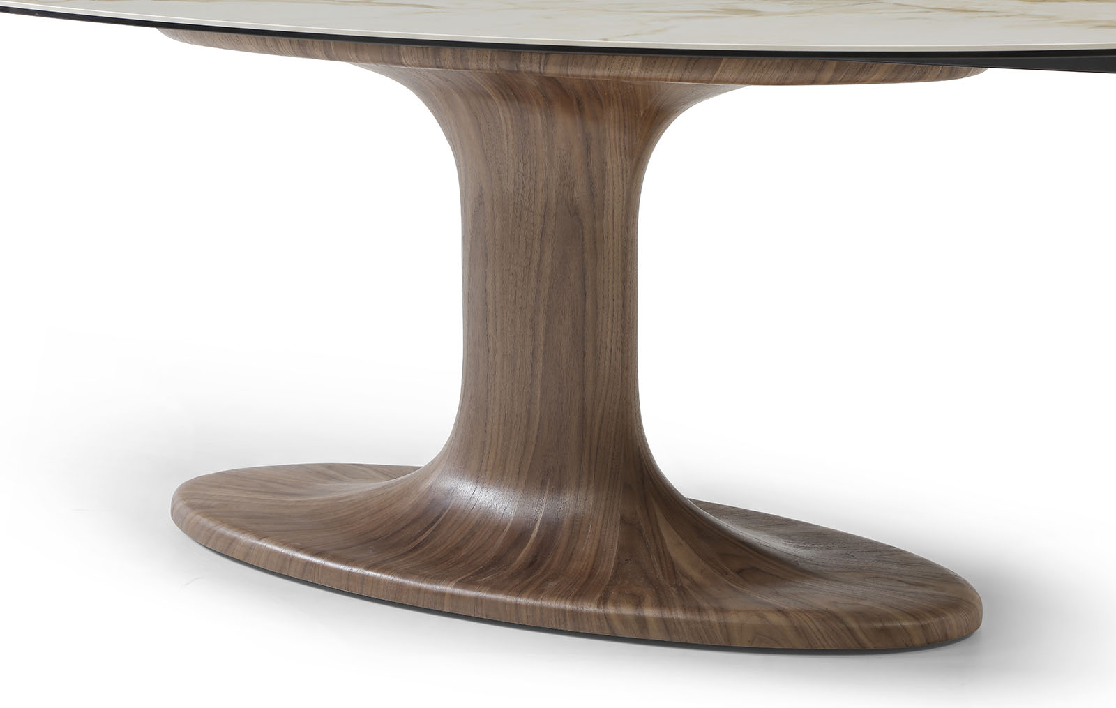 Основание стола изготовлено из прочного стекловолокна и покрыто натуральным шпоном ореха. Теплая текстура древесины подчеркивает благородный характер модели и придает интерьеру статусность. Центральная опора обеспечивает устойчивость и удобство размещения стульев по периметру.