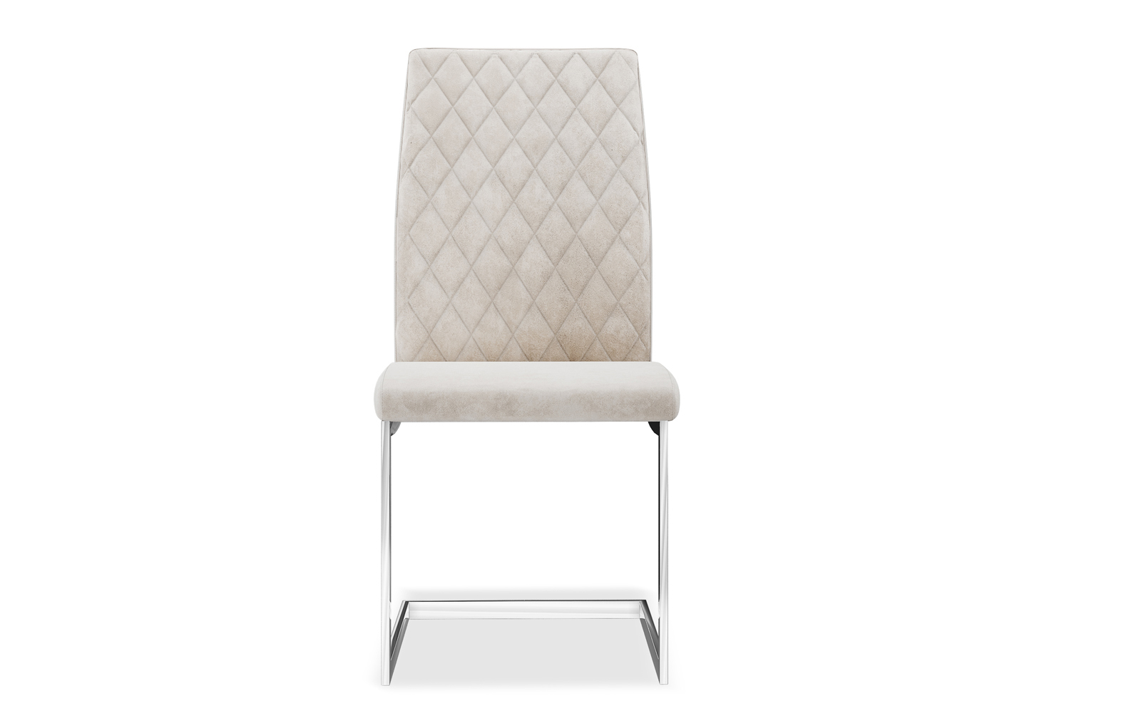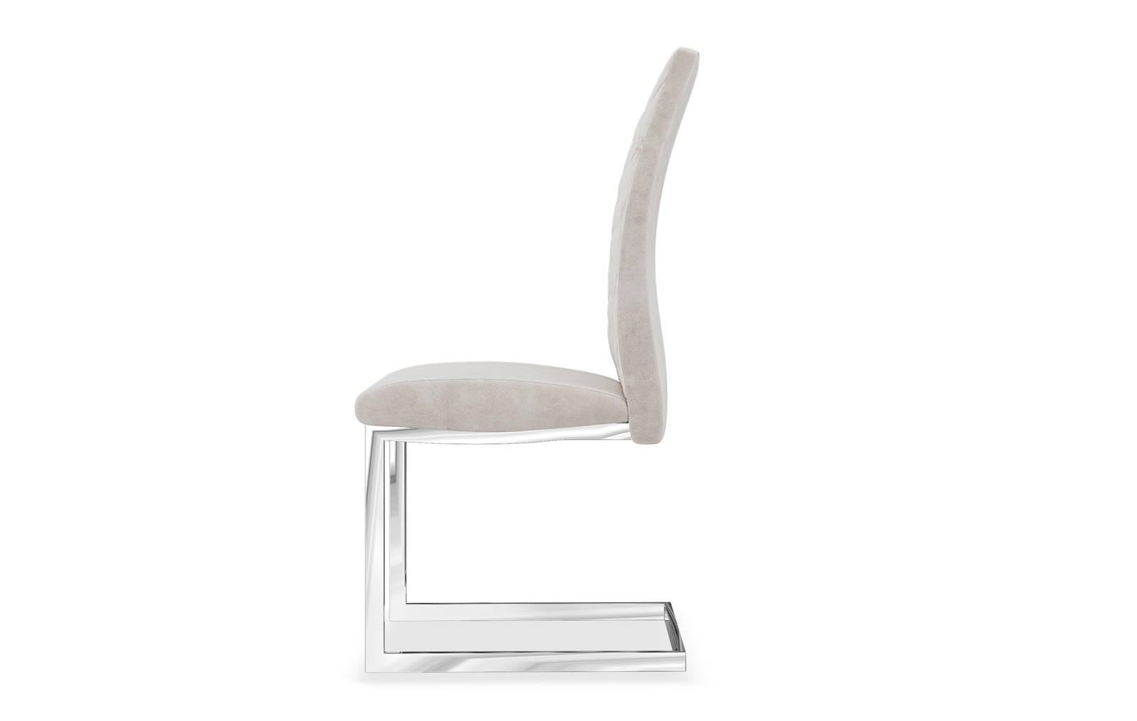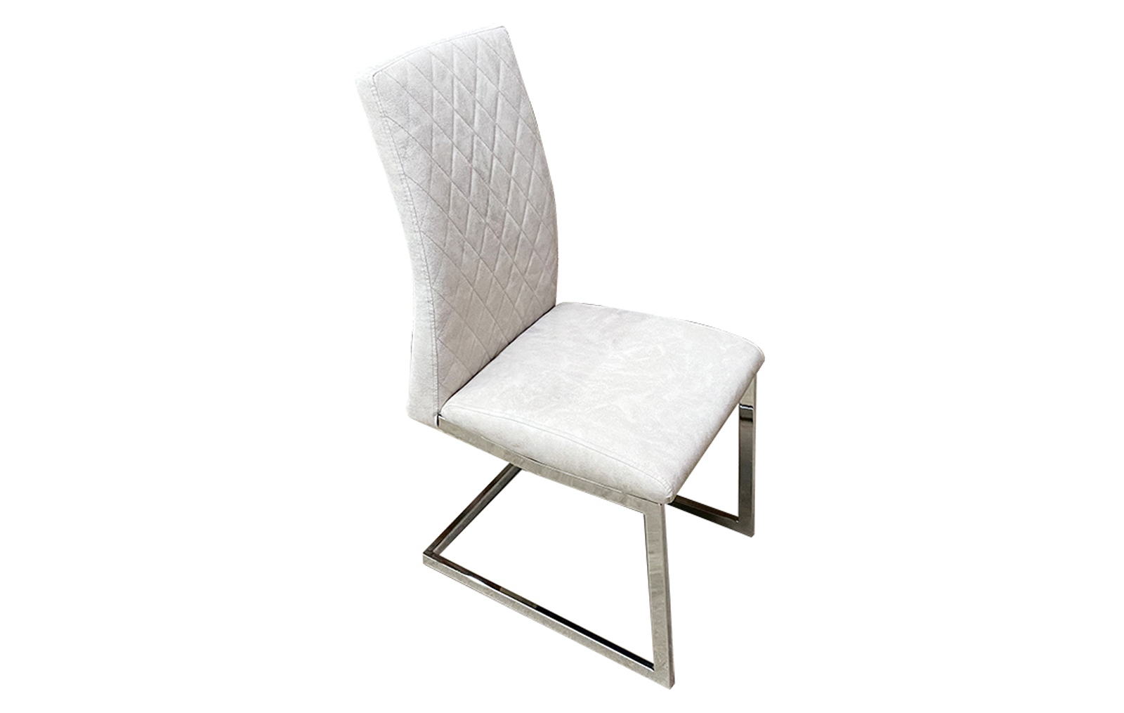 Белая столешница с мраморной текстурой сделана из искусственного камня, благодаря чему является износостойкой и устойчивой к внешним воздействиям. Стулья нейтрального серо-бежевого цвета с удобной высокой спинкой обиты эконубуком.