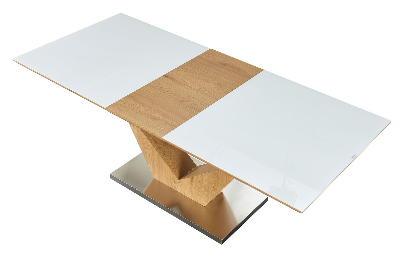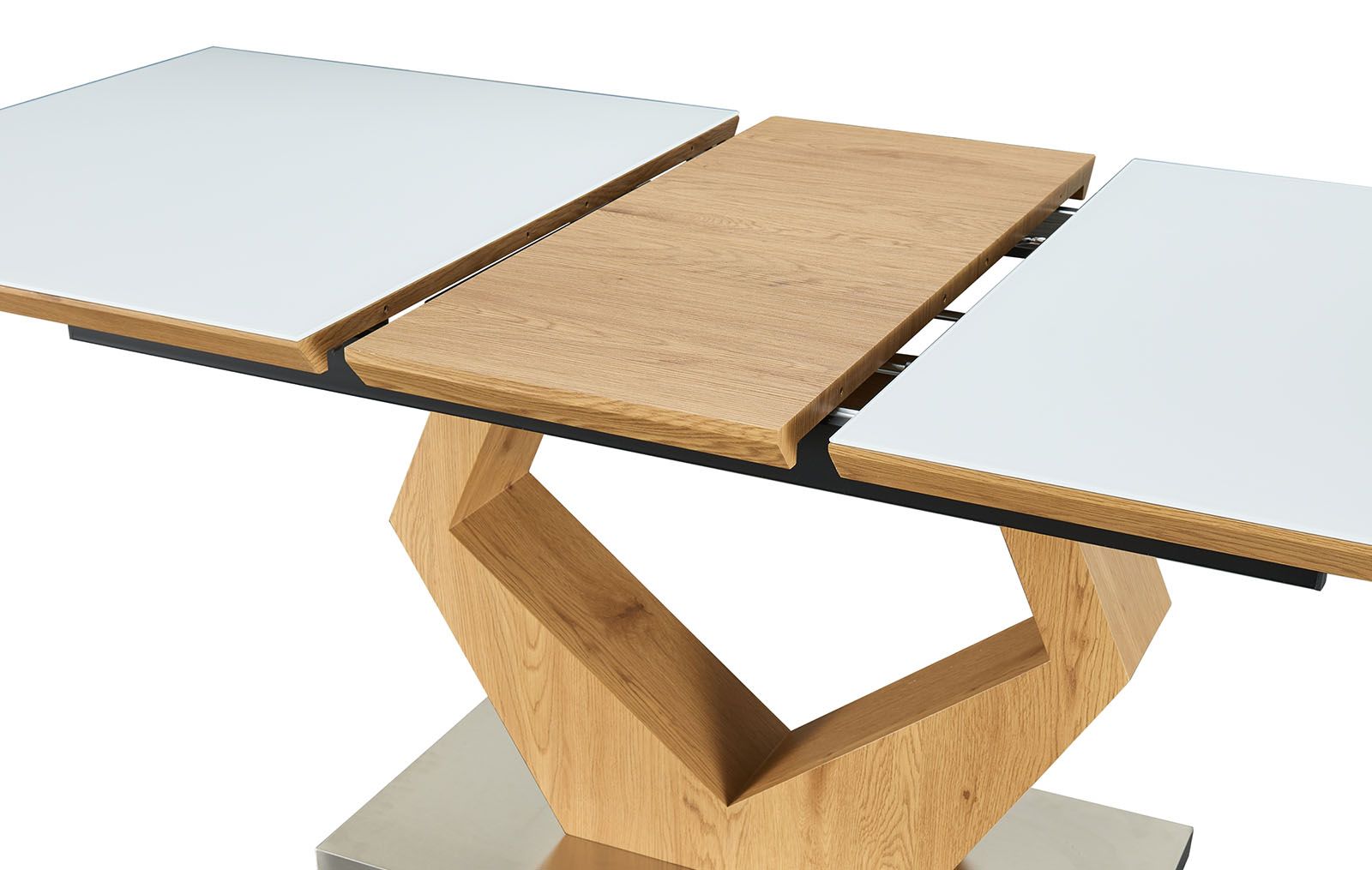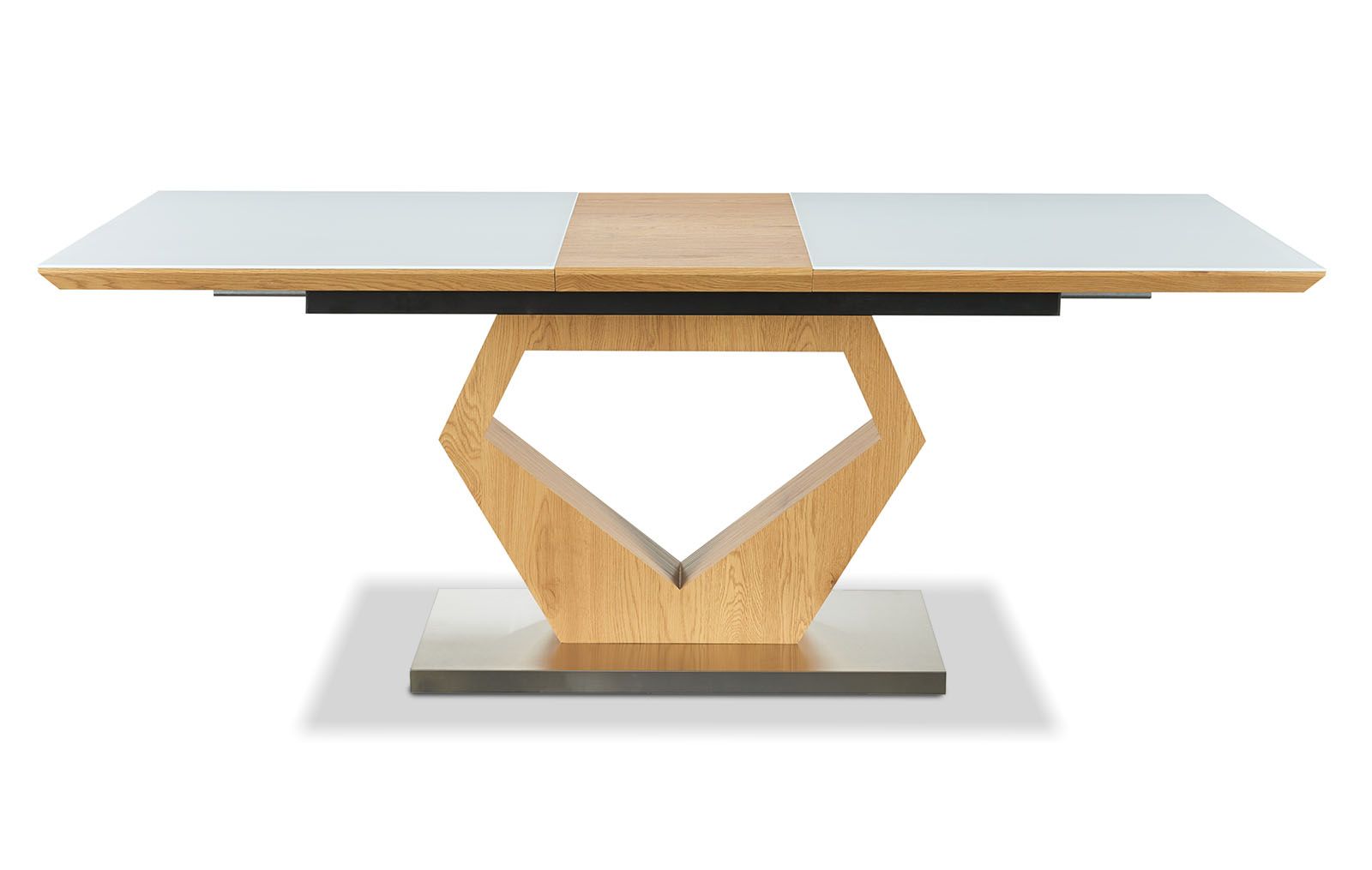 Стол раскладной Diamond (Даймэнд) отличается оригинальным дизайном. Его необычное пятиугольное подстолье изготовлено из МДФ с меламиновым покрытием, прямоугольное основание – из МДФ и нержавеющей стали. Прямоугольная столешница из закаленного стекла раскладывается путем добавления по центру вставки из МДФ с меламиновым покрытием.