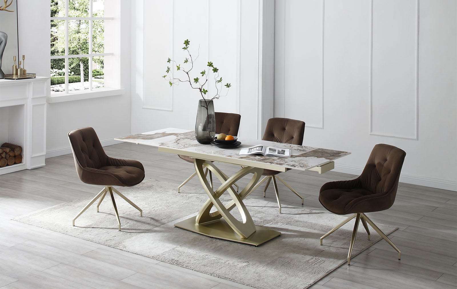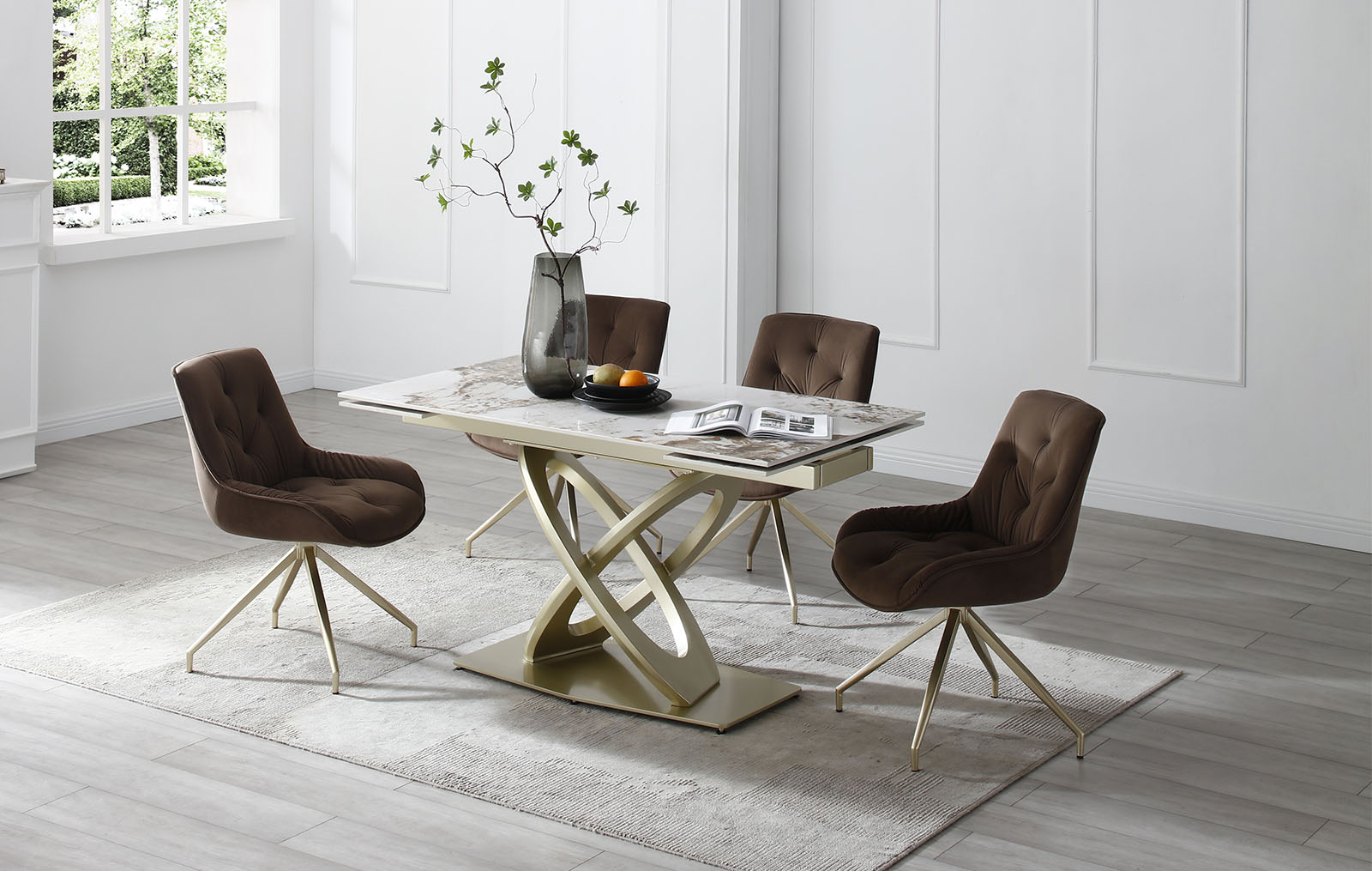 Раскладной обеденный стол Luisa (Луиза) с керамической столешницей на металлическом подстолье в цвете золотистый шампань.