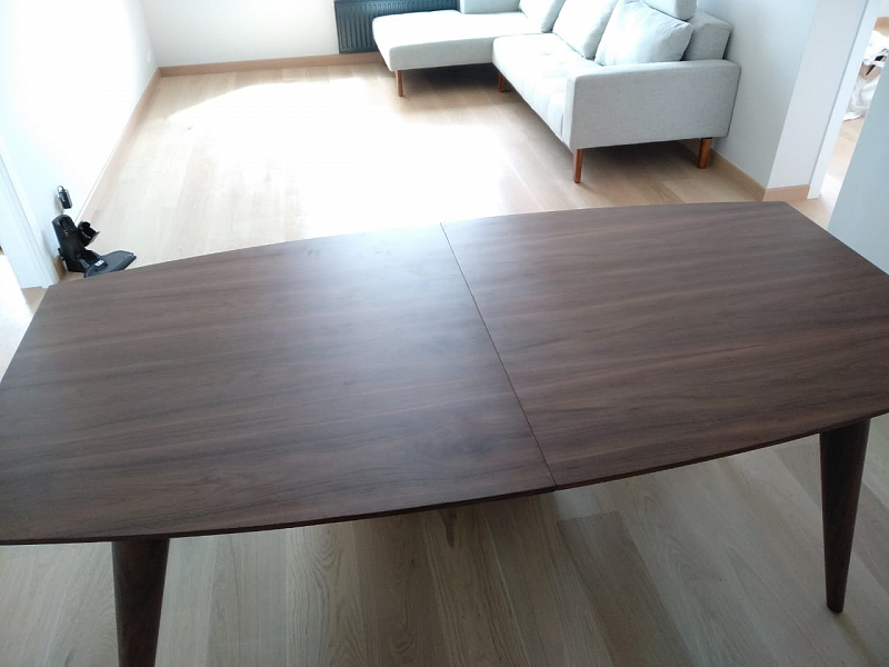 Стол обеденный раскладной на ножках из дерева, декорированный натуральным шпоном ореха. Длина стола 180 см, раскладывается до 220 см с помощью дополнительной вставки 40 см. Толщина столешницы 25 мм.
