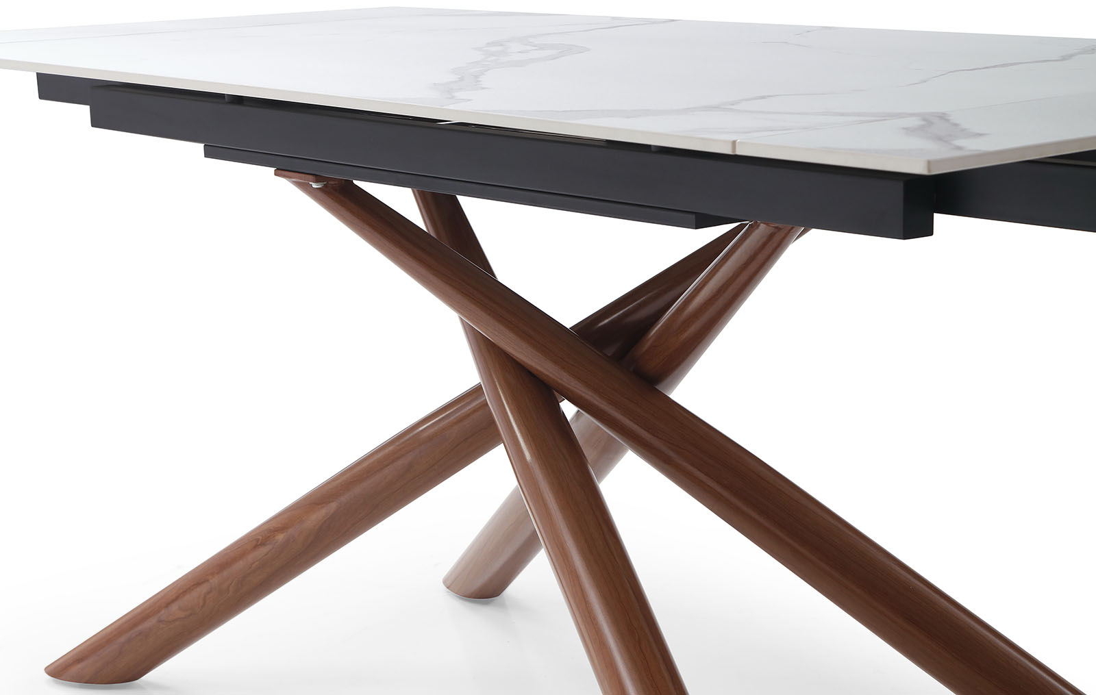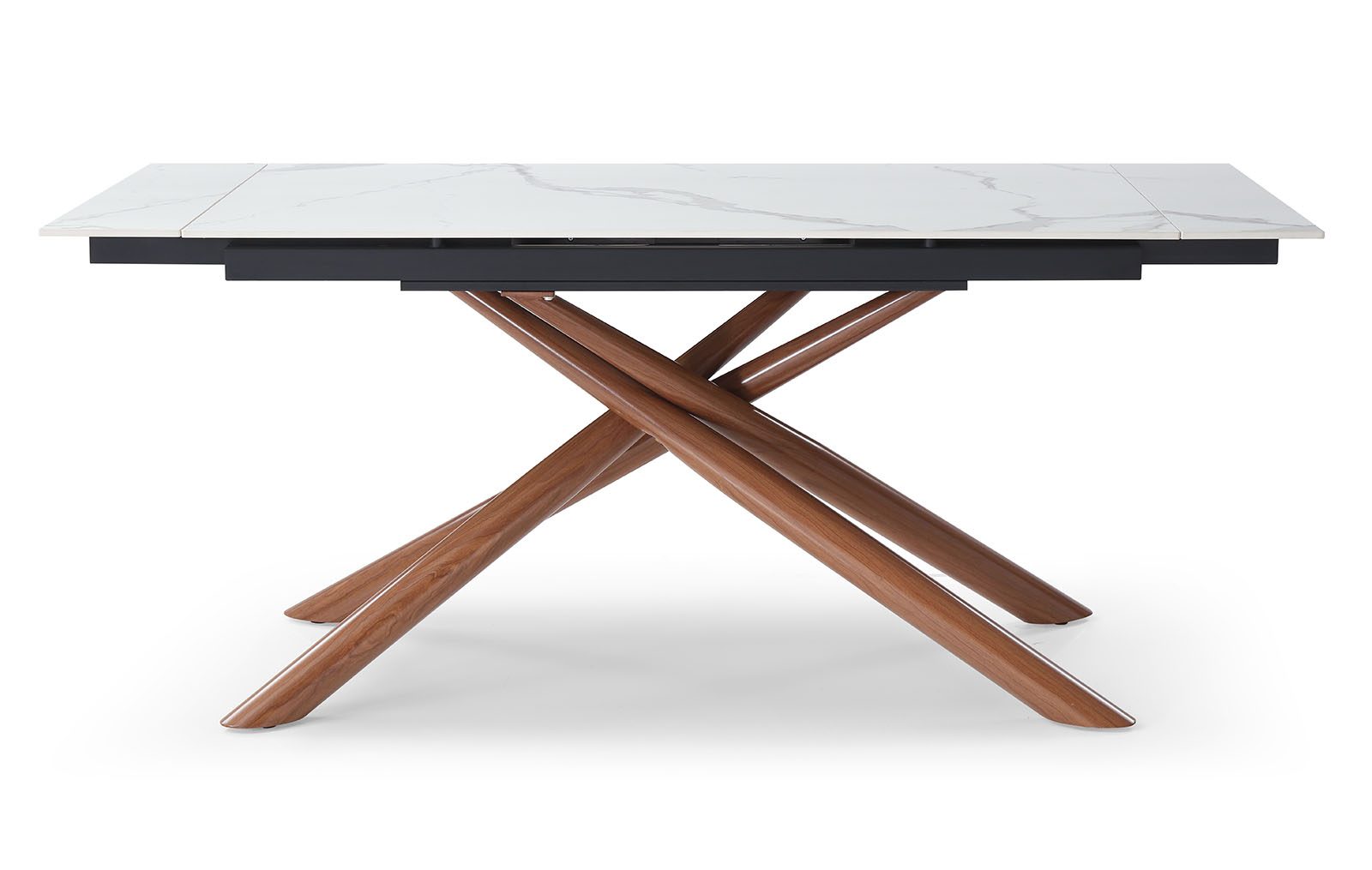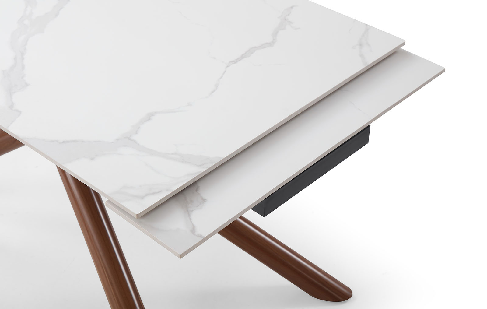 Светлая столешница из керамики, износостойкого материала, устойчивого к внешнему воздействию, имеет регулируемую длину и может раздвигаться, в зависимости от модели, со 140 см до 180 см или со 160 см до 220 см, или со 180 см до 240 см. Это дает возможность выбрать подходящий вариант для помещения любого размера.