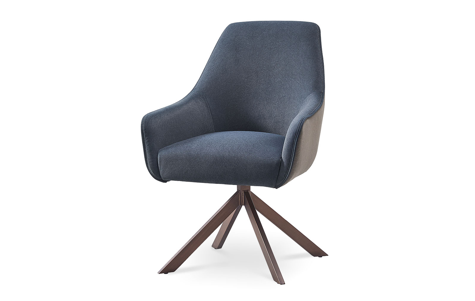 Обеденный стул Emma может вращаться на 180° и самостоятельно возвращаться в исходное положение, благодаря поворотно-возвратному механизму. Обивка стульев изготовлена из велюра в комбинации двух цветов, ножки стульев – из металла.