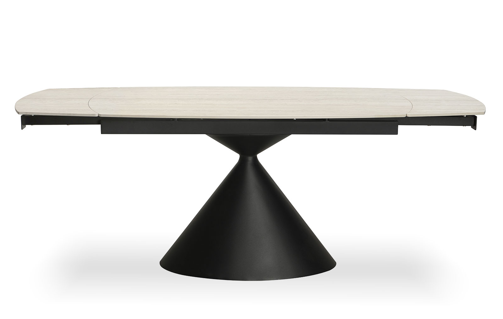 Стол имеет 2 вставки по 30 см, которые удобно убираются под столешницу. Механизмы торцевого раздвижения позволяют легко раскладывать и складывать эту модель.