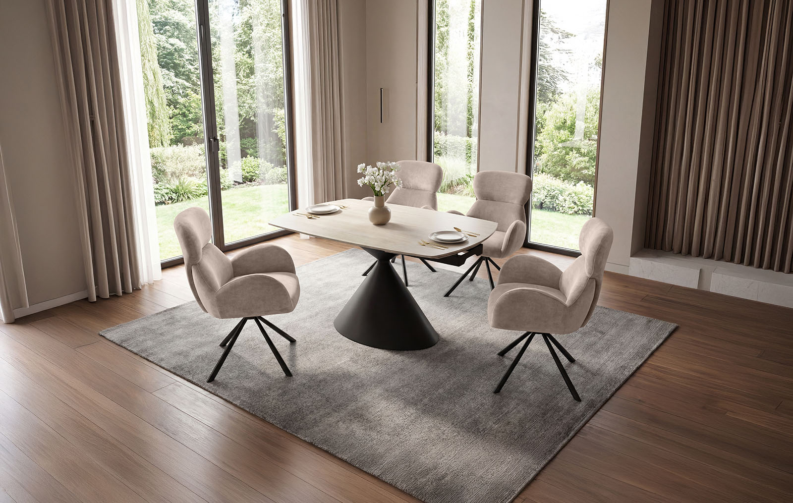 Обеденная группа из раскладного стола Sylvia (Сильвия) и четырех стульев Kira (Кира) отличается элегантным цветовым решением и практичностью.
