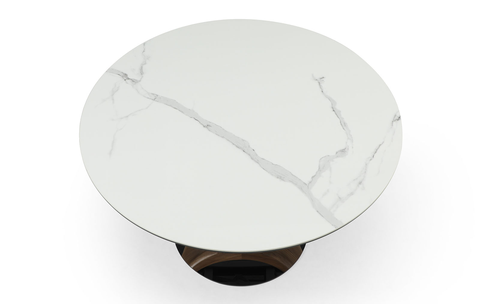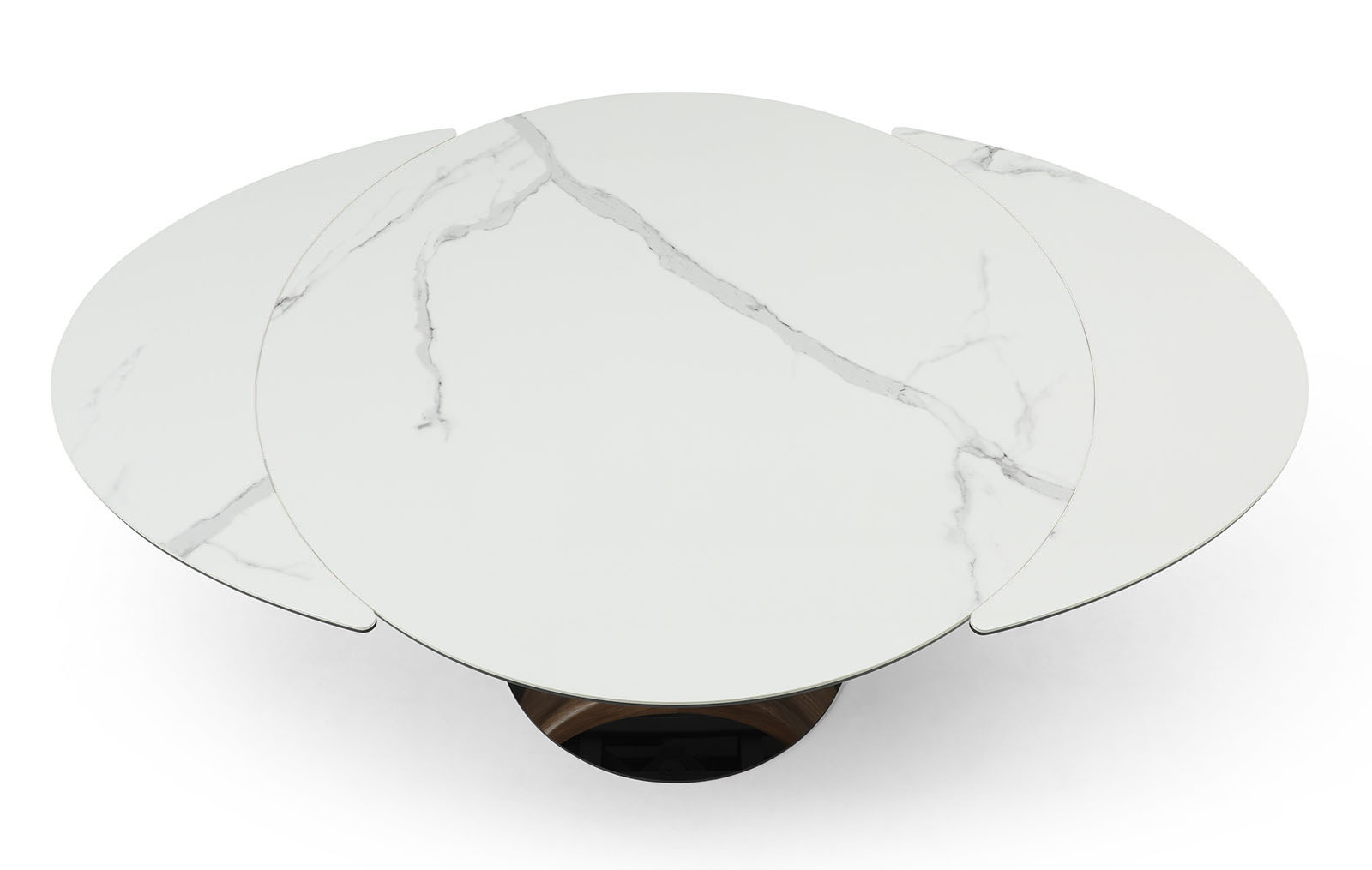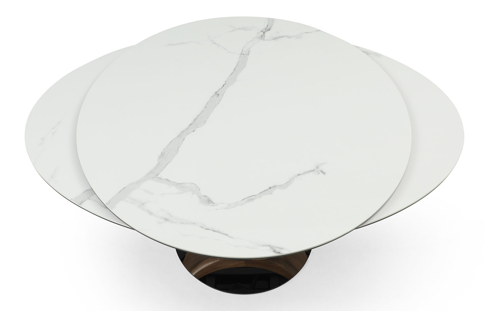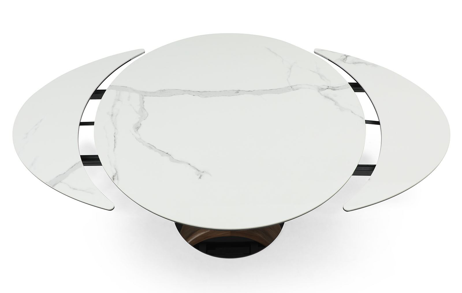 Круглая столешница из керамики и стекла имеет общую толщину 14 мм и диаметр 120 см в сложенном виде. При раскладывании длина стола увеличивается до 180 см. Две дополнительные выдвижные поверхности удобно прячутся под столешницей. Ножка причудливой изогнутой формы – из шпона ореха и стекловолокна, круглое основание – из нержавеющей стали.