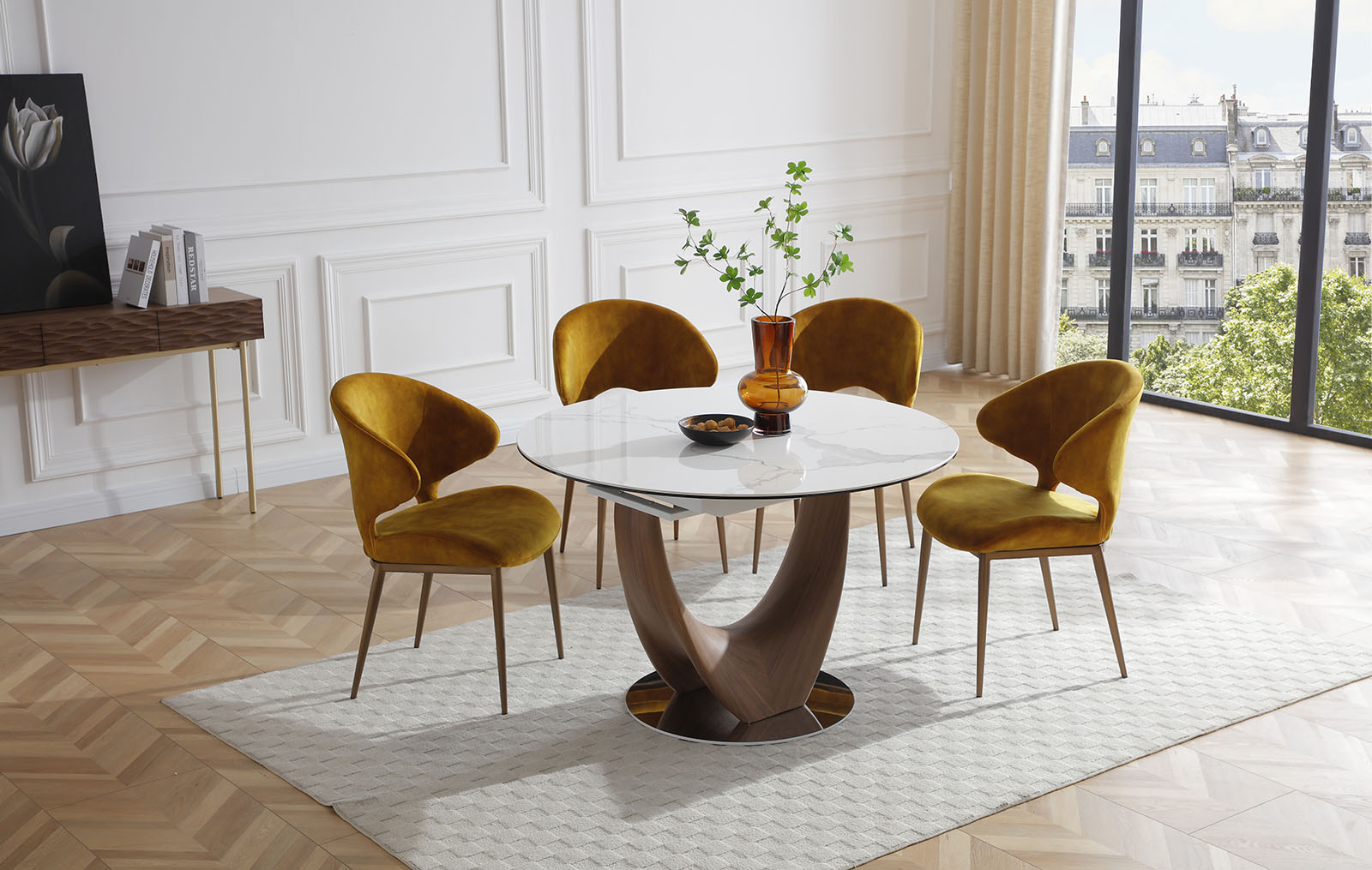 Комплект состоит из круглого раздвижного стола Triumph (Триумф) и стульев Una (Уна).
