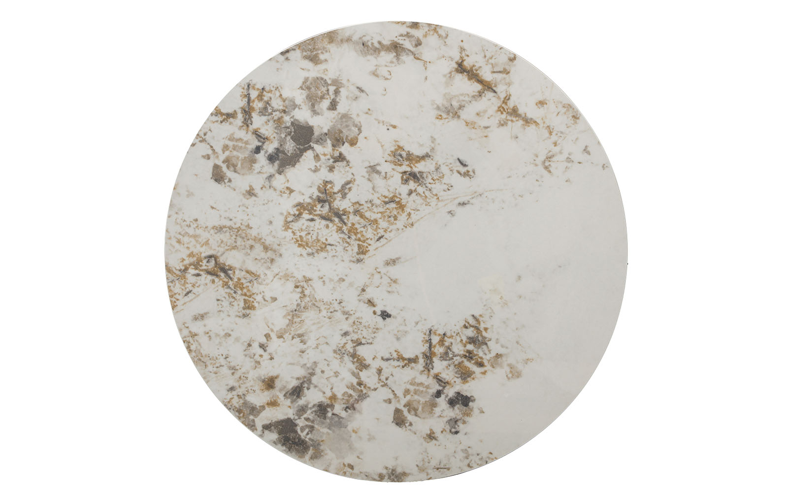 Круглая столешница общей толщиной 14 мм состоит из матовой керамики толщиной 6 мм и закаленного стекла толщиной 8 мм.