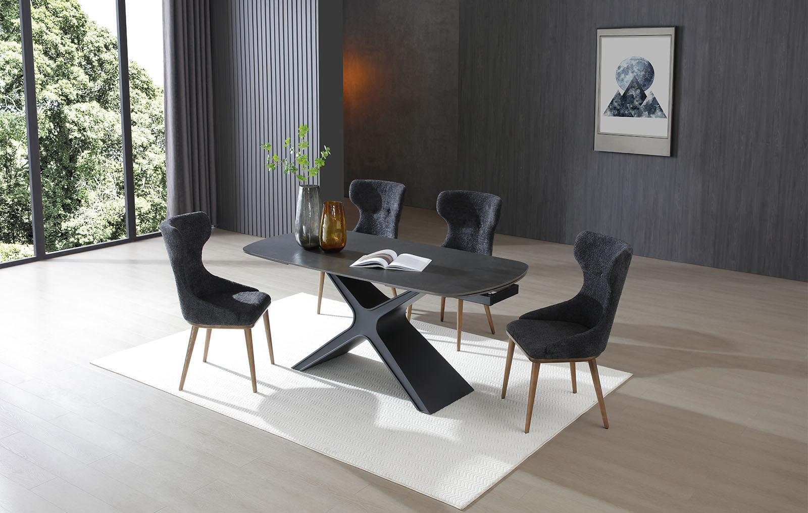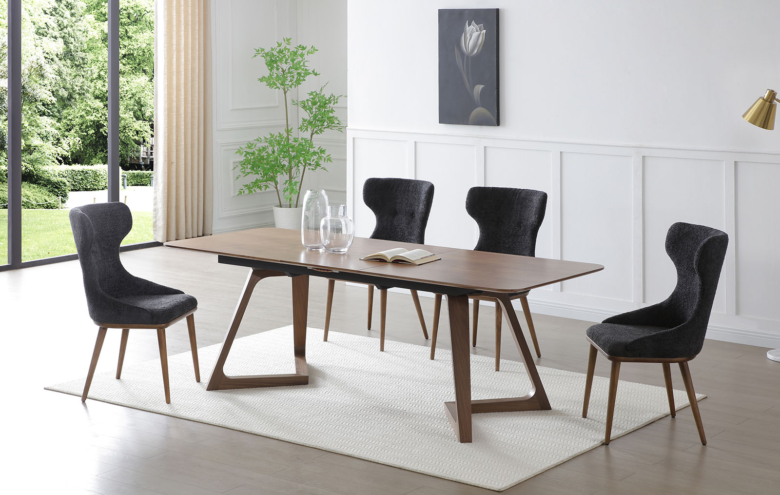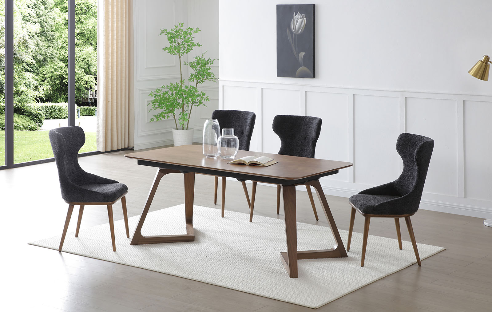 Обеденный стул Augusta (Августа) имеет обивку из ткани графитового оттенка и ножки из дерева в оттенке ореха.