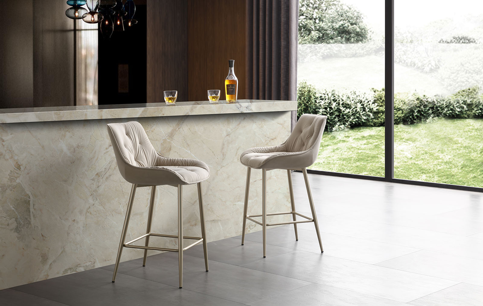 Стулья барные Joely Bar (Джоэли Бар) с простеганным сиденьем обивкой из бежевого велюра станут украшением интерьера кухни или гостиной. Ножки выполнены из металла и окрашены в цвет золотистый шампань.