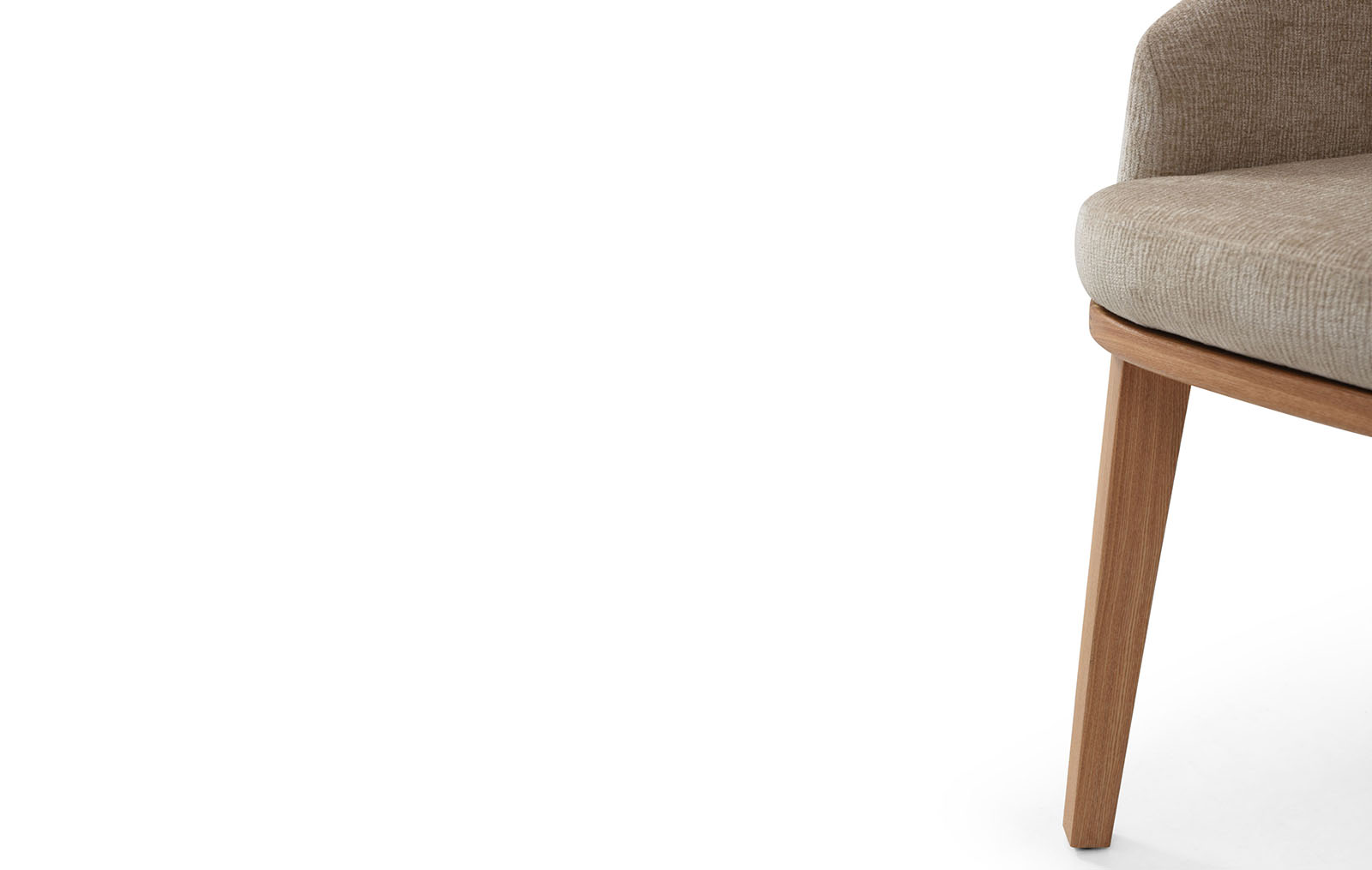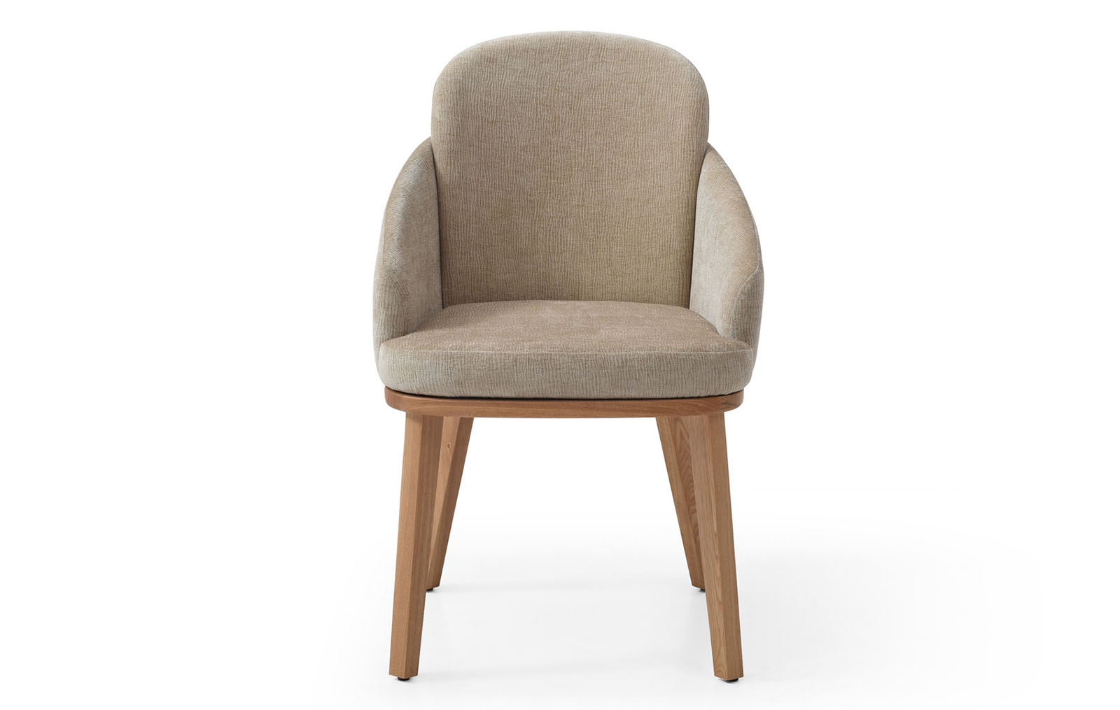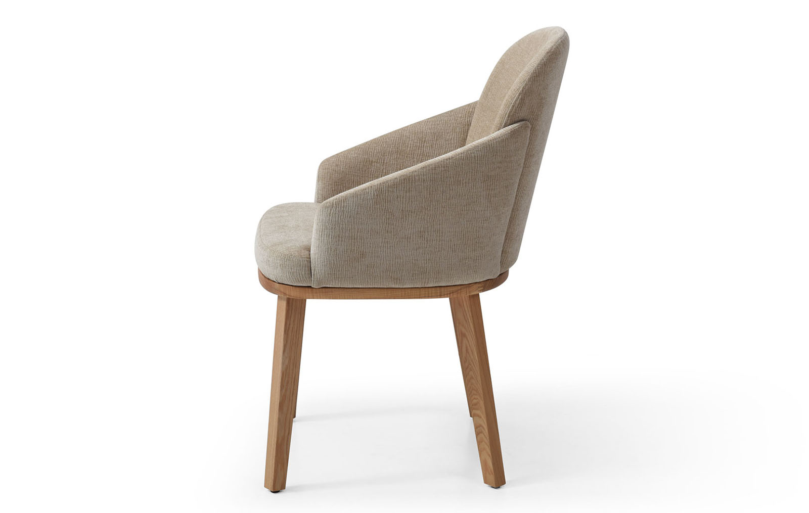 Обеденный стул Clarissa (Кларисса) имеет обивку из фактурной бежевой ткани и ножки из дерева, тонированные в оттенок ореха.