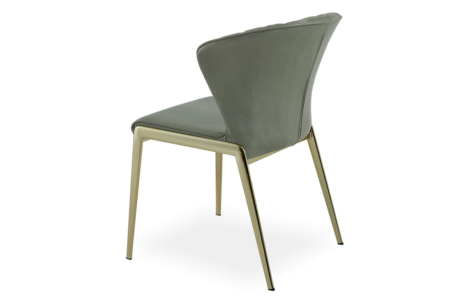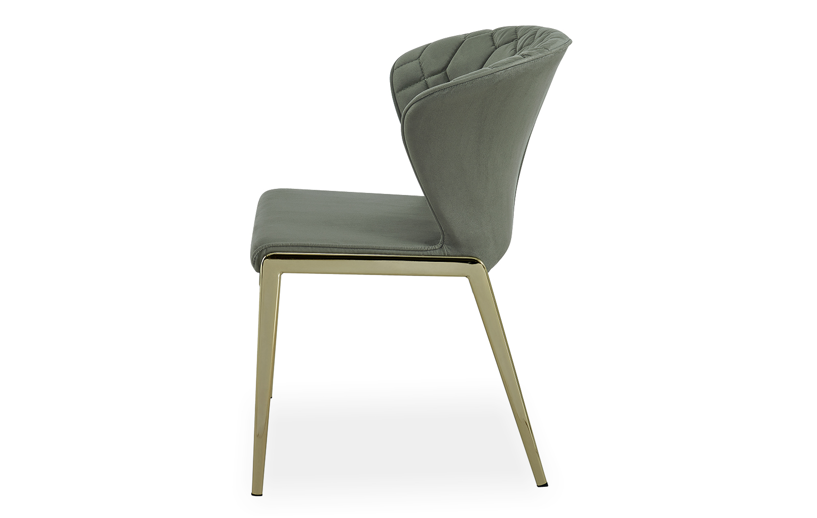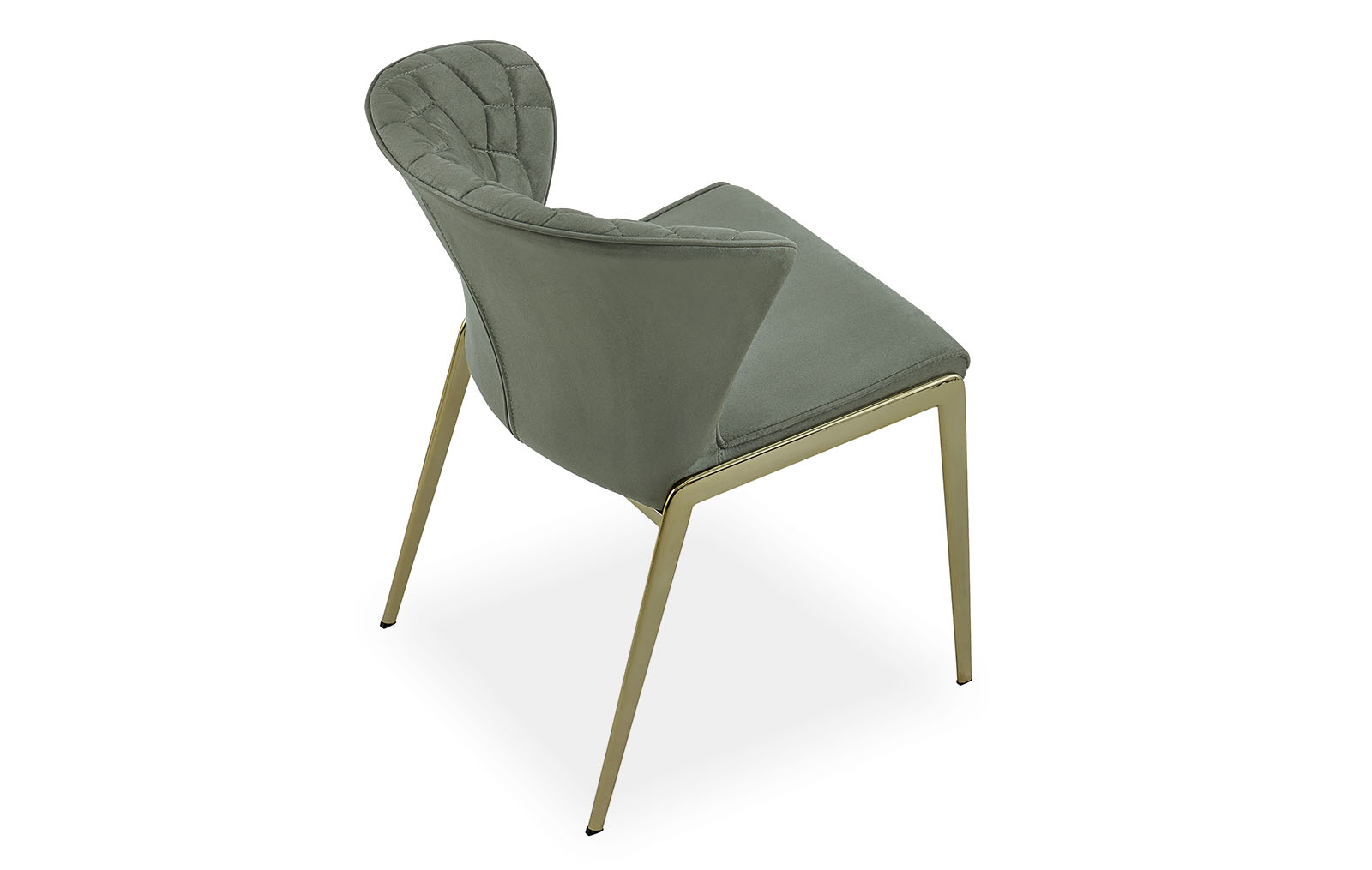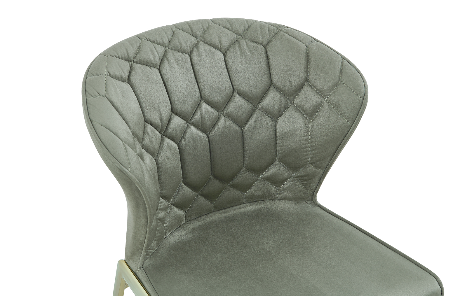 В основе стула – прочная рама цвета глянцевый золотистый шампань из нержавеющей стали. Темно-зеленая обивка декорирована строчкой.