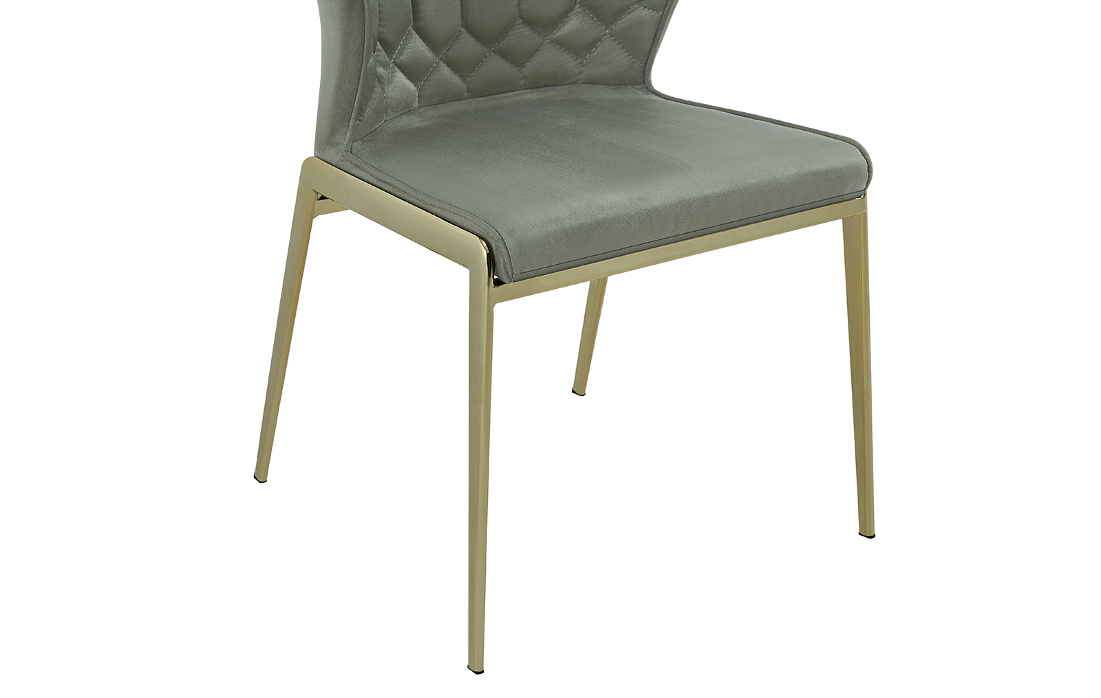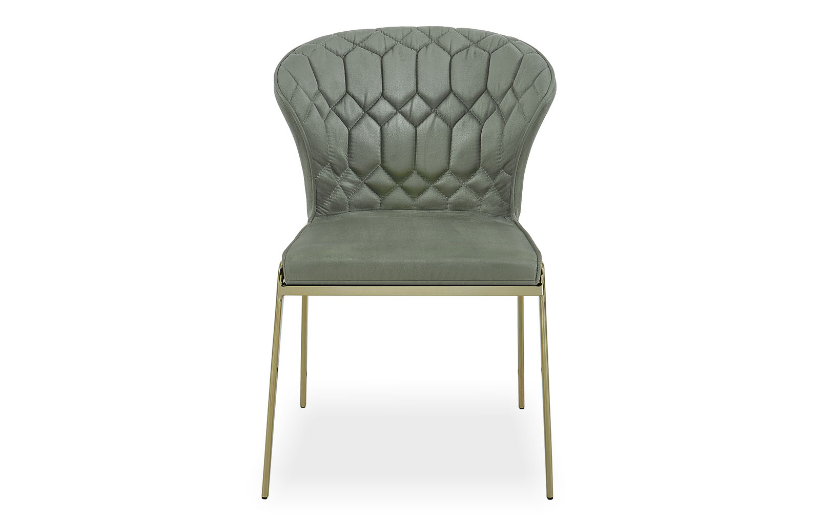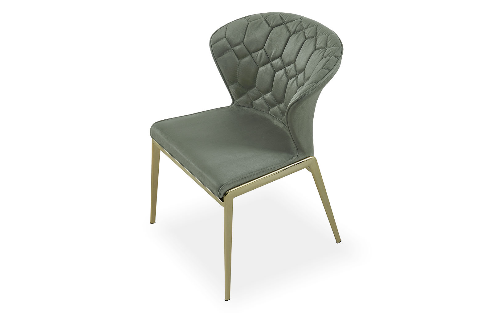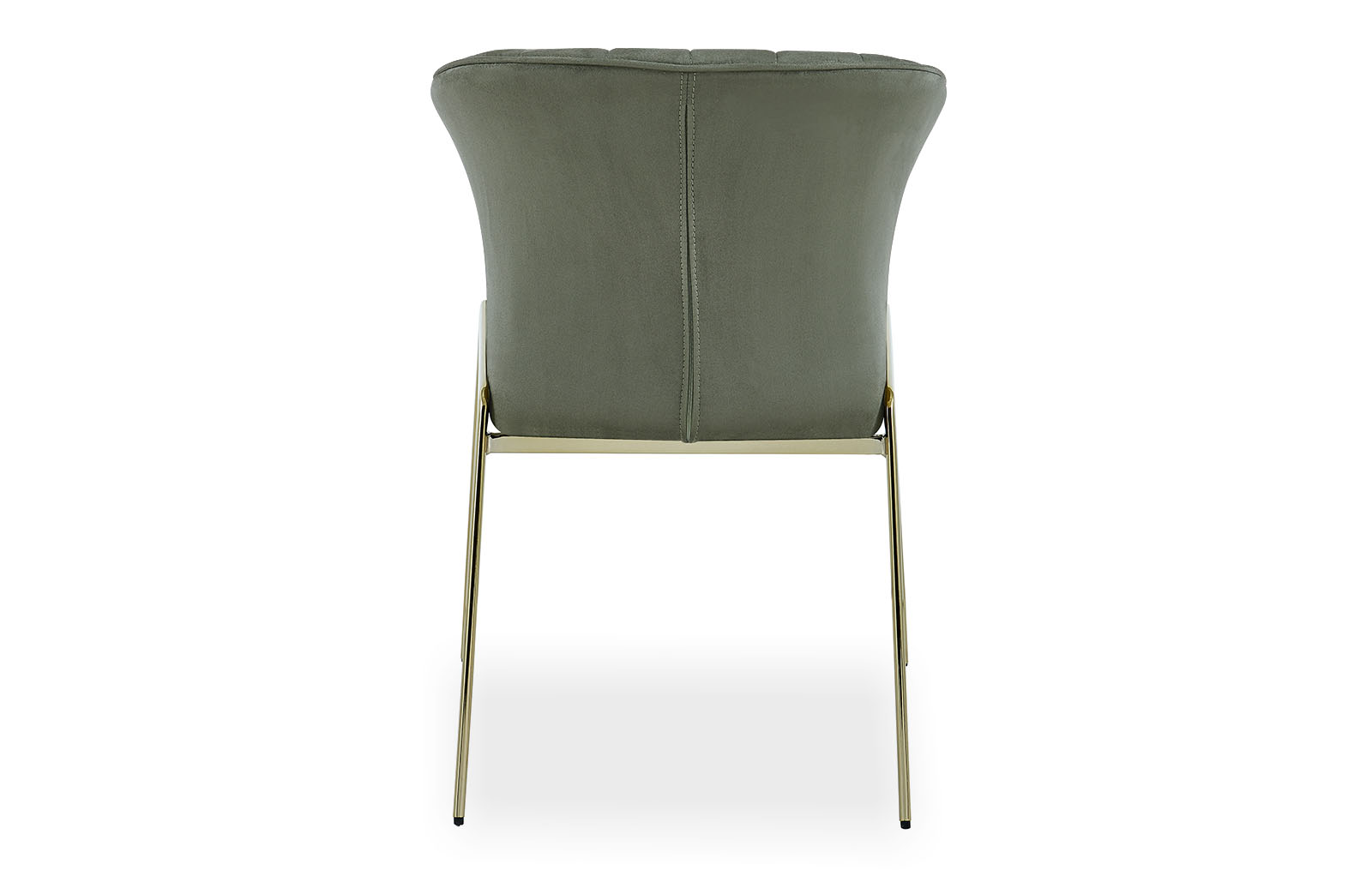 В основе стула – прочная рама цвета глянцевый золотистый шампань из нержавеющей стали. Темно-зеленая обивка декорирована строчкой.