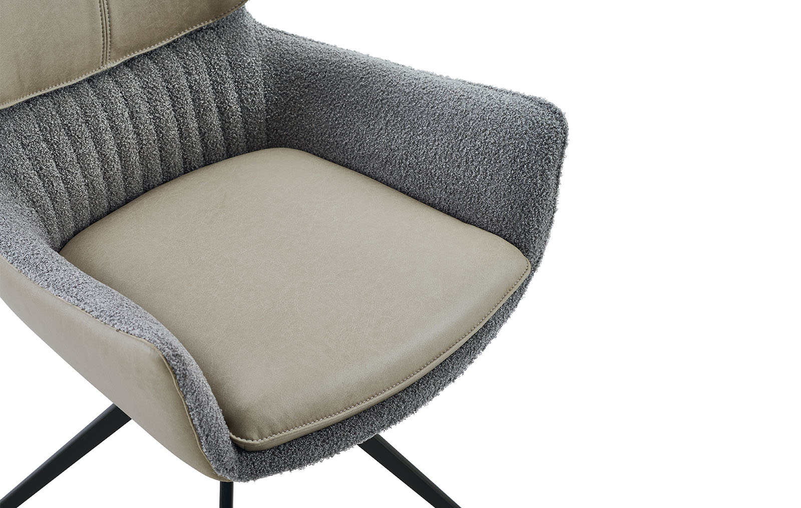 Обивка изготовлена из ткани тедди и экокожи серых оттенков.