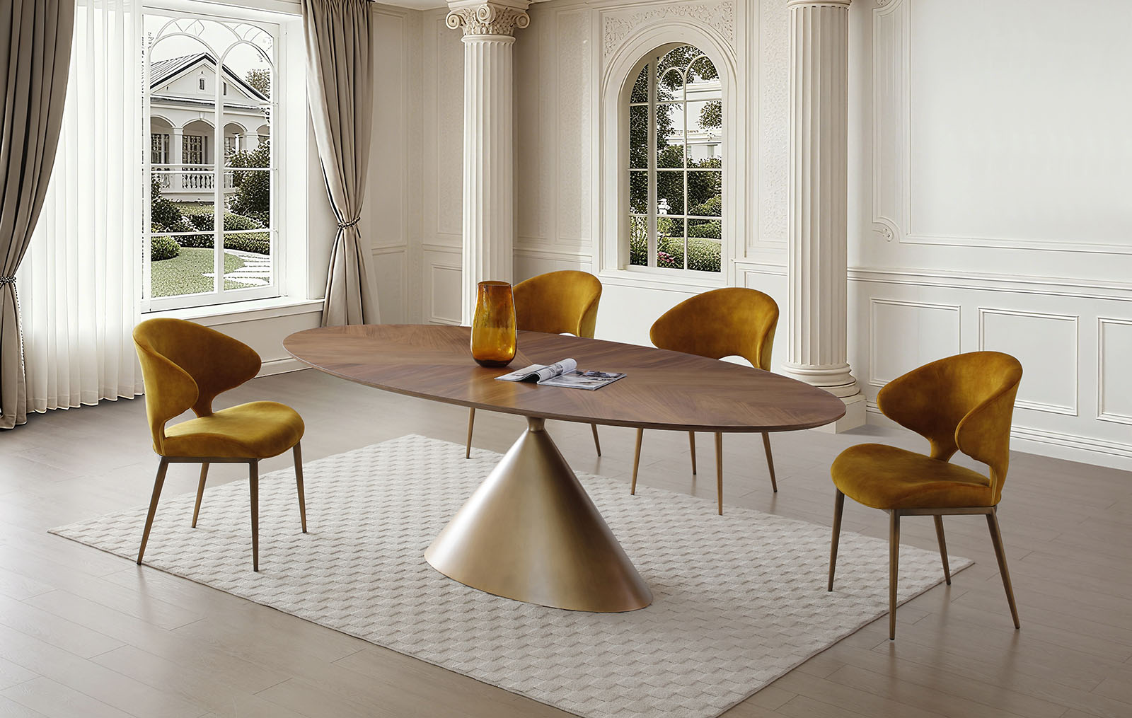Стул Una (Уна) имеет обивку из велюра и металлические ножки. Золотистый оттенок охры добавляет изысканности и тепла в интерьер и гармонично сочетается с ножками в матовом бронзовом оттенке.