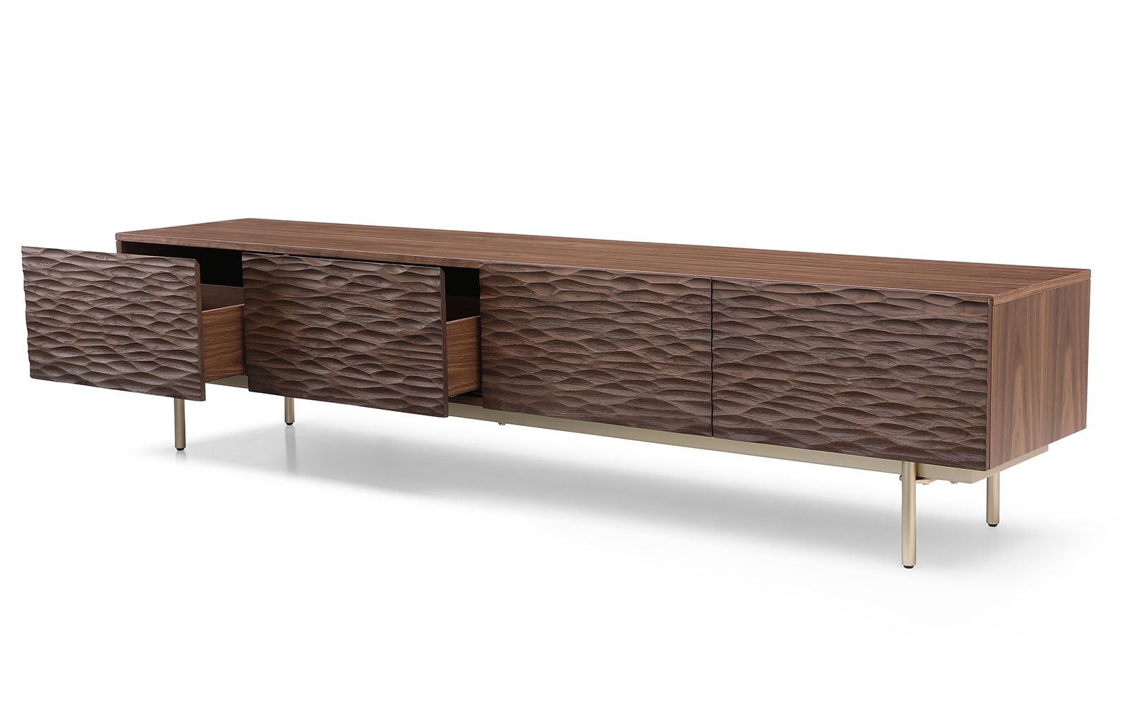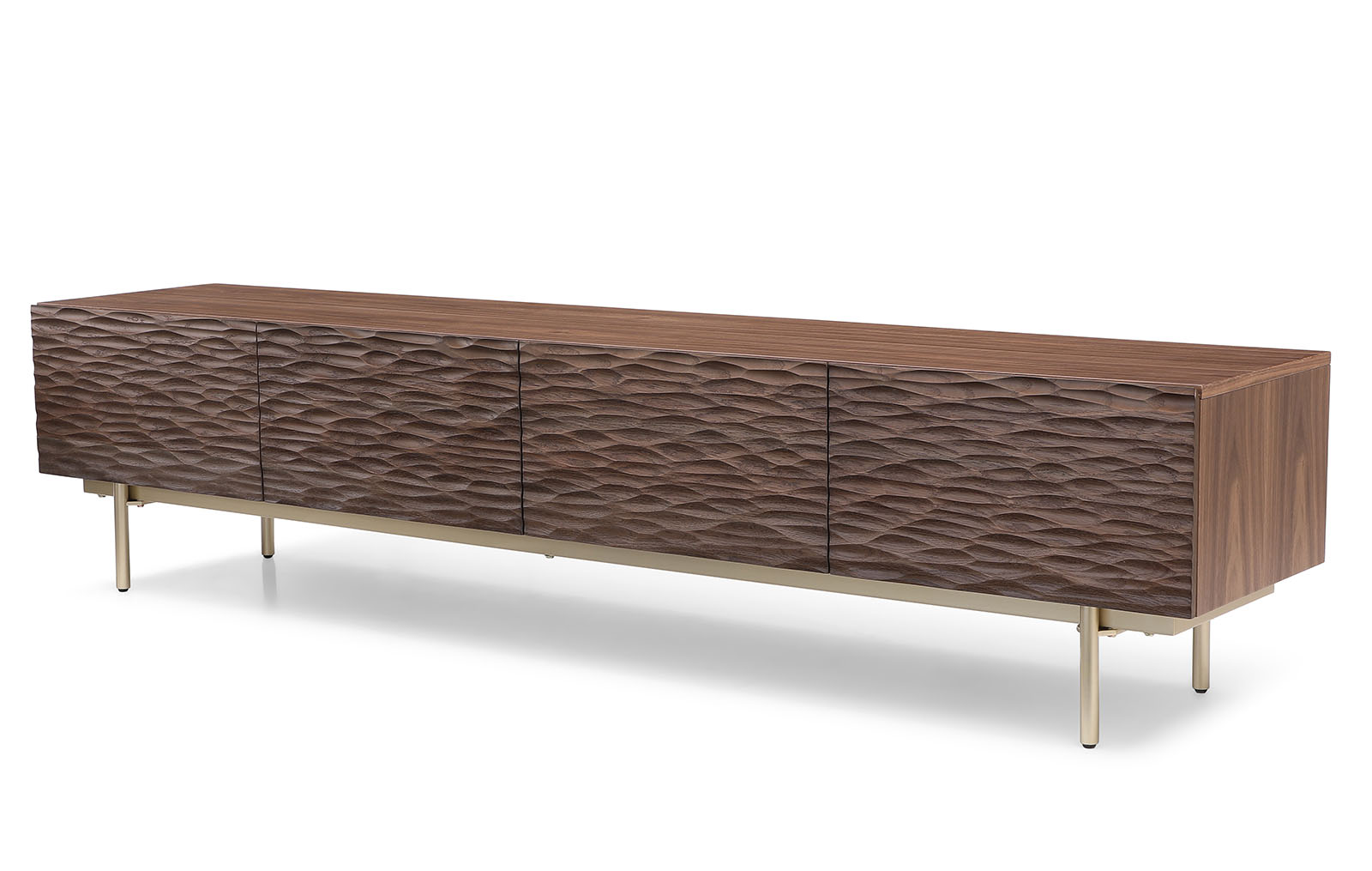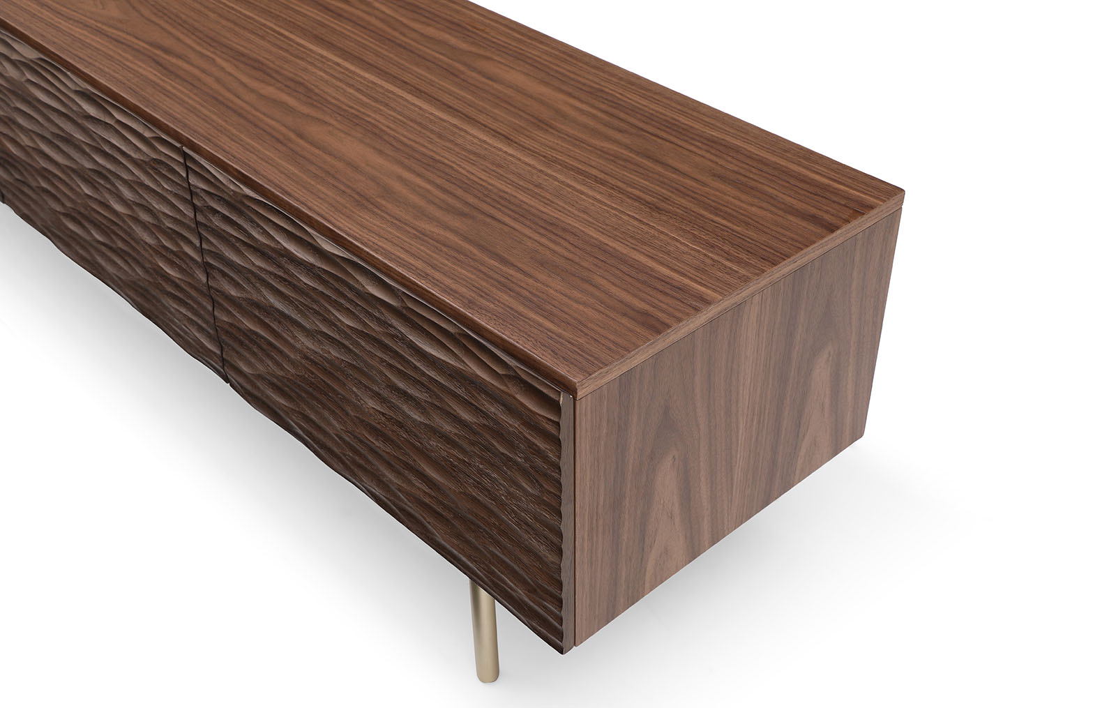 Корпус тумбы выполнен из MDF в натуральном шпоне ореха и декорирован фактурными фасадами с покрытием из резного дерева (массив дуба, тонированный в оттенок ореха).