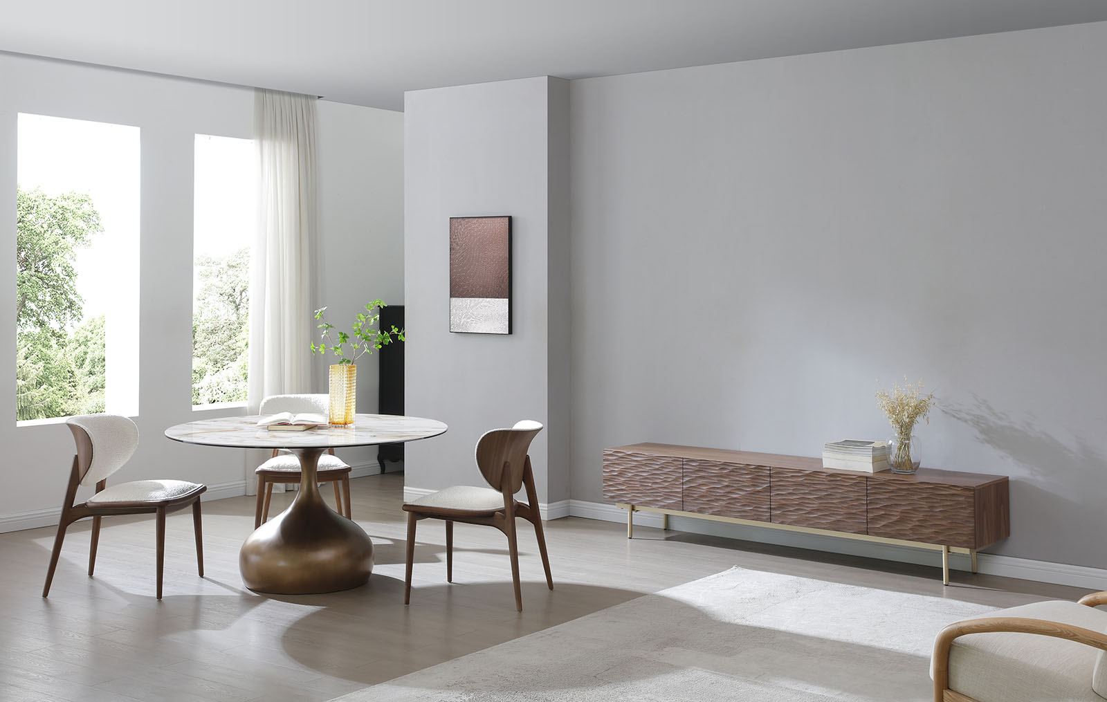 Текстура дерева подчеркивает изысканность интерьера, а золотистый металл добавляет нотку роскоши в обстановку.