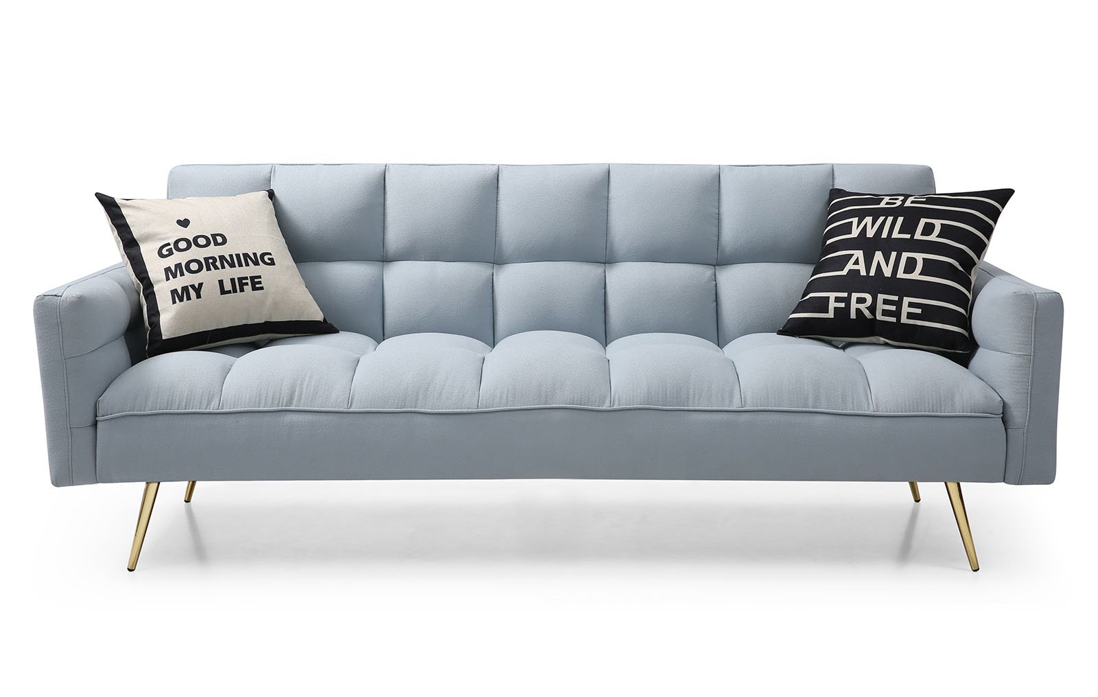 Стильный диван-кровать Madrid (Мадрид) выглядит очень изящным и уютным благодаря высоким тонким металлическим ножкам золотистого цвета и тканевой обивке приглушенного голубого оттенка, простеганной крупными объемными квадратами. В разложенном виде, с откинутой спинкой, диван превращается в комфортную кровать.