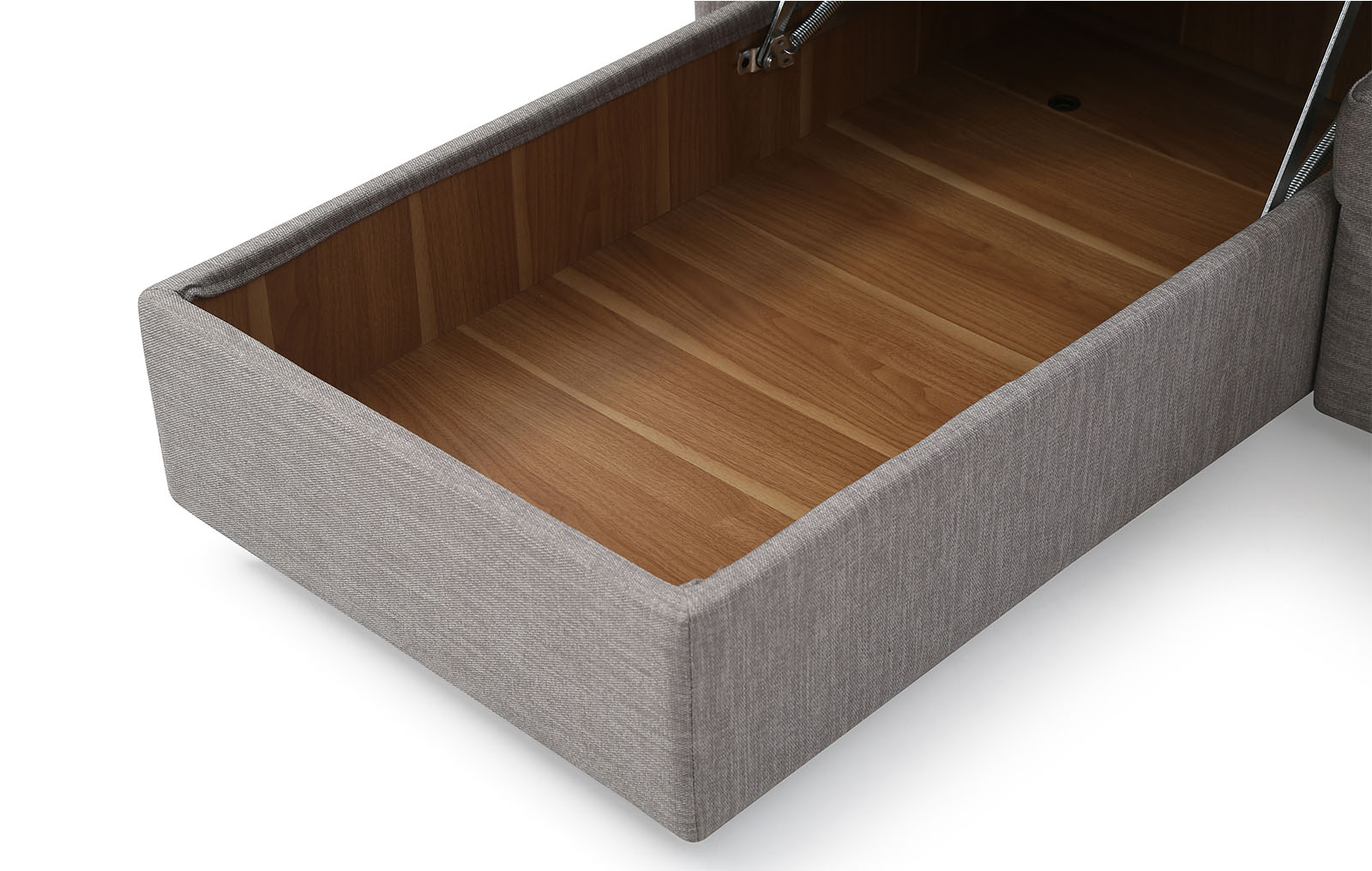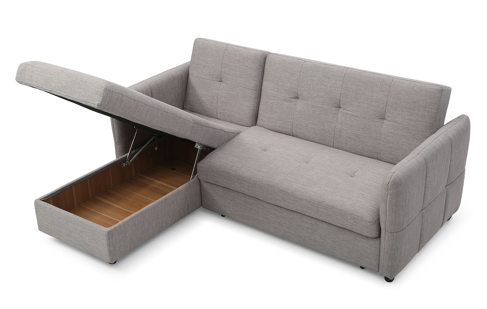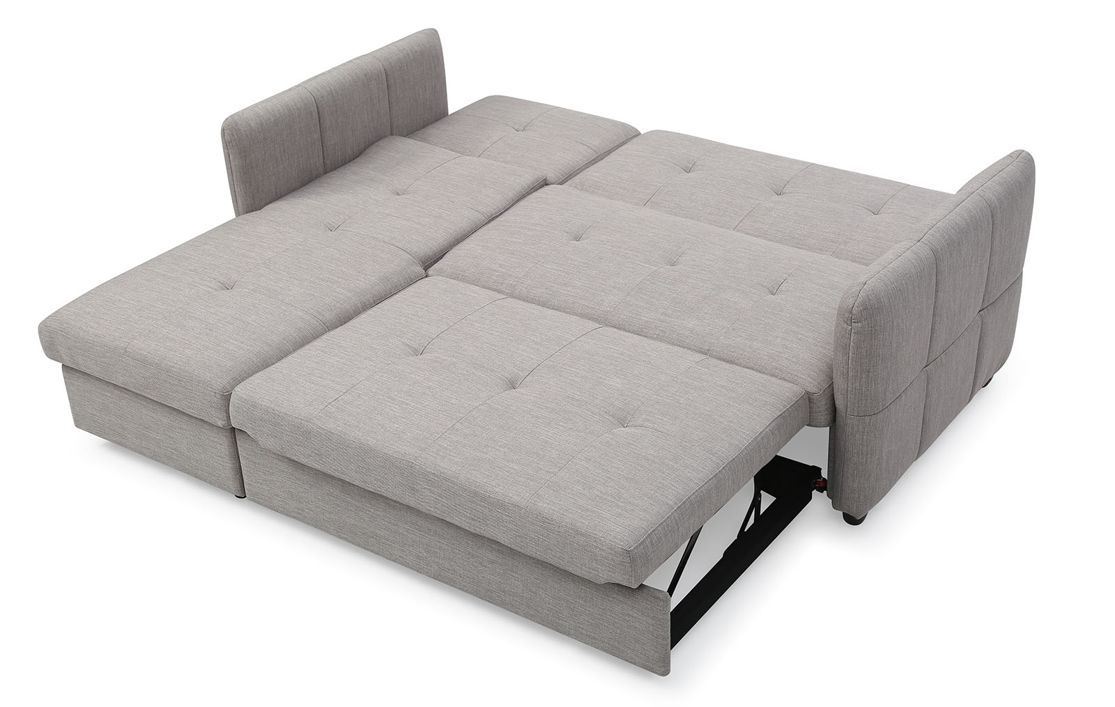 Раскладывается эта модель в просторную двуспальную кровать со спальным местом 180*180 см, под боковой секцией есть специальный ящик, в котором можно хранить различные вещи.